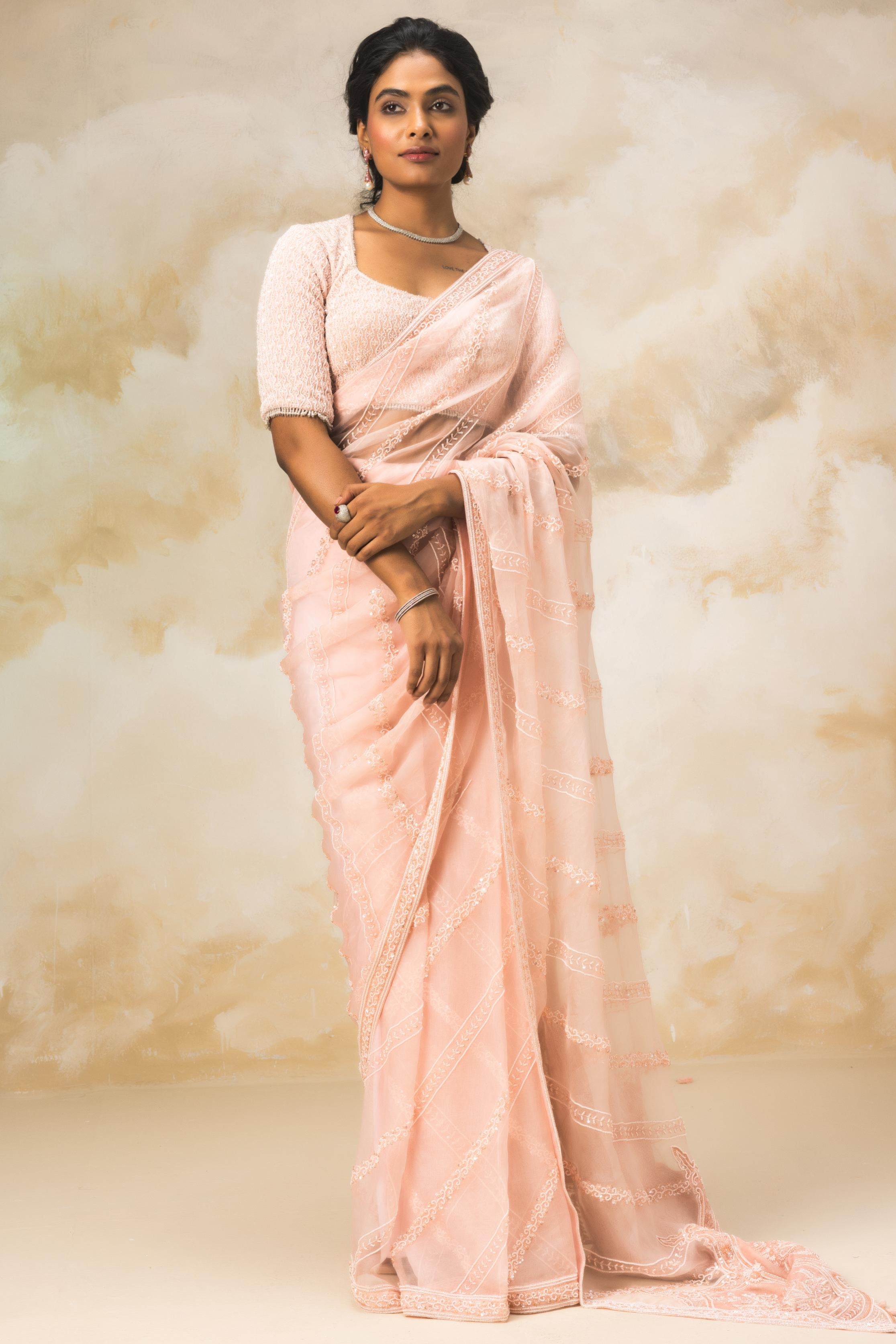 Peach embroidered tone on tone saree set