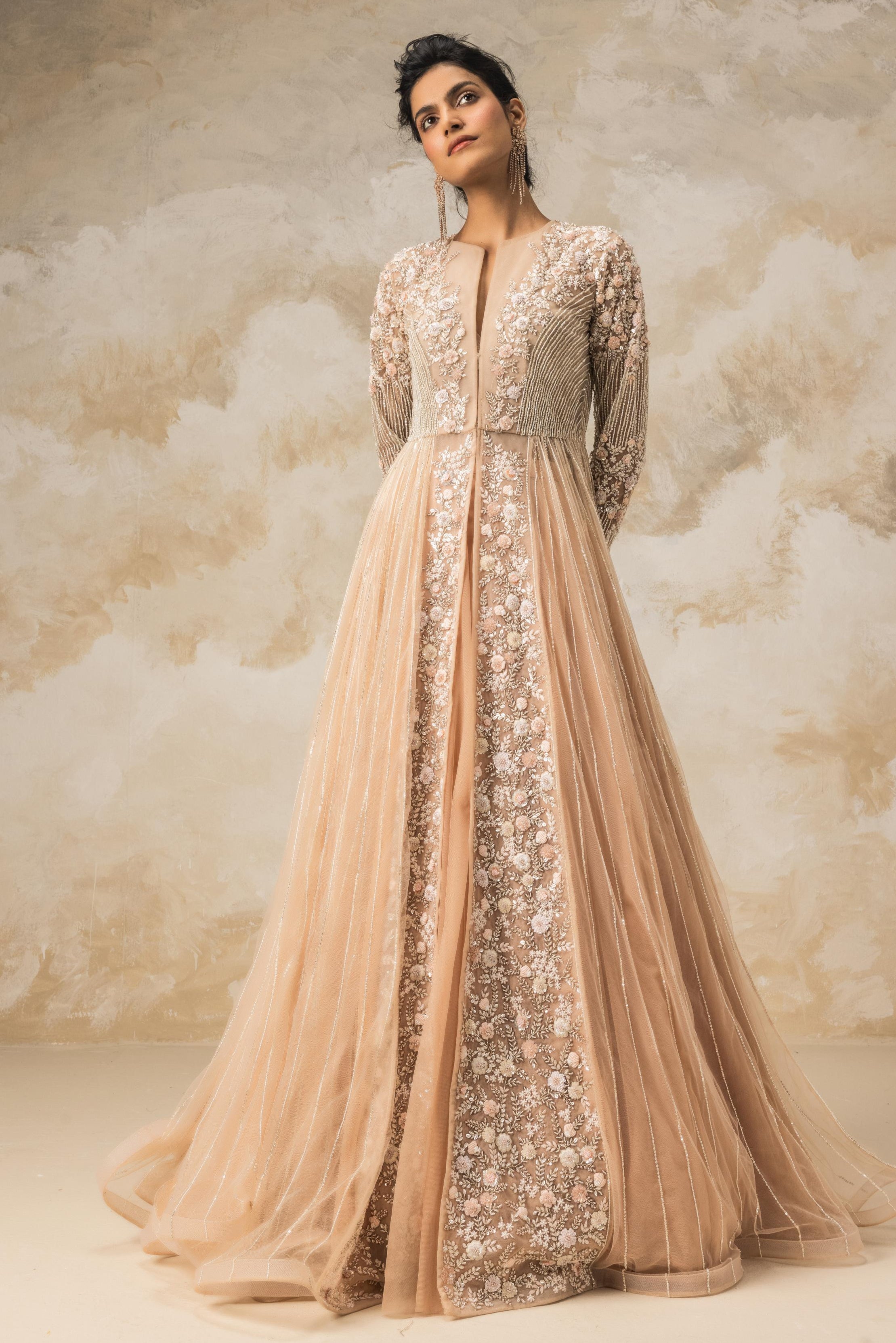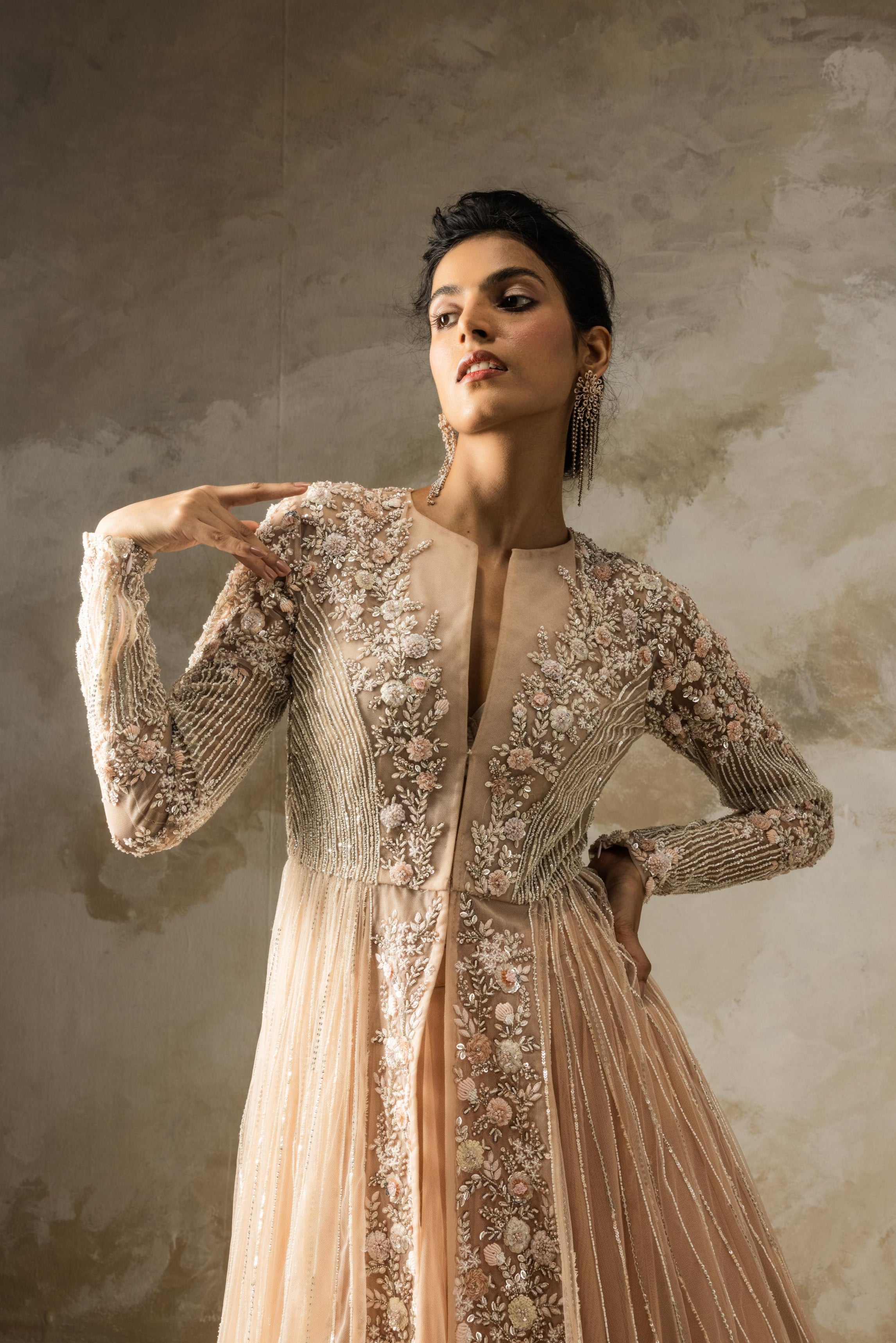 A captivating long gathered front-open jacket gown that effortlessly blends elegance and drama. The gown features a flared net skirt, adding volume and grace, while the plain bustier offers a sleek and refined look. Perfect for formal occasions, this ensemble combines modern structure with delicate flair, creating a stunning silhouette that is both bold and timeless.
