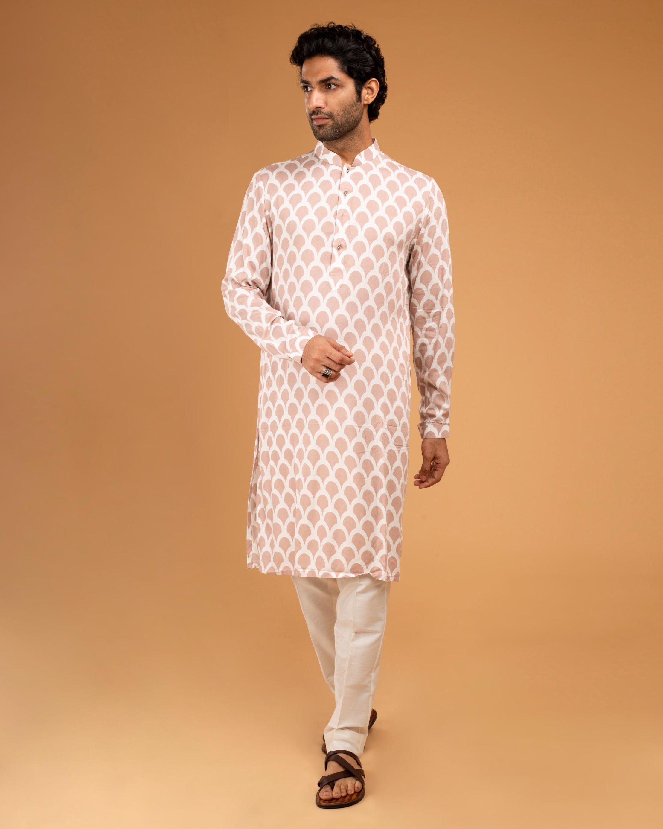 Delicate and dignified, the Peach Ojis Kurta Set is a breath of fresh elegance. Rendered in a soothing peach hue, this ensemble features subtle detailing that enhances its classic silhouette. The kurta, paired with coordinated bottoms, offers both comfort and charm—ideal for daytime festivities, mehendi functions, or intimate celebrations. With its lightweight feel and timeless appeal, the Peach Ojis Kurta Set is perfect for the modern man who values simplicity wrapped in refined tradition.