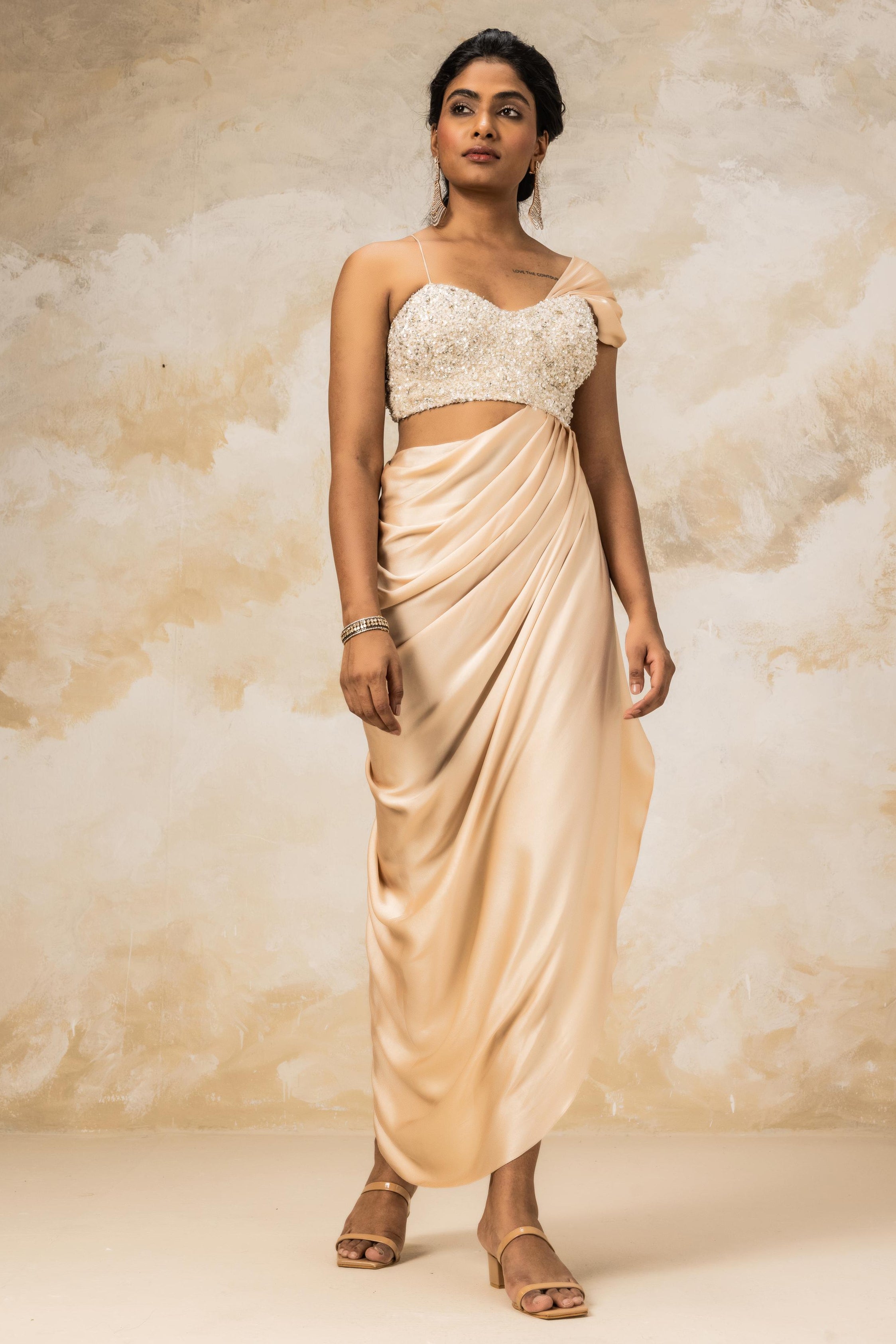 This one-shoulder satin drape dress is the epitome of sophistication. Featuring a beautifully draped satin silhouette, it is paired with a corset blouse adorned with exquisite crystal embellishments. The combination of luxurious fabric and sparkling details creates a breathtaking look, perfect for upscale events and evening affairs, offering a modern yet timelessly glamorous aesthetic.