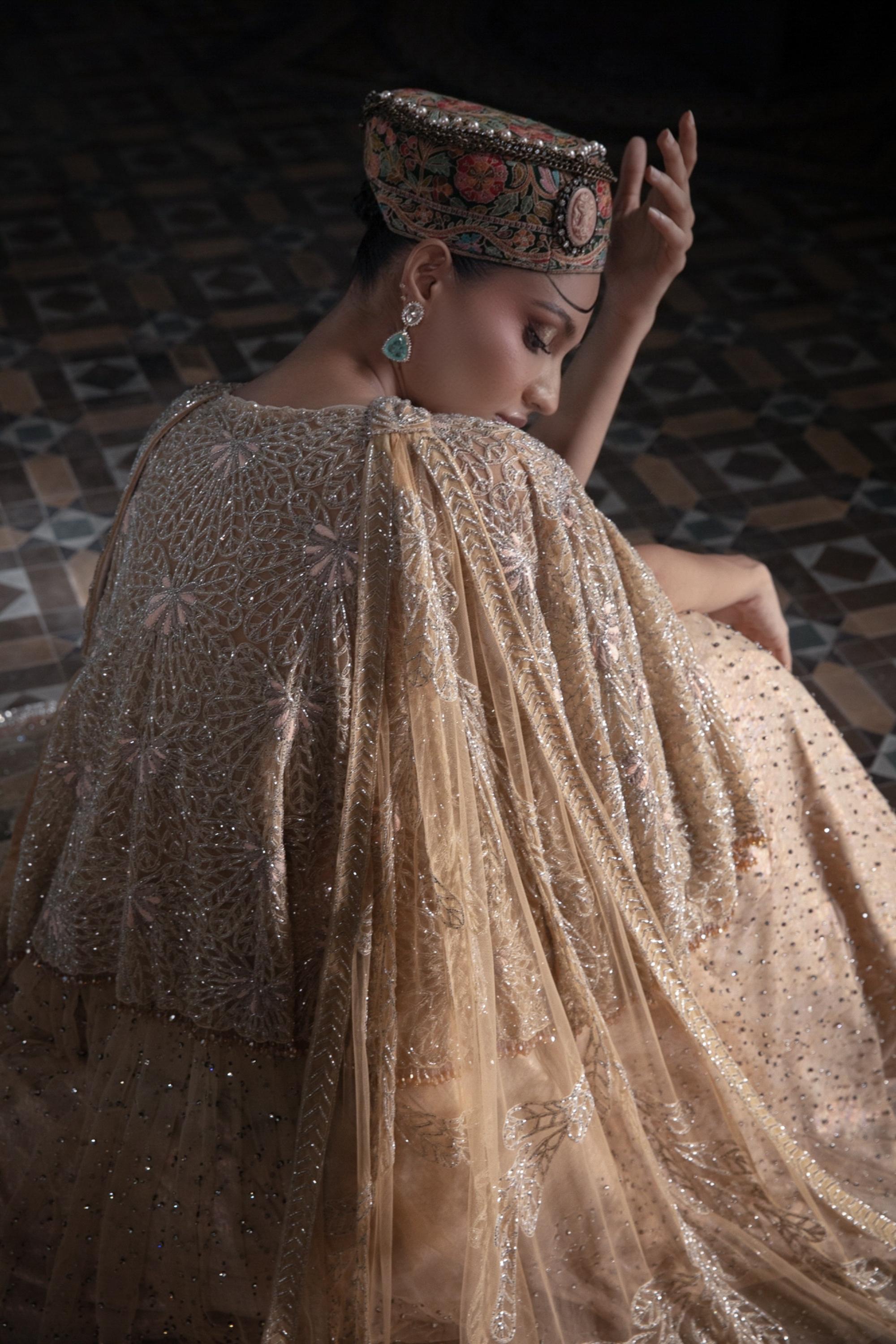 Ethereal and romantic, the Peach Oraan Lehenga Set with Cape is designed for modern-day dreamers. The soft peach hue complements every skin tone, while the lightweight cape adds effortless drama to the flowing lehenga. Subtle embroidery and delicate textures create a look that is equal parts serene and statement-making. Ideal for day weddings, haldi functions, or elegant festive soirées. Pair with minimal jewellery and a dewy glow to let the ensemble shine.
