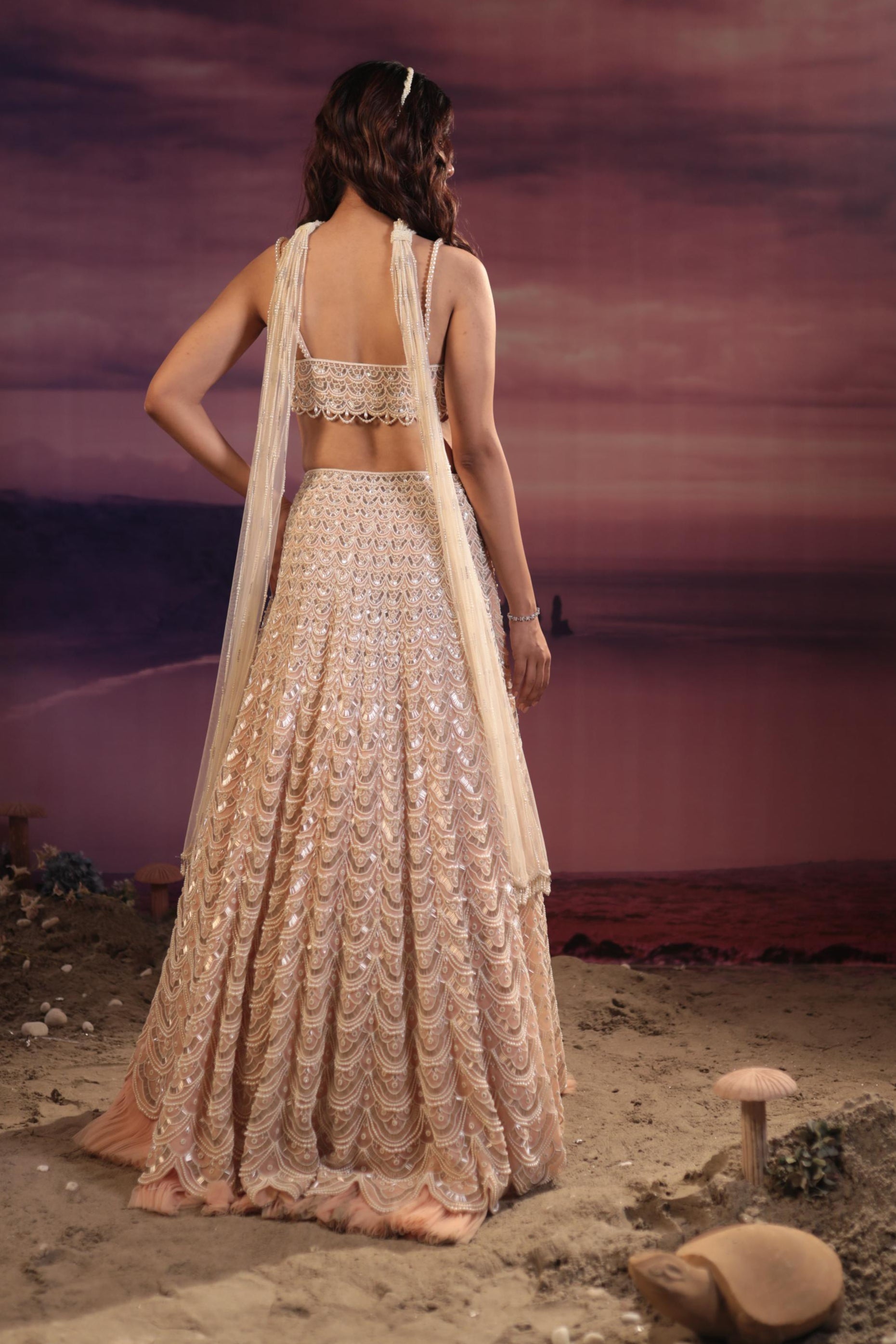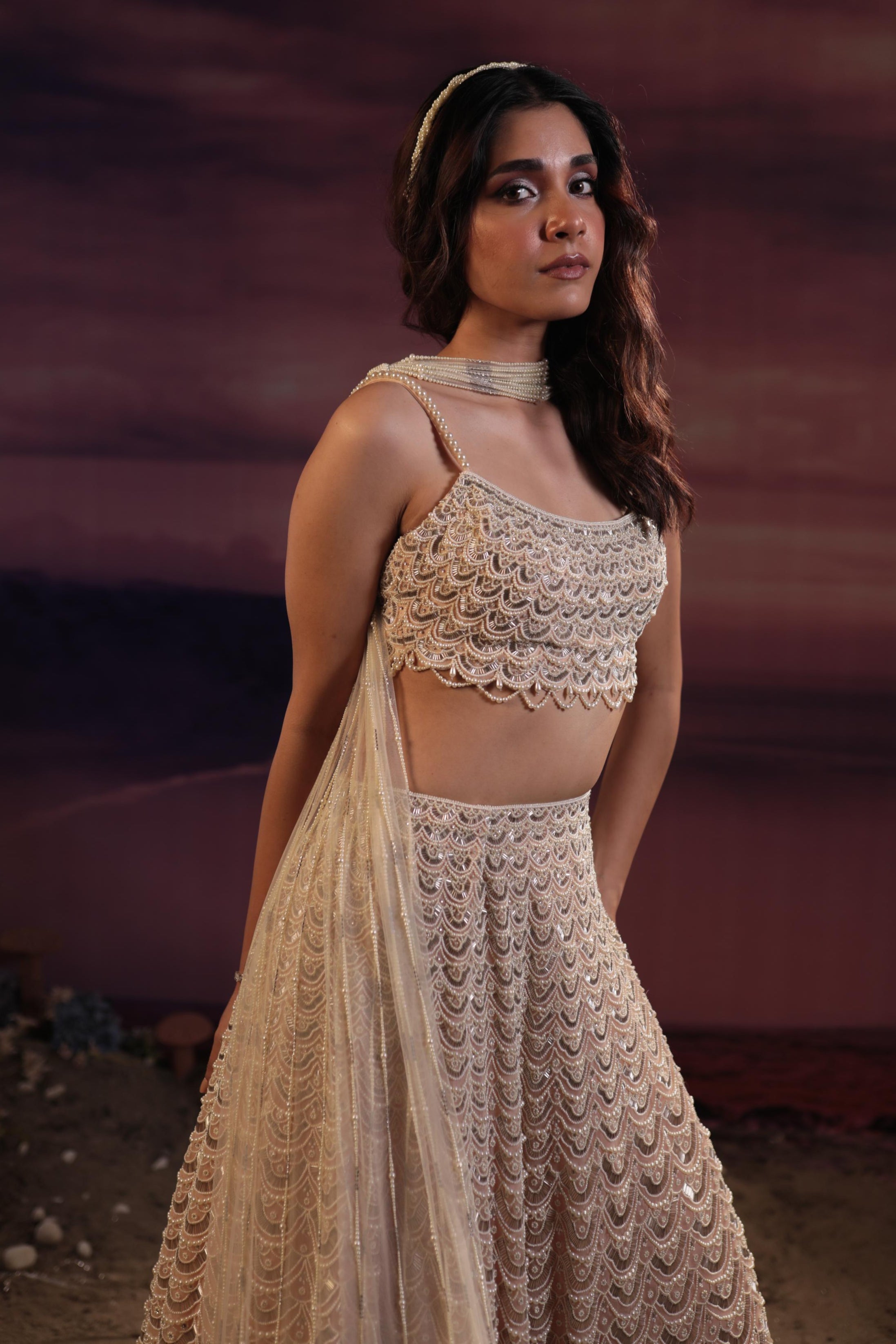 Exude timeless elegance with this stunning outfit featuring a blouse adorned with scalloped moti work all over. The lehenga complements the look beautifully, while a triangular-shaped net dupatta with pearl-engraved lines adds a touch of sophistication. Perfect for weddings, receptions, or festive celebrations.
