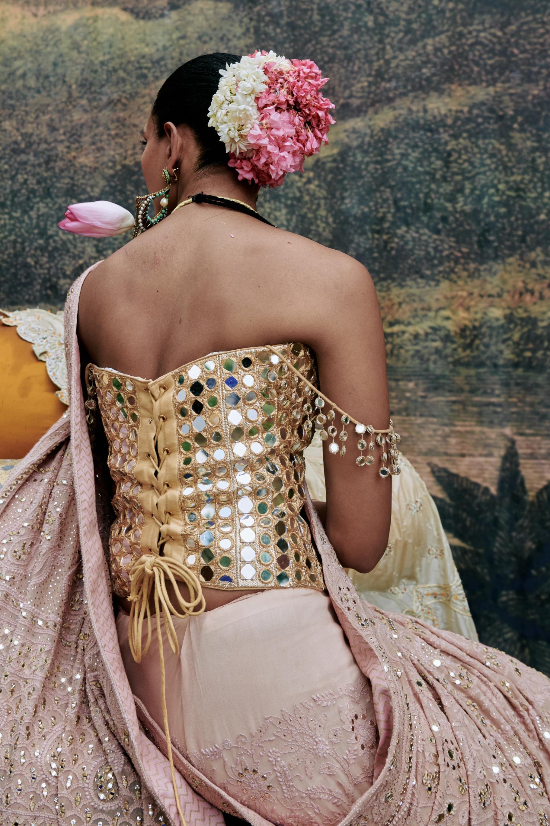 This pink Lucknowi saree features intricate hand embroidery beautifully enhanced with long mirror tassels adorning the border and pallu. Paired with a stunning mirror work corset blouse on gota lined with luxurious chanderi silk this ensemble exudes elegance and contemporary charm perfect for weddings and festive celebrations.