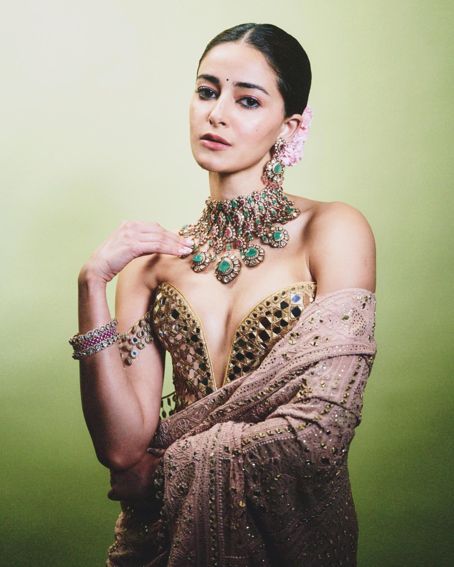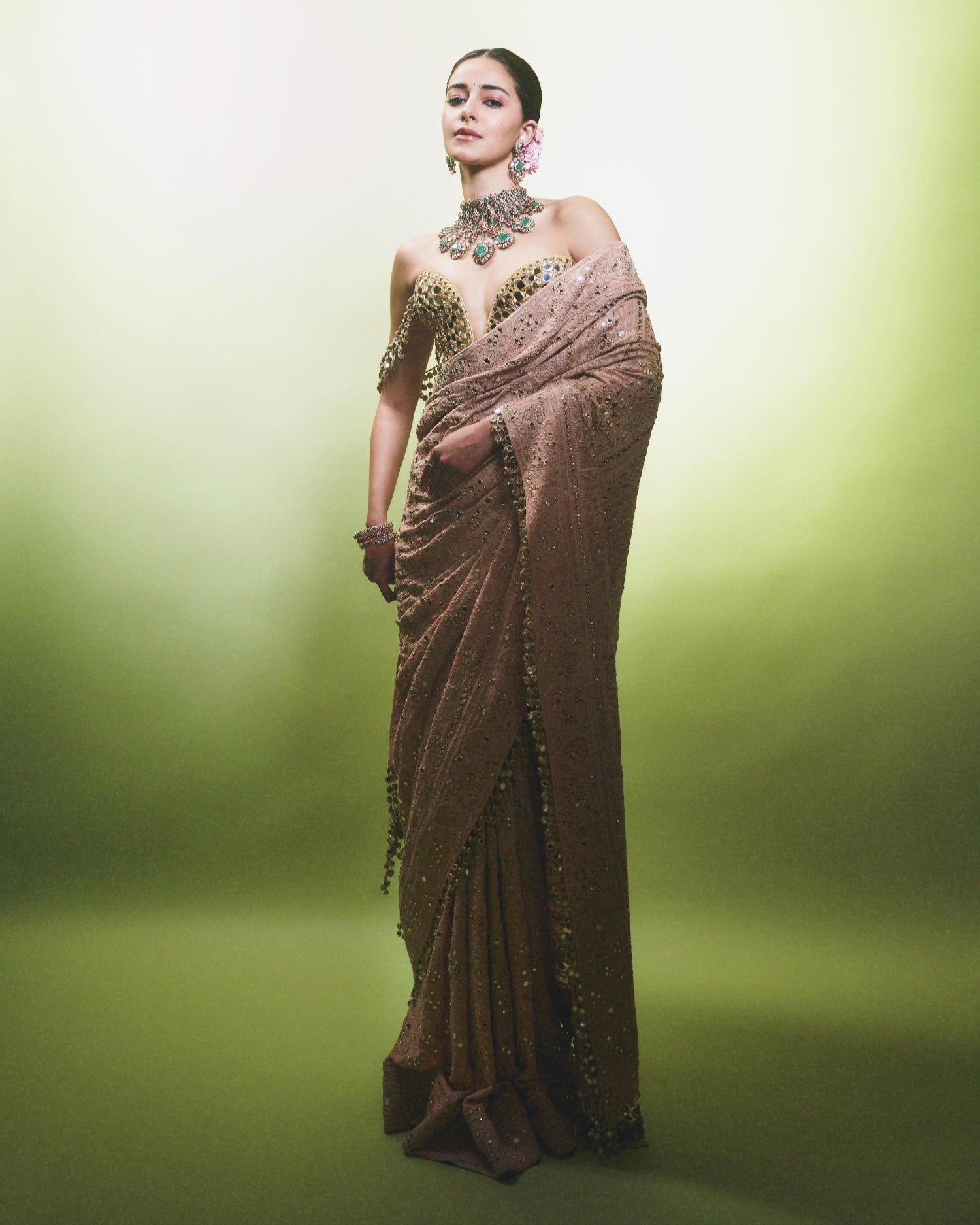 This pink Lucknowi saree features intricate hand embroidery, beautifully enhanced with long mirror tassels adorning the border and pallu. Paired with a stunning mirror work corset blouse on gota, lined with luxurious chanderi silk, this ensemble exudes elegance and contemporary charm, perfect for weddings and festive celebrations.