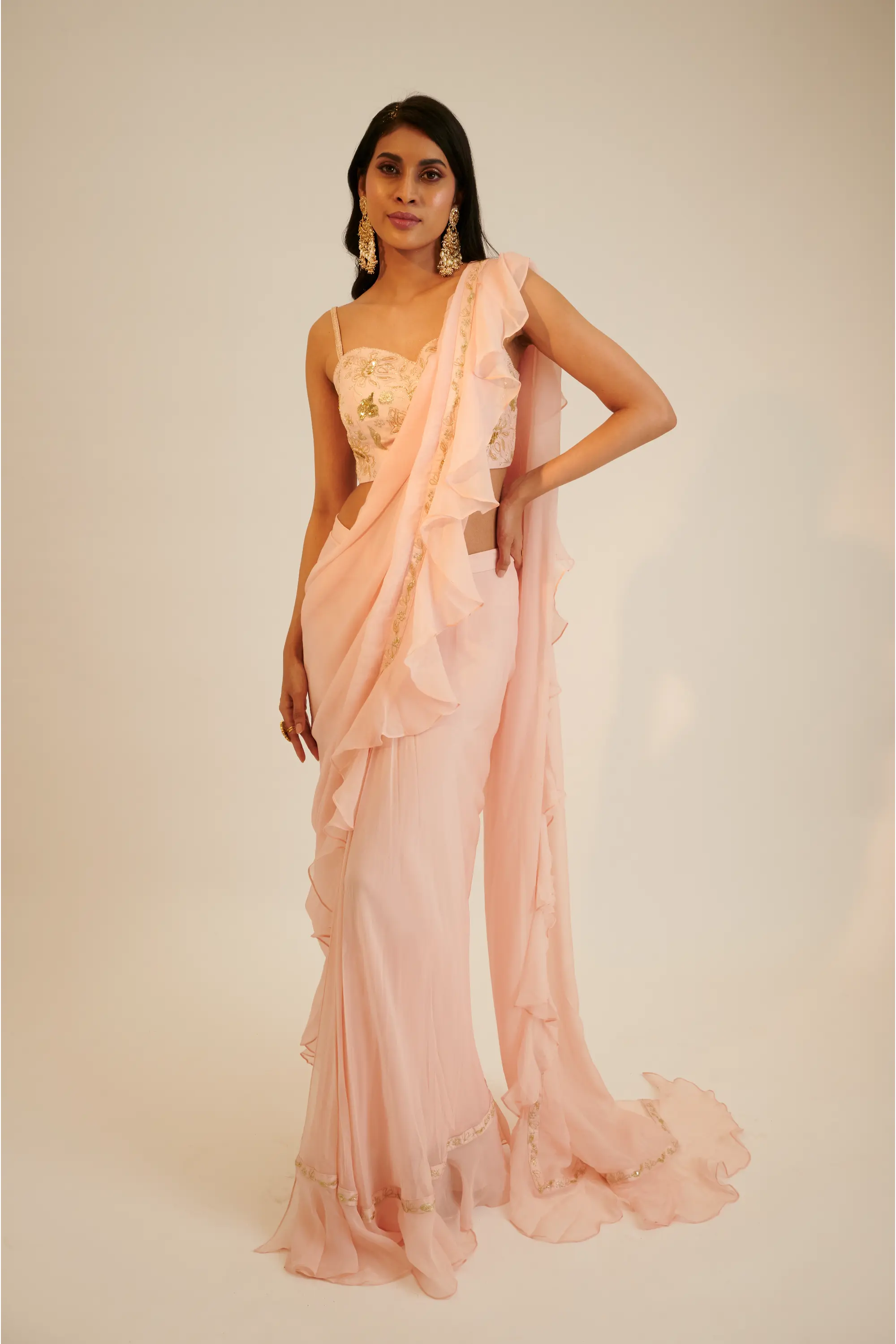 Elevate your wardrobe with our enchanting peach pre-draped organza saree, a perfect fusion of sophistication and ease. This exquisite saree features lightweight organza fabric that drapes beautifully, allowing for effortless movement and grace. The delicate embroidery on the accompanying blouse adds a touch of intricate detail, enhancing the overall elegance of the ensemble. Ideal for weddings, parties, or special occasions, this saree offers a modern twist on a timeless classic. Embrace the beauty of this versatile outfit that combines tradition with contemporary style, making you the center of attention wherever you go.