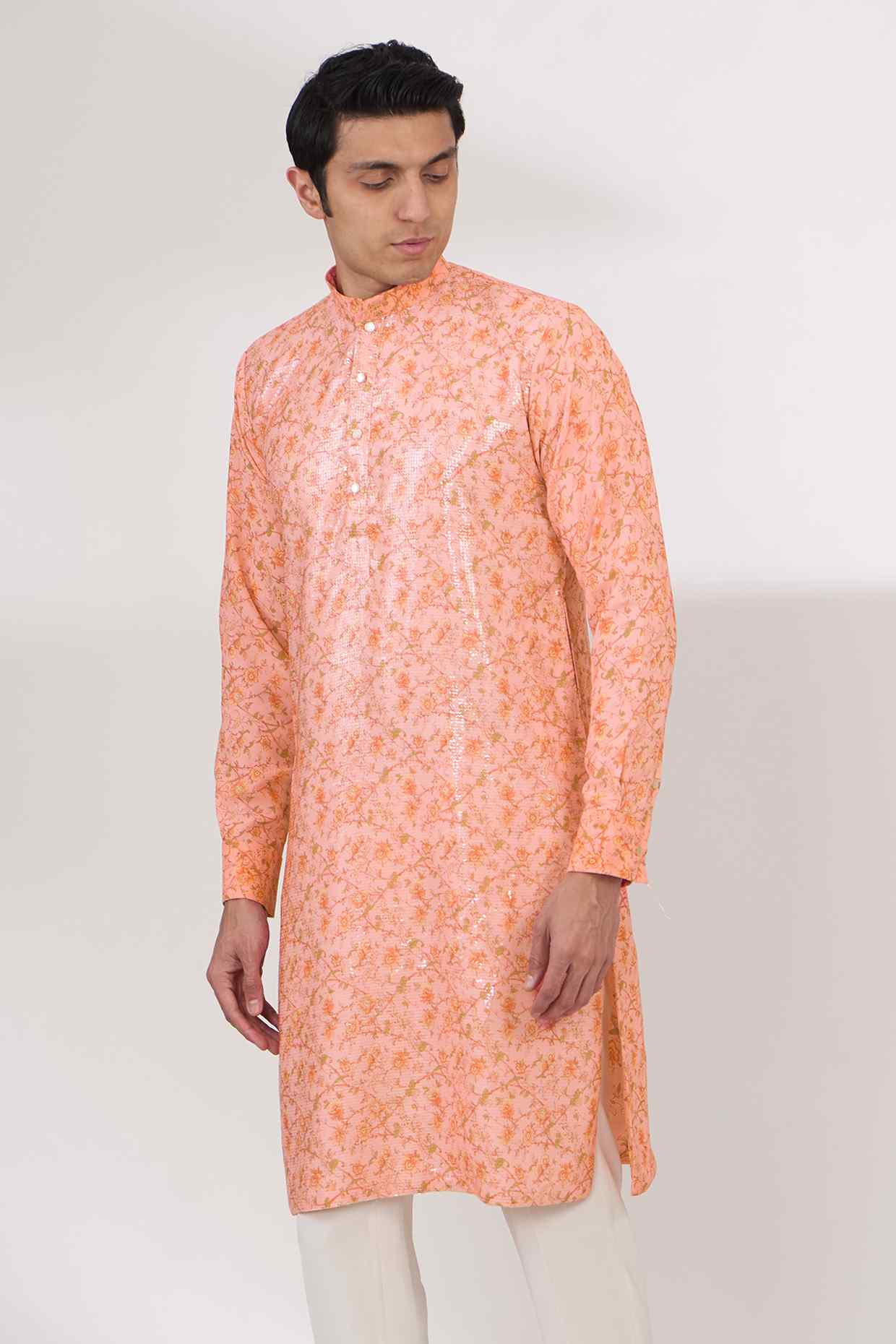Refresh your wardrobe with our peach kurta and pant set, featuring a beautifully designed kurta in a soft peach hue. Crafted from a blend of sheeting and georgette, with a smooth crepe lining, the kurta offers both elegance and comfort.
