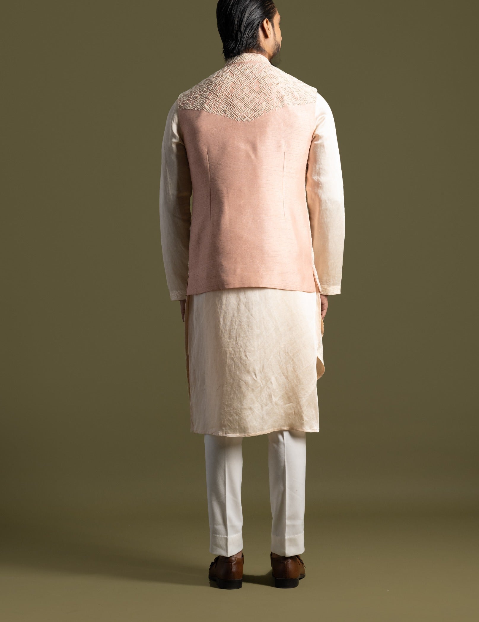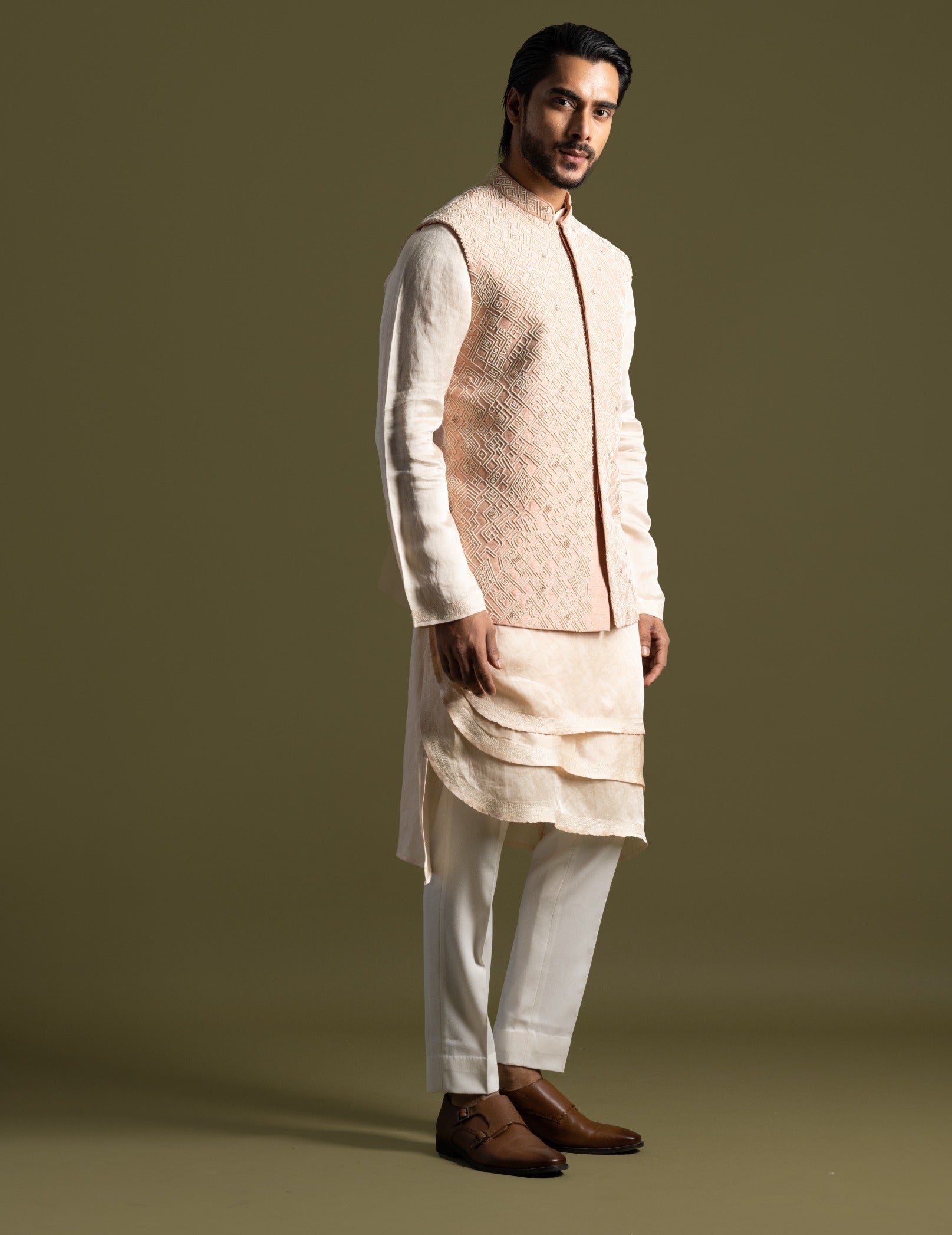 Enhance your formal attire with our peach silk Nehru jacket, featuring intricate geometric chirwork detailing that adds a sophisticated texture and visual appeal. This refined jacket is paired with a light peach triple-layered kurta and pant set, creating a seamless and elegant ensemble. Perfect for special occasions and upscale events, this outfit combines luxurious fabric with detailed craftsmanship for a timeless and stylish look.