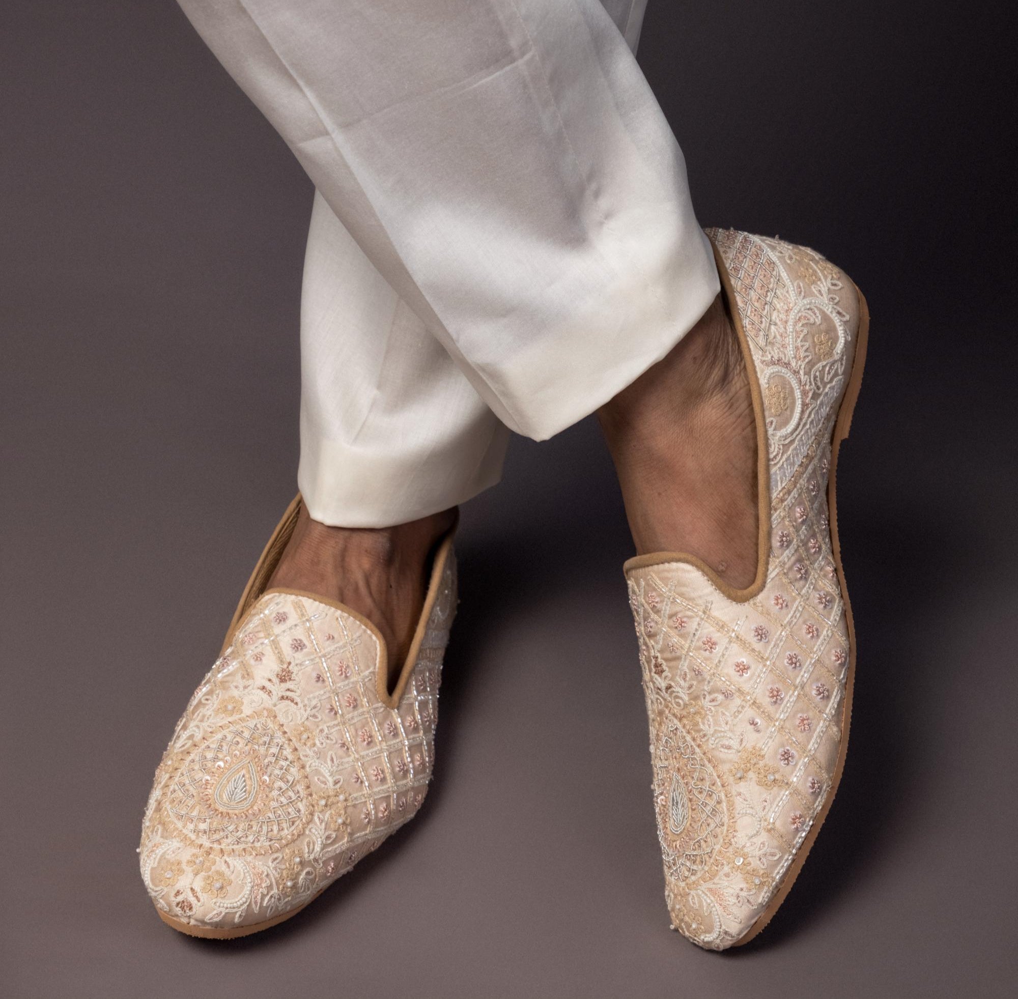 Experience regal elegance with our Peach Sultan's Glide Linen Satin Jutti, meticulously handcrafted with intricate threadwork and delicate Moti embellishments. A seamless fusion of tradition and contemporary sophistication, this exquisite pair is perfect for weddings, festive occasions, and refined celebrations. Step into luxury and elevate your ensemble with this timeless masterpiece of heritage craftsmanship.
