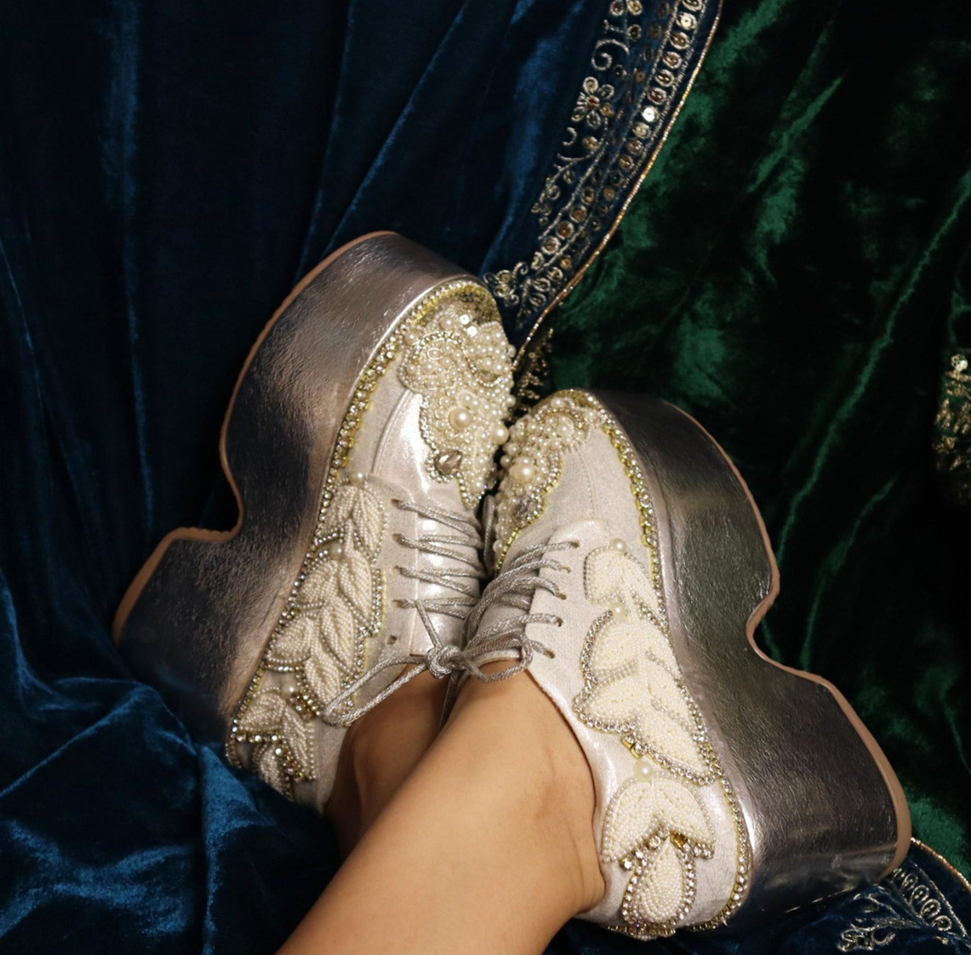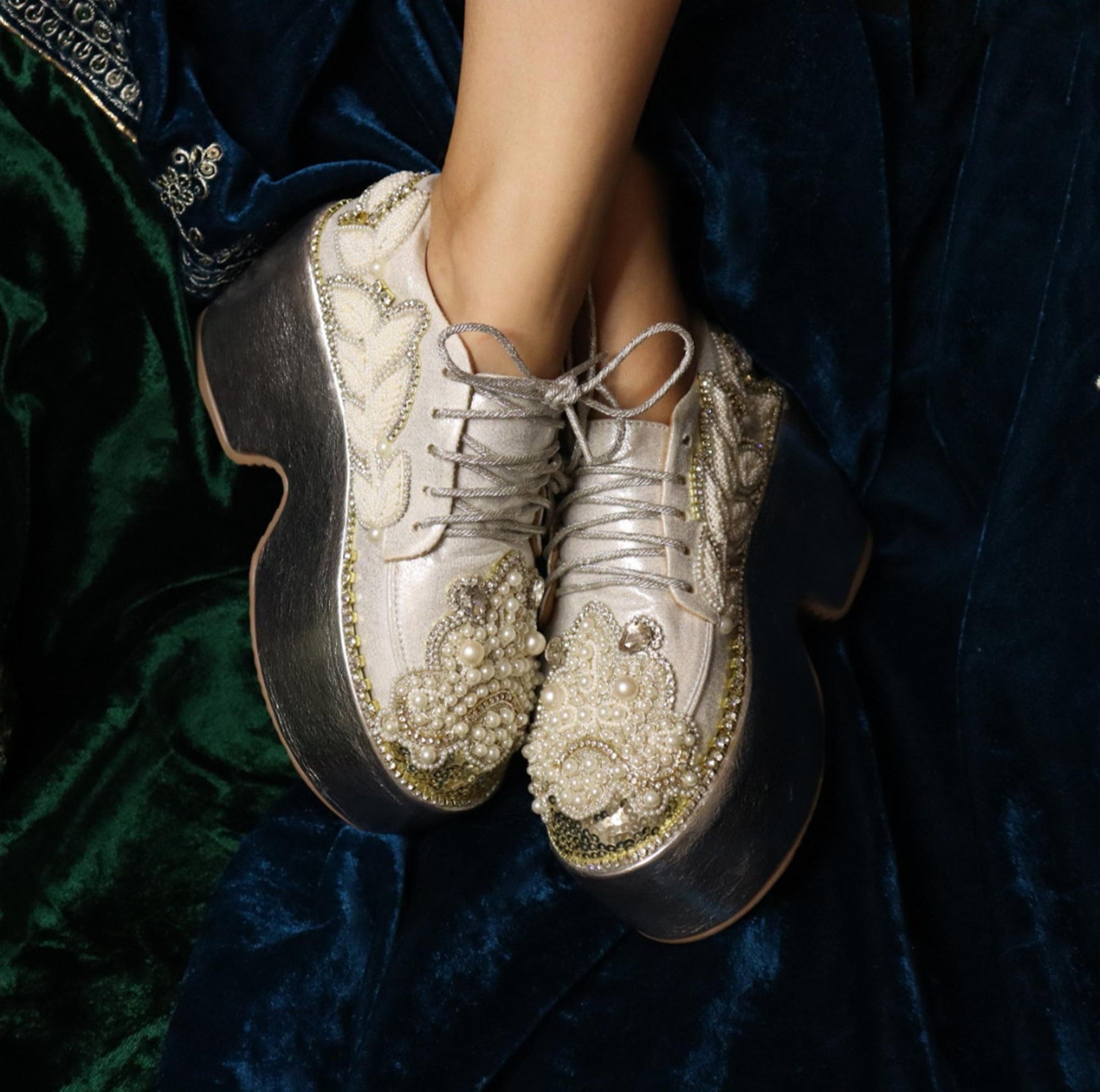 Elevate your bridal look with these exquisite wedding sneakers, a masterpiece of pearl bead embroidery. Featuring a regal crown design adorned with shimmering pearls and dazzling stones, these silver sneakers radiate opulence. Delicate floral and leaf motifs on the sides add a touch of timeless elegance, while plush memory foam insoles ensure all-night comfort with every step.