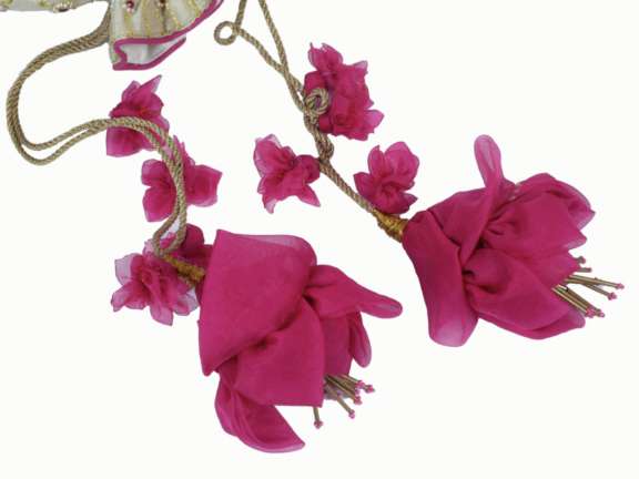 This elegant potli clutch features delicately arranged pearl and pink stone flowers in a diagonal checkered pattern, enhanced by a zari lace neckline for a regal touch. The intricate embroidery combines moti, zari, and stone work, creating a rich and luxurious look. The signature handcrafted flower tassels, a unique USP of the brand, add a finishing touche perfect for weddings, festive occasions, and special celebrations.