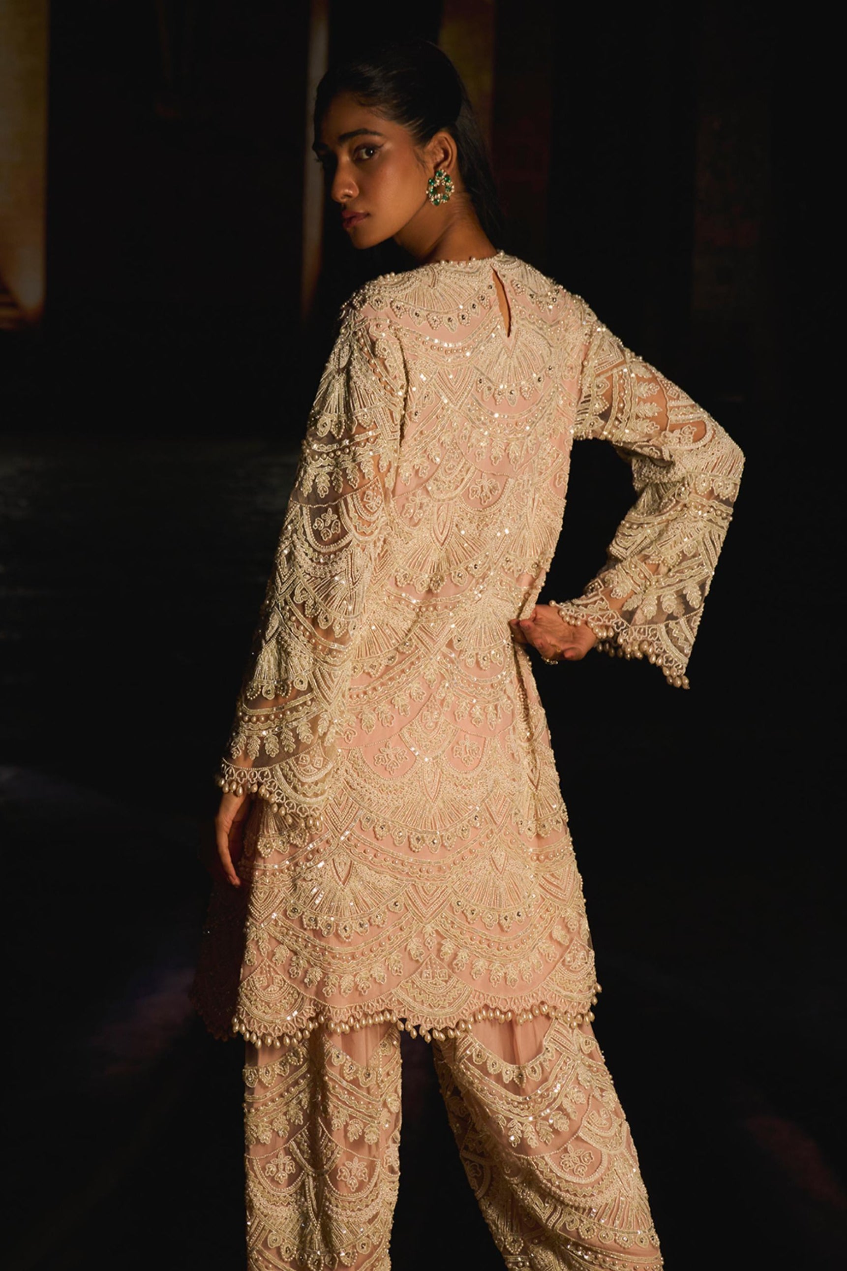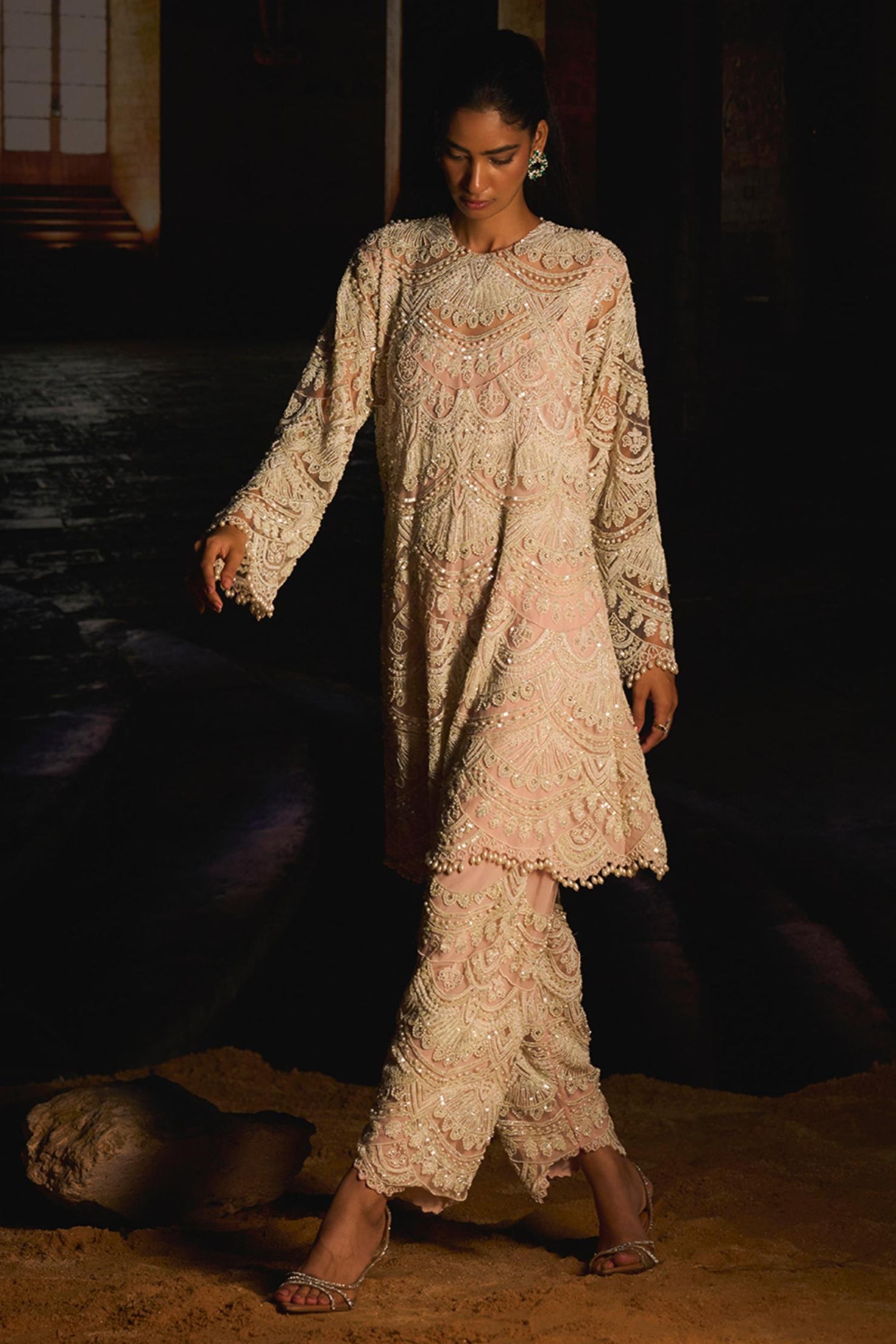 Exude grace with this exquisite suit set, featuring a pearl and cutdana embroidered shirt paired with an intricately embroidered salwar. The look is completed with a delicate organza dupatta, adorned with scalloped embroidery. Perfect for weddings and festive celebrations, this ensemble radiates sophistication and charm.