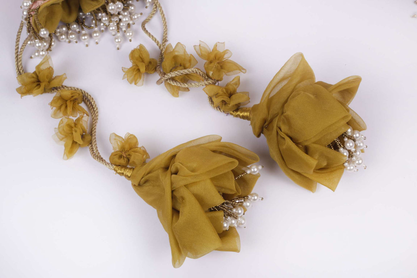 This regal potli clutch is designed to replicate the grandeur of a Maharani Haar, with intricate Kundan work forming a luxurious neckline effect. Embellished with pearls and cut dana embroidery, it exudes opulence and elegance. The signature handcrafted flower tassels, a unique USP of the brand, complete this statement accessory perfect for weddings, festive occasions, and royal celebrations.