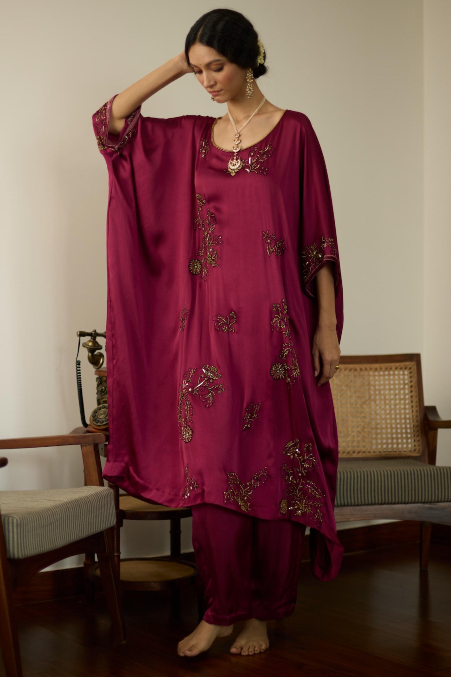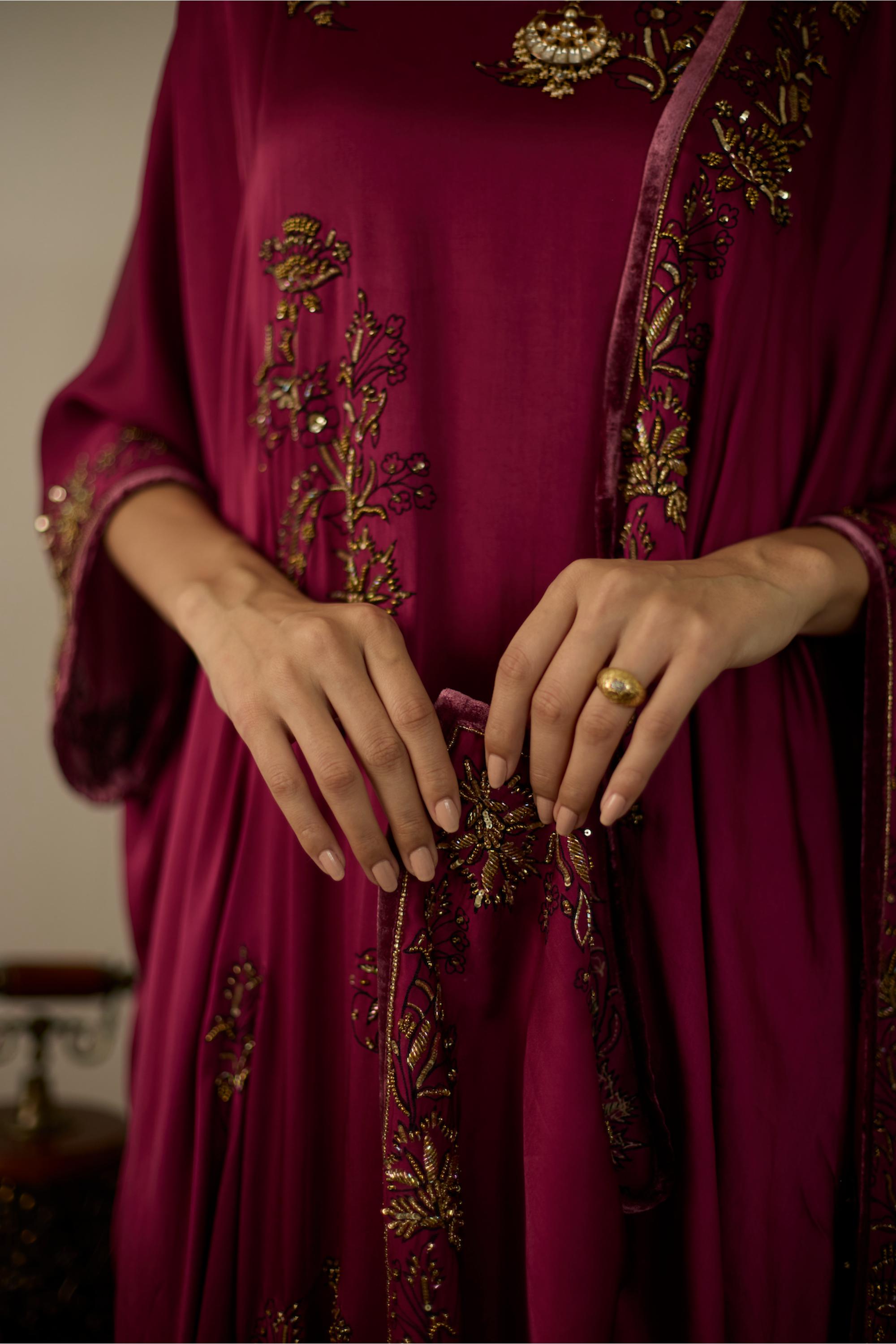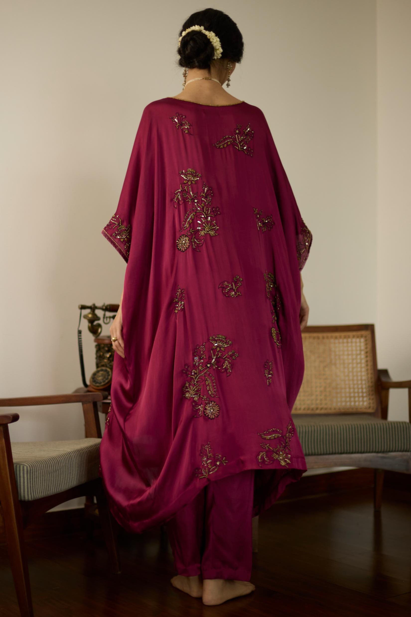 Exude grace and sophistication in the Pink Aarohi Hand-Embroidered Kaftan Set. With delicate embroidery and a flowing silhouette, this ensemble is perfect for festive celebrations, resort wear, and special occasions.