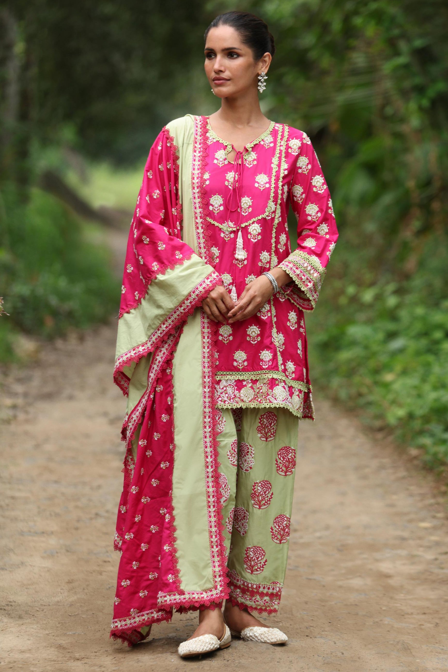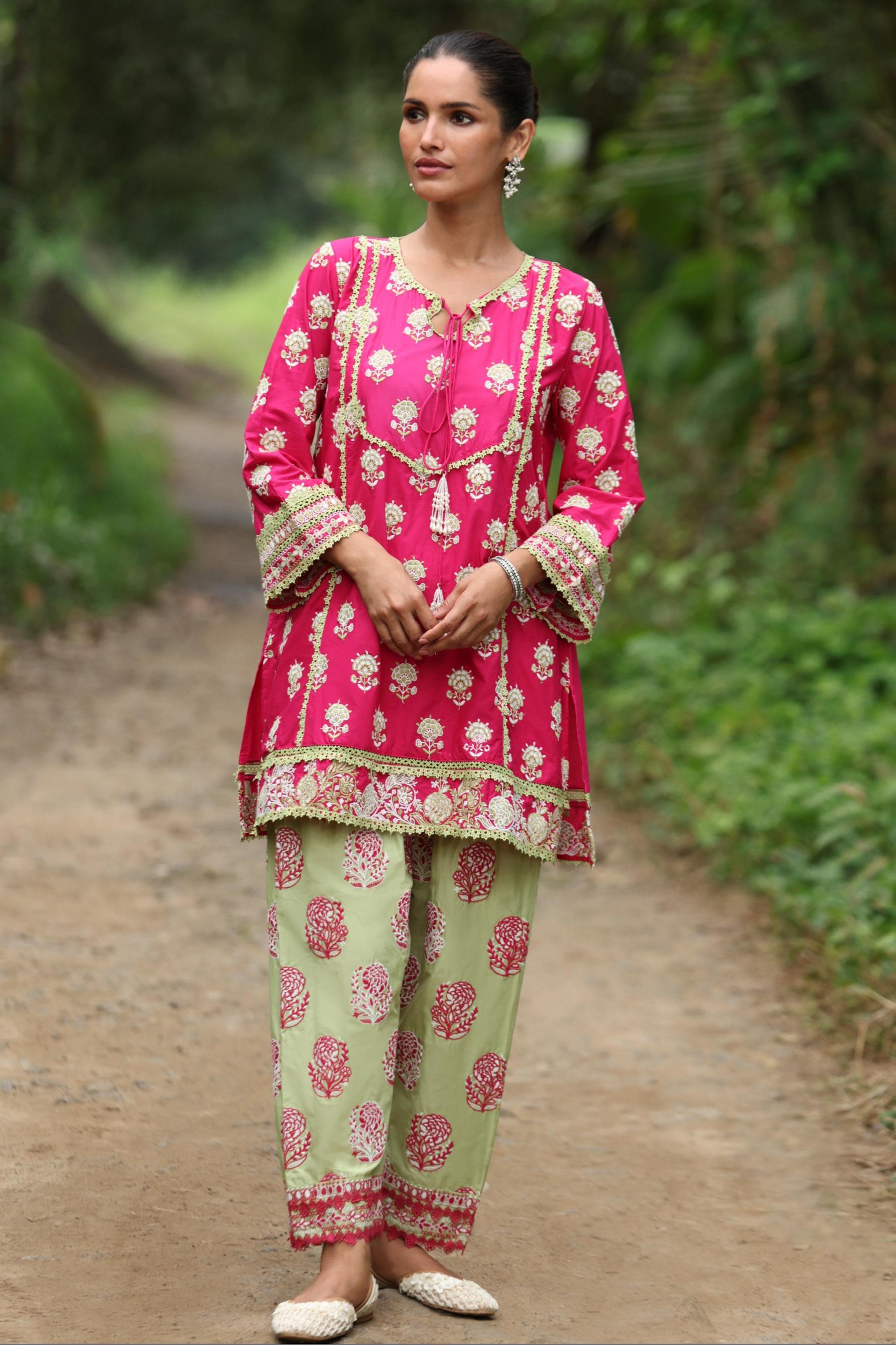 The Pink Alagi Malgudi Days Kurta Set is a graceful ensemble that captures the nostalgic charm of old-world India with a refreshing, modern twist. Drenched in a soft pink hue, the kurta features delicate patterns and thoughtful detailing inspired by the simplicity and warmth of "Malgudi Days." Paired with coordinated bottoms, the set offers a relaxed silhouette that balances comfort with elegance. Ideal for daytime festivities, cultural outings, or casual gatherings, this set brings together heritage storytelling and contemporary style. A beautiful choice for those who appreciate tradition woven into everyday fashion.