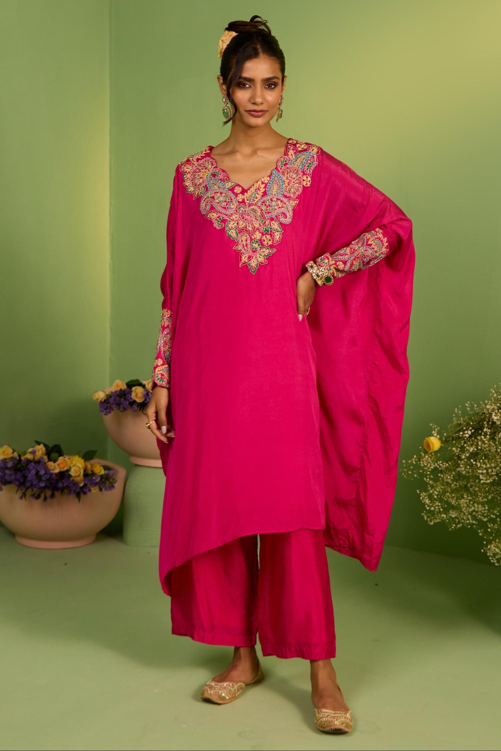 Soft, fluid, and effortlessly refined—the Pink Bahaar Elora Kaftan Set is designed for serene celebrations and slow, elegant moments. Crafted in a delicate blush pink hue, the kaftan features subtle embroidery and a flowing silhouette that flatters every body type. Paired with coordinated bottoms, it offers both comfort and charm, making it perfect for haldi ceremonies, festive brunches, or destination weddings. The Pink Bahaar Elora Kaftan Set is for the woman who embodies quiet luxury and timeless beauty.