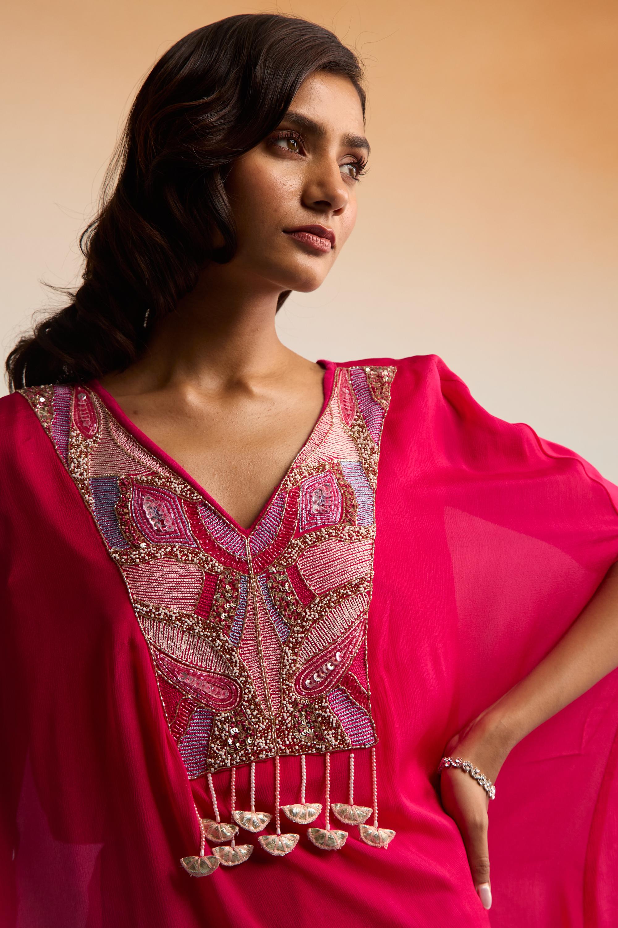 Delicate, airy, and effortlessly refined—the Pink Bahaar Florin Kaftan Set is the epitome of comfort-meets-elegance. Designed in a romantic blush pink, this flowy kaftan features subtle embroidery and artisanal detailing that add charm without overpowering the look. Paired with matching bottoms, it’s ideal for haldi and mehendi functions, festive lunches, or destination weddings. The Pink Bahaar Florin Kaftan Set is perfect for the modern woman who values grace, comfort, and timeless simplicity.