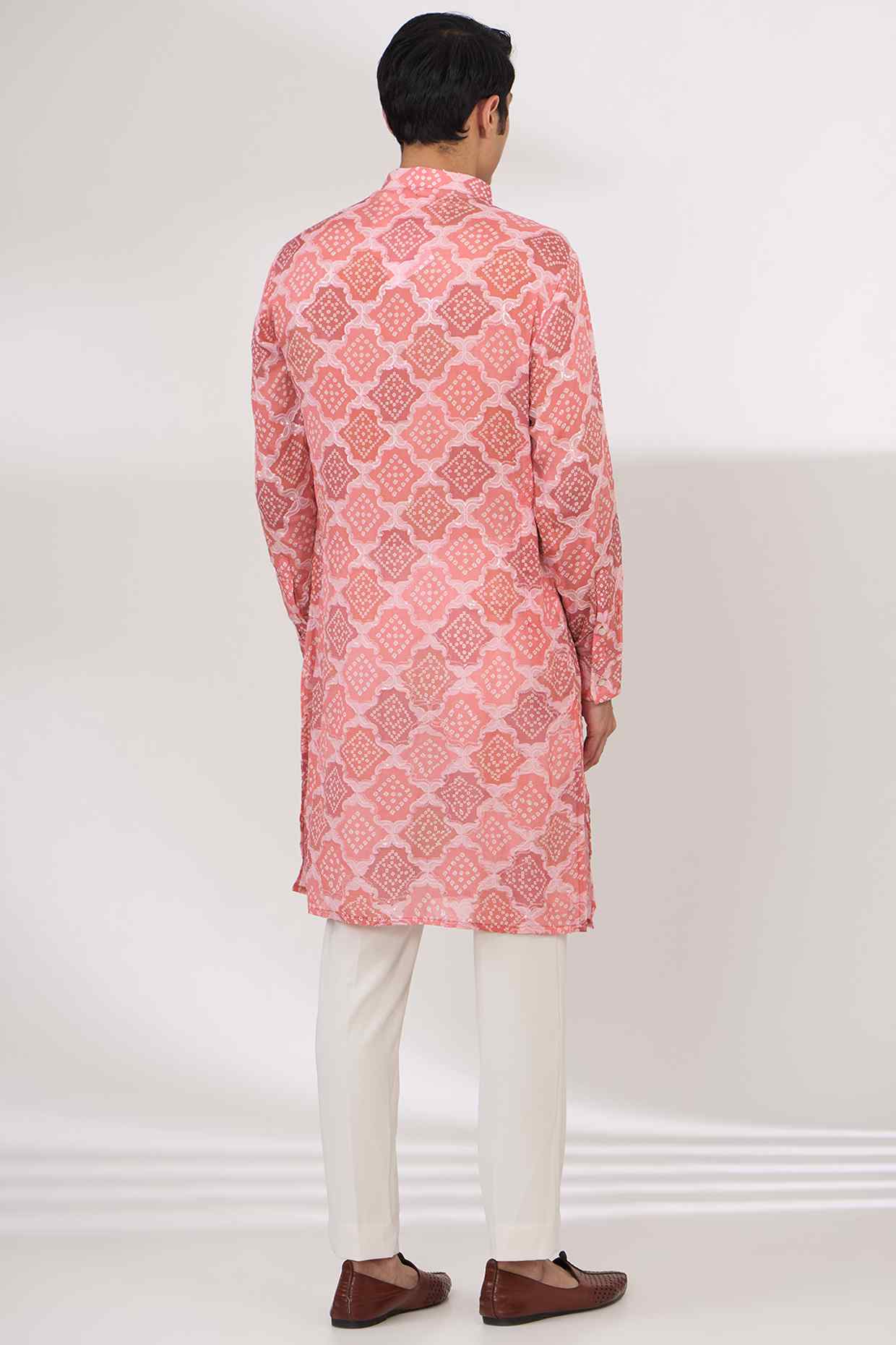 Embrace vibrant charm with our pink bandhini kurta and pant set. The kurta features a beautiful pink bandhini pattern, adorned with shimmering gold sequins that add a touch of elegance and sparkle. The unlined design ensures a light and airy drape, perfect for effortless style.