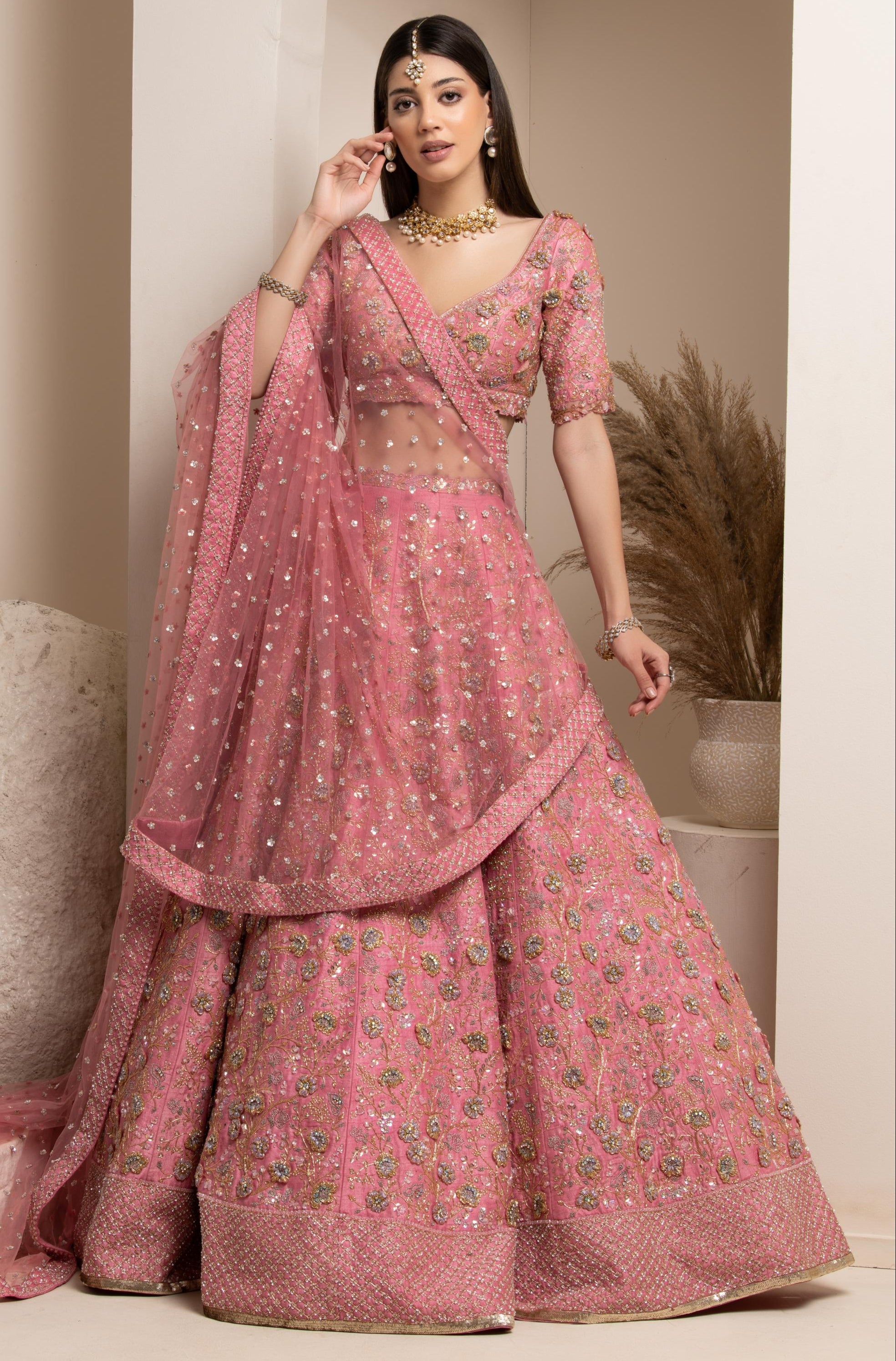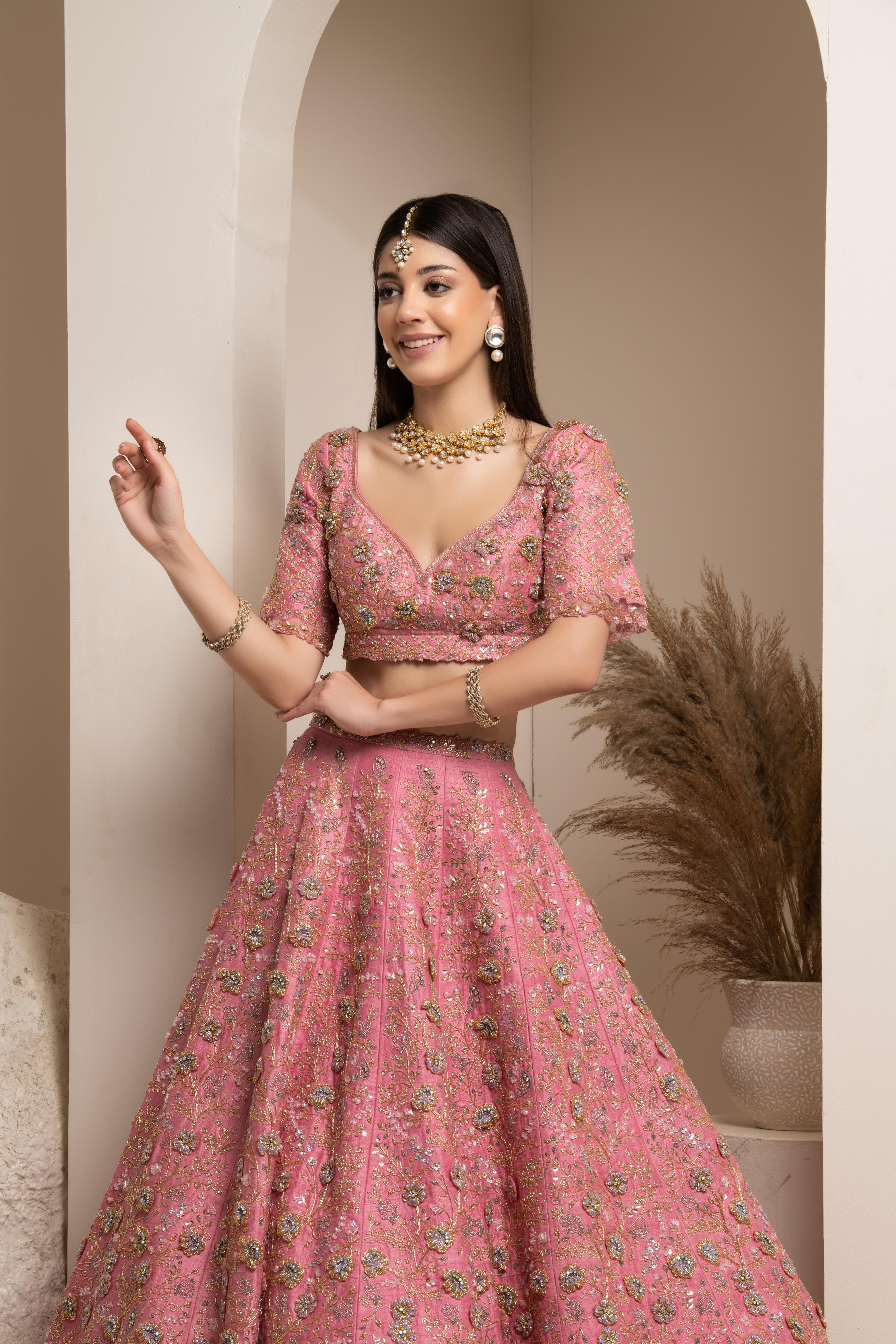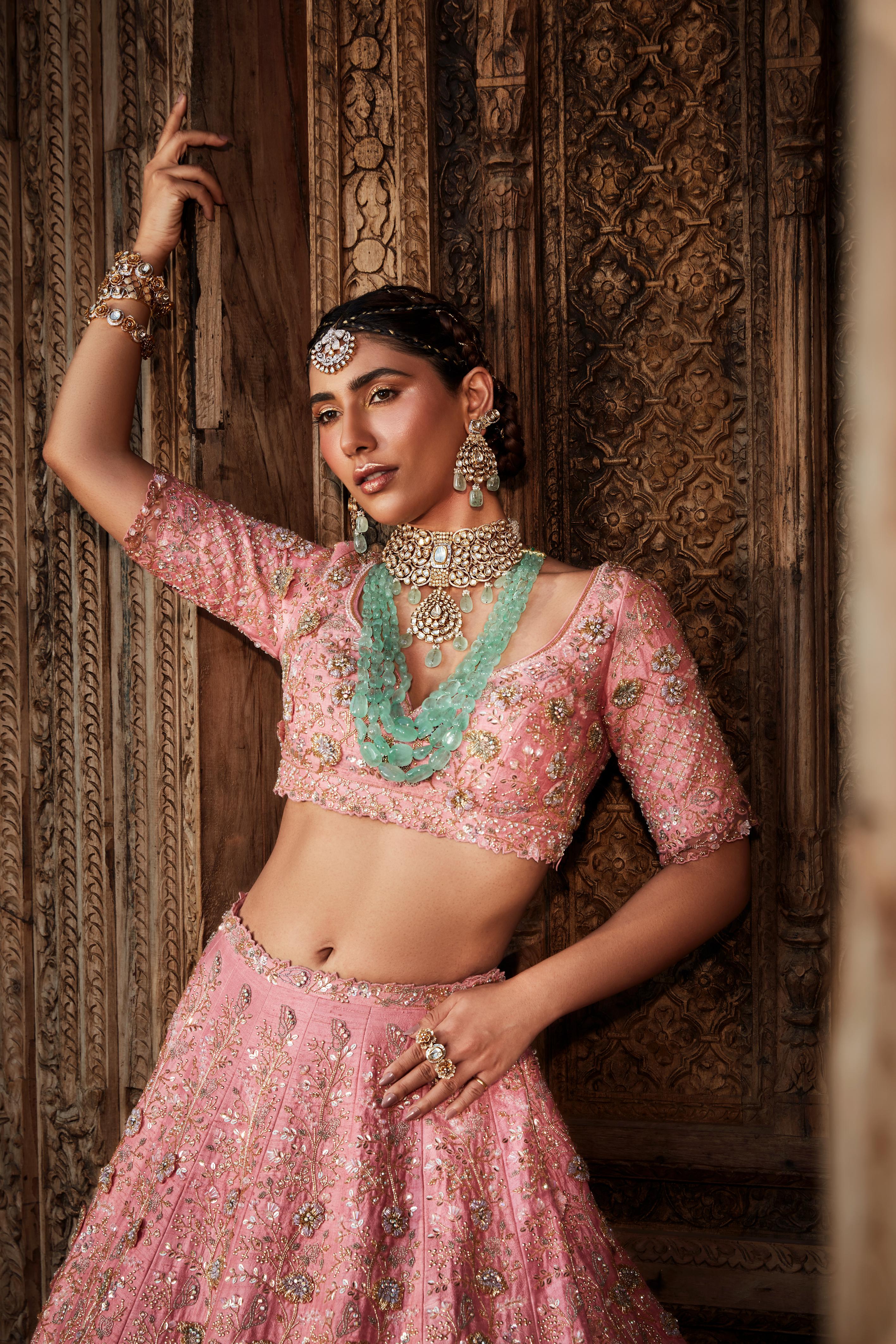 Components: 5 pieces (Lehenga, blouse, dupatta, belt, veil)