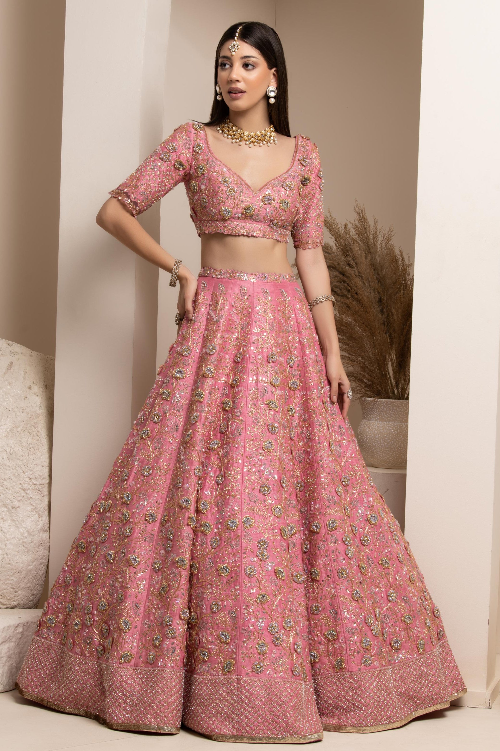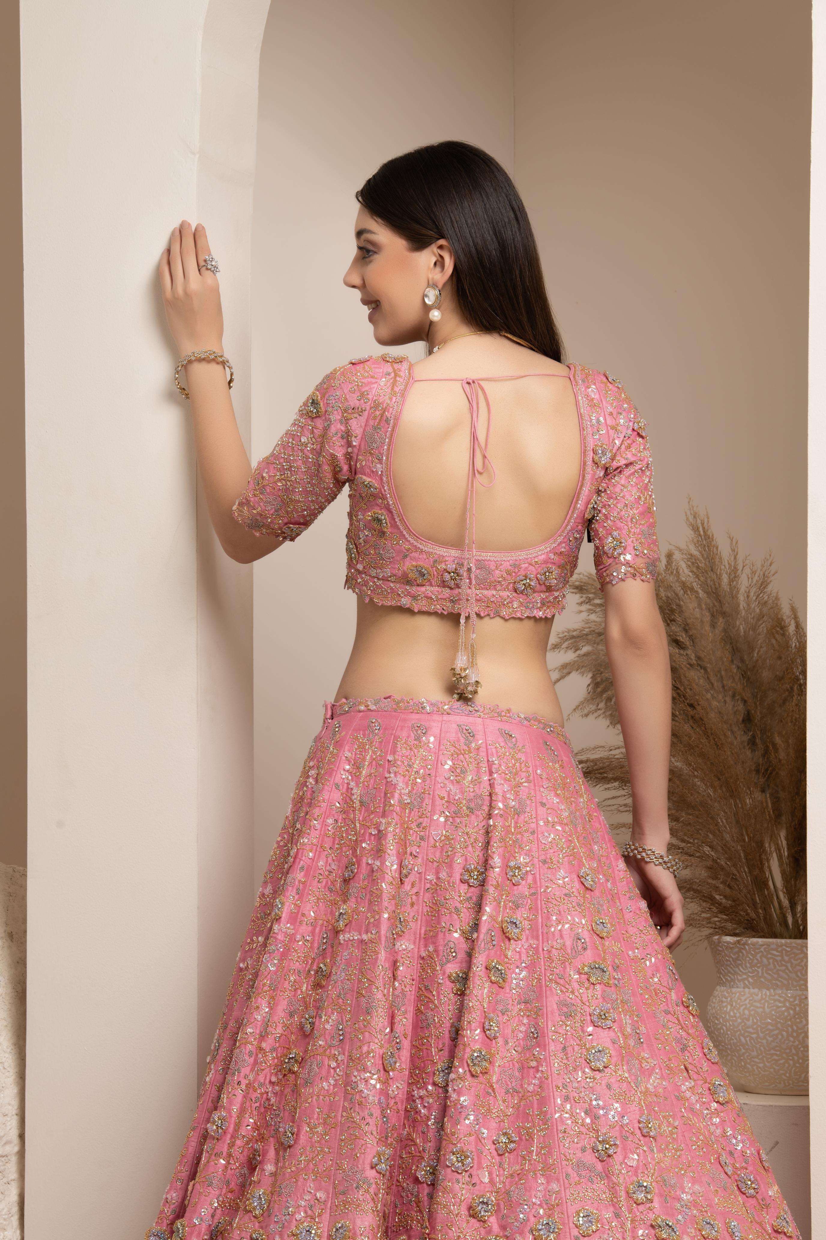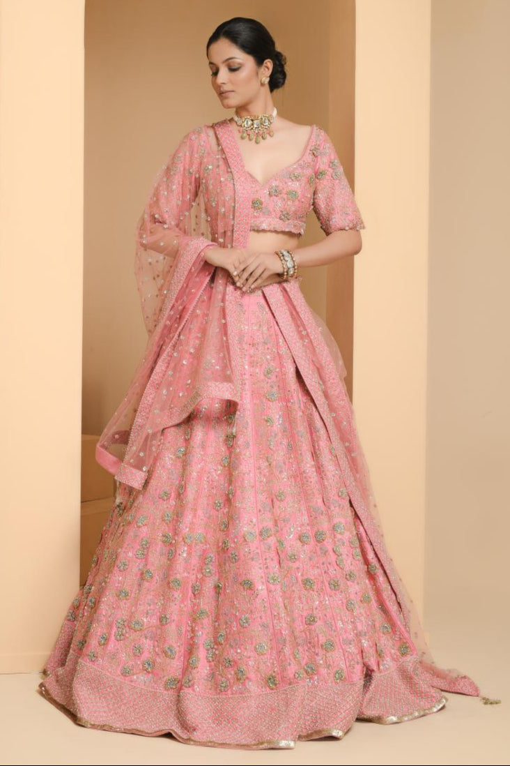 Components: 5 pieces (Lehenga, blouse, dupatta, belt, veil)