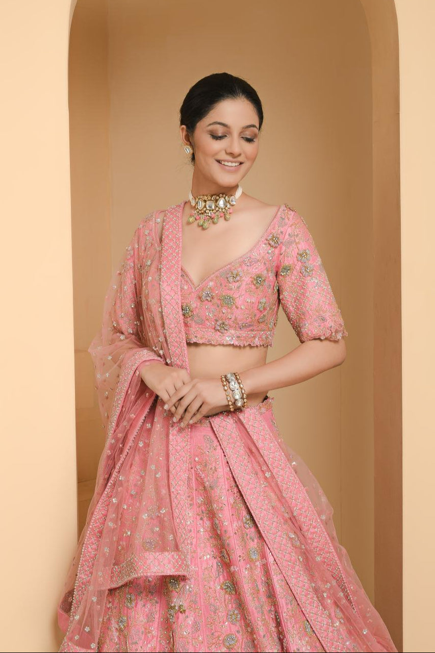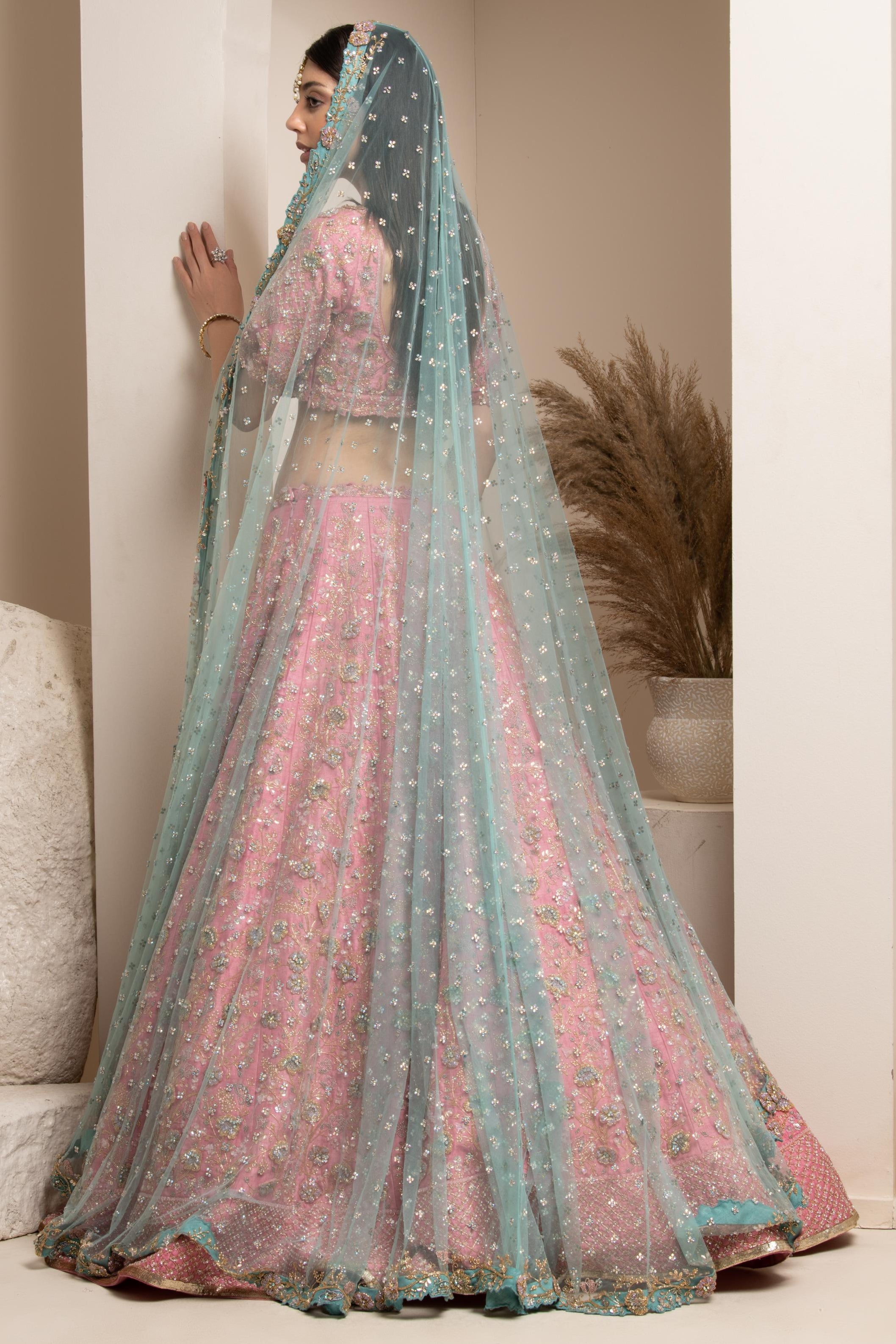 The Summer Pink set is entirely hand-embroidered with stunning 3D floral motifs in contrasting purples, blues, greens, and golds. The blouse features a sweetheart neckline with tulle, edged sleeves and intricate cutwork detailing. The set includes two ornate dupattas: a full-sized one to drape over the shoulder and a contrasting sea blue veil to adorn the head. Both can be neatly fastened at the waist with the embroidered waist belt.