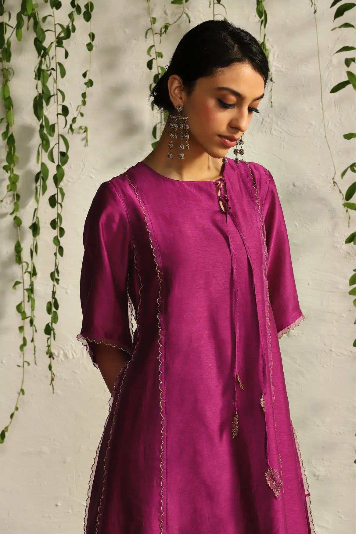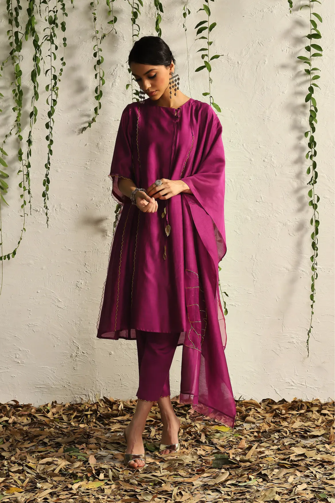 Step into elegance with our Pink Chanderi Tie-Up Kurta Set, a delightful blend of contemporary style and traditional charm. Crafted from luxurious Chanderi fabric, this kurta features a soft pink hue that adds a touch of femininity, making it perfect for festive occasions and casual outings alike. The unique tie-up detail enhances the silhouette, allowing for a customizable fit while providing an eye-catching focal point. Paired with coordinating bottoms, this set offers versatility and sophistication for any event.