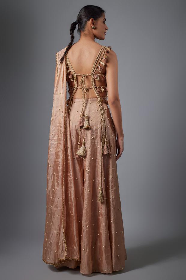 The Dull Rose Choli Sharara Set is a graceful fusion of fluidity and form. The soft, vintage-inspired hue complements the choli's sculpted silhouette and the sharara's playful flare. Delicate detailing and tailored structure make it both elegant and effortless. A versatile ensemble that transitions seamlessly from day celebrations to evening glamour, this is understated luxury at its best.