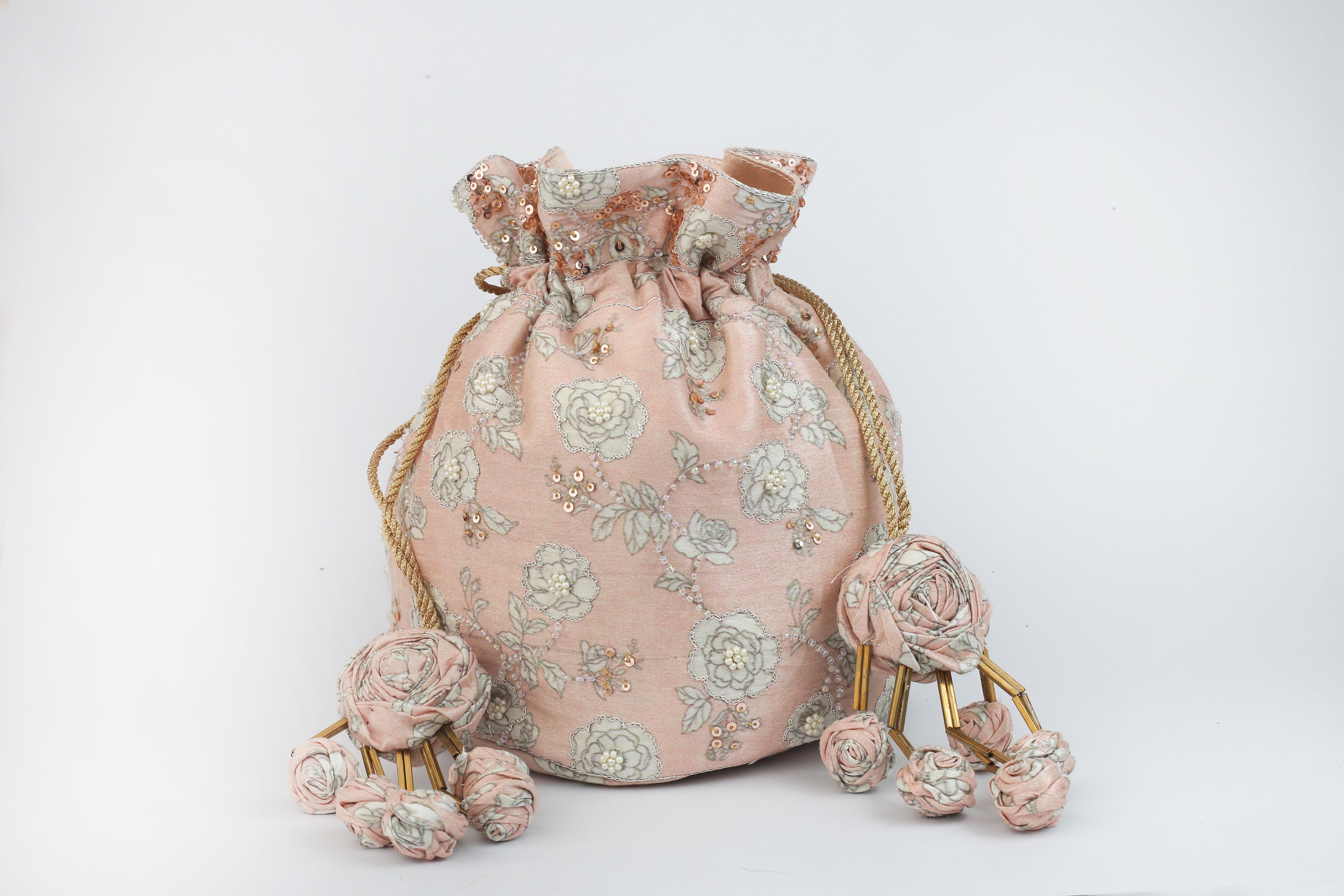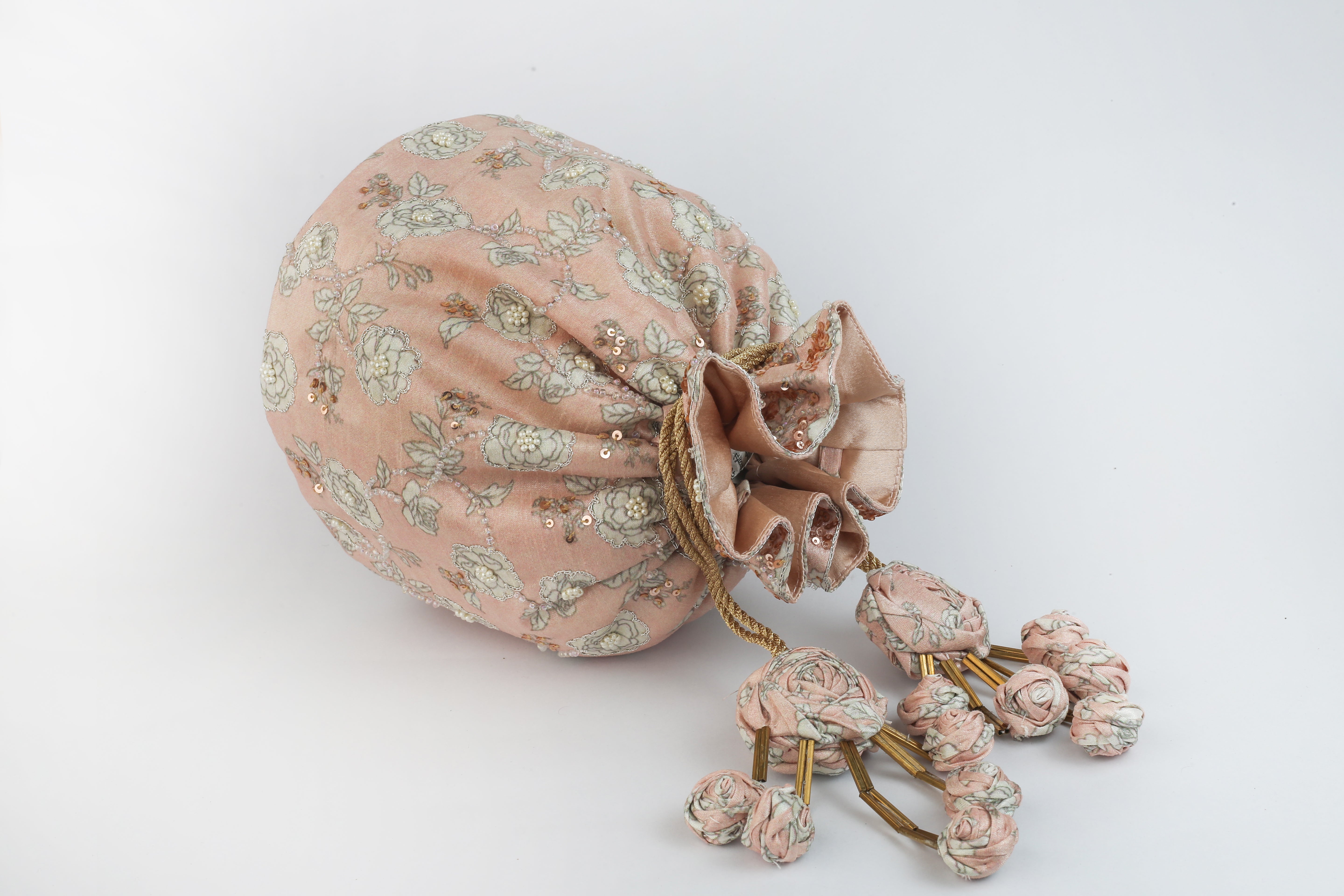 This elegant Potli clutch features a classic old floral print pattern, beautifully enhanced with holographic beads, pearls, and rose gold sequins for a shimmering effect. Finished with intricate zari work, it exudes timeless charm. The signature handcrafted flower tassels, a unique USP of the brand, add a delicate touch, making it perfect for weddings, festive occasions, and celebrations.