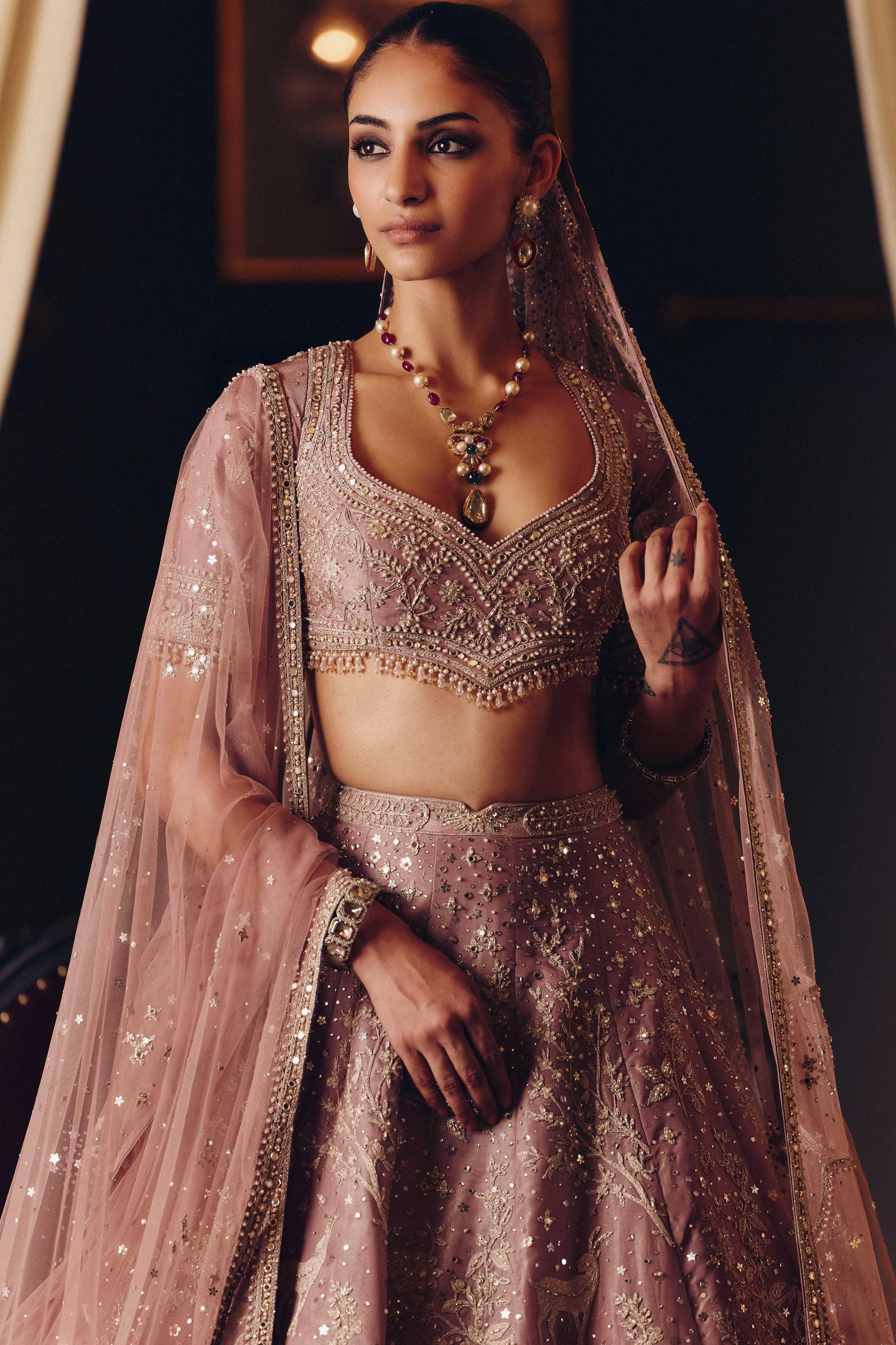 The Pink Couture Tara Lehenga is a celestial vision woven in blush-toned elegance. Inspired by the luminous essence of Tara—the star goddess—this lehenga radiates grace through its delicate pink hue, subtle shimmer, and ethereal draping. It blends softness with strength, tradition with modernity, and is crafted for the woman who wants to glow without overpowering. Perfect for engagements, receptions, or dreamy destination weddings. Pair it with soft dewy makeup, minimal jewels, and an air of quiet confidence.