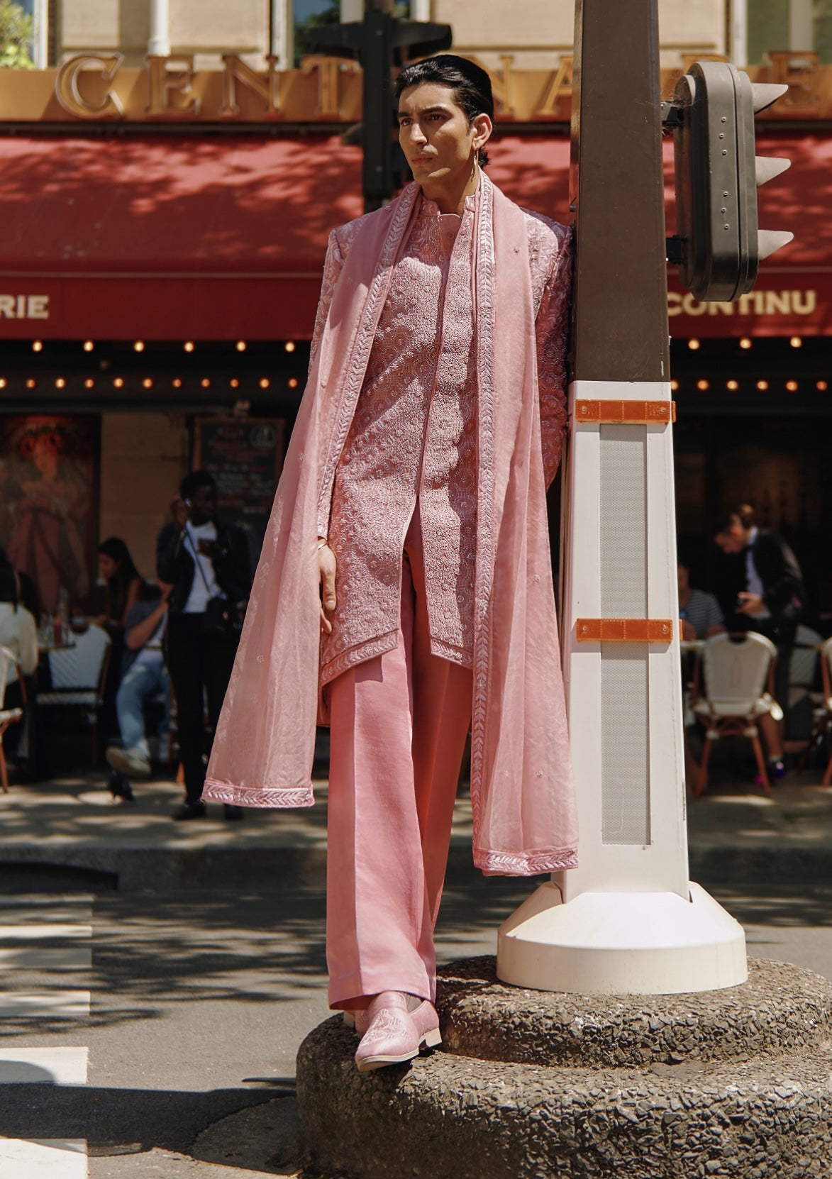 Embrace timeless elegance with our pink sherwani set adorned with intricate hand crystal work embroidery. Crafted from luxurious raw silk the sherwani exudes regal charm and sophistication. Complemented by a refined linen silk kurta and matching pants this ensemble is finished with a delicate organza dupatta adding a touch of ethereal grace. Perfect for weddings and formal occasions this sherwani set combines opulence with exquisite craftsmanship.