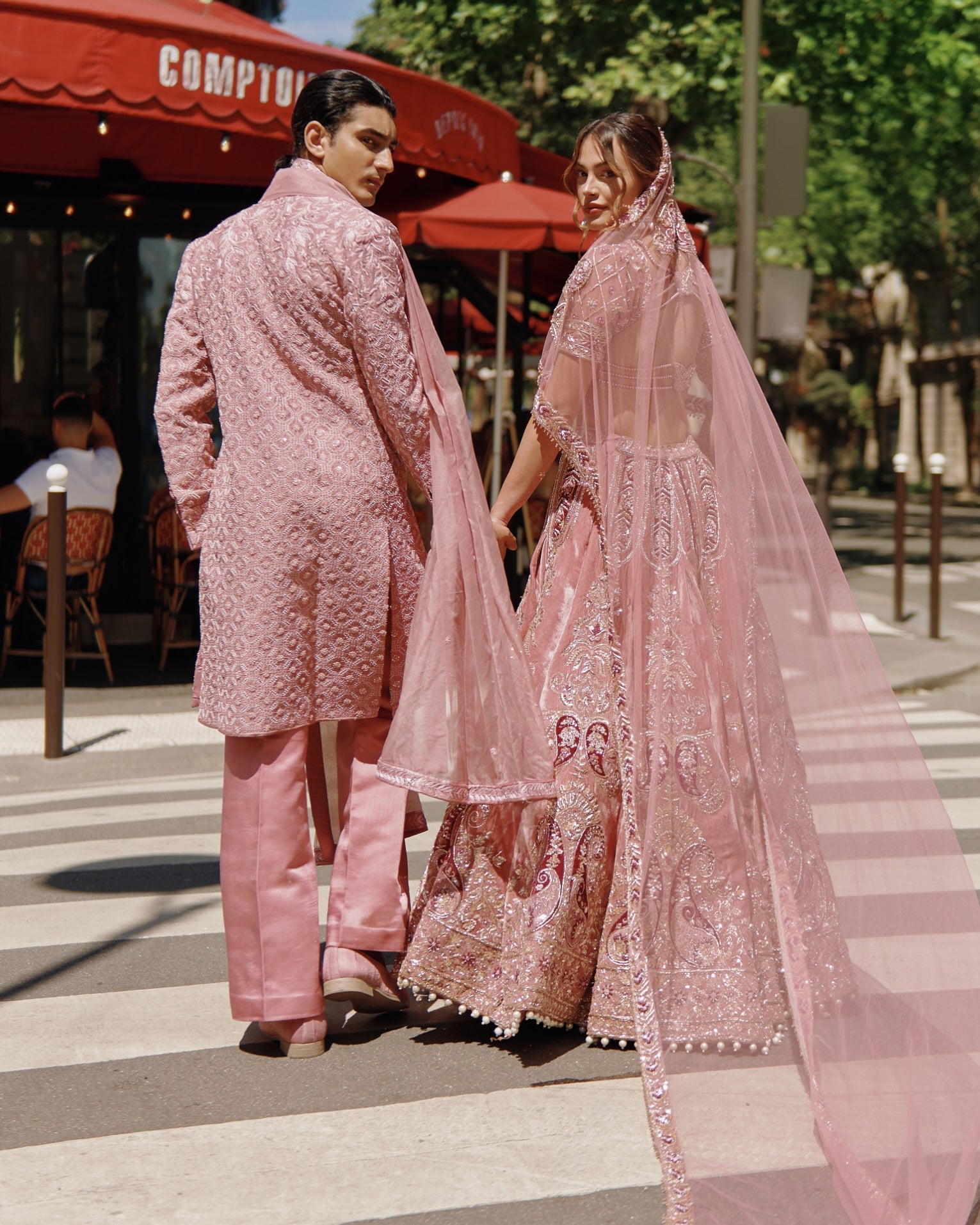 Embrace timeless elegance with our pink sherwani set, adorned with intricate hand crystal work embroidery. Crafted from luxurious raw silk, the sherwani exudes regal charm and sophistication. Complemented by a refined linen silk kurta and matching pants, this ensemble is finished with a delicate organza dupatta, adding a touch of ethereal grace. Perfect for weddings and formal occasions, this sherwani set combines opulence with exquisite craftsmanship.