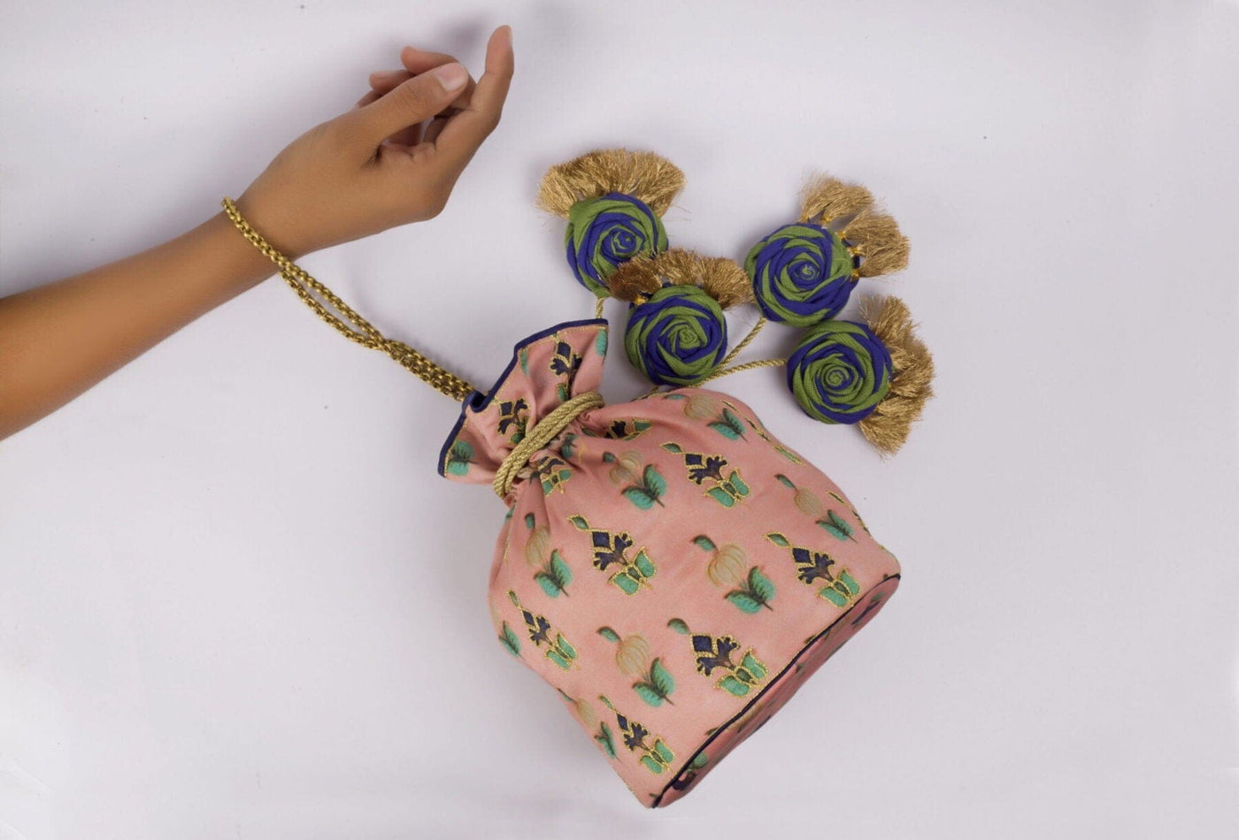 This exquisite Potli clutch features a unique wall-inspired customized printed fabric, adorned with delicate light gold resham work. The standout detail is the beautifully handcrafted flower tassels, the signature USP of the brand. A perfect blend of tradition and elegance, this Potli is ideal for festive occasions, weddings, and cultural celebrations