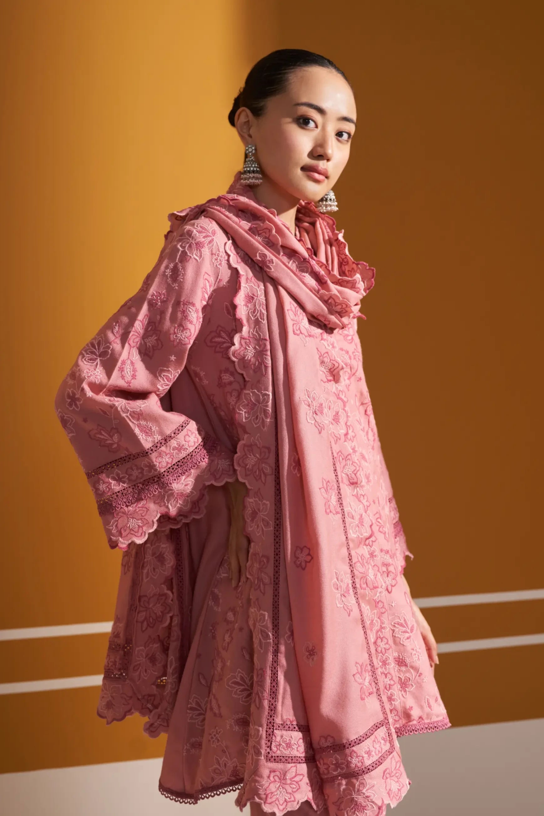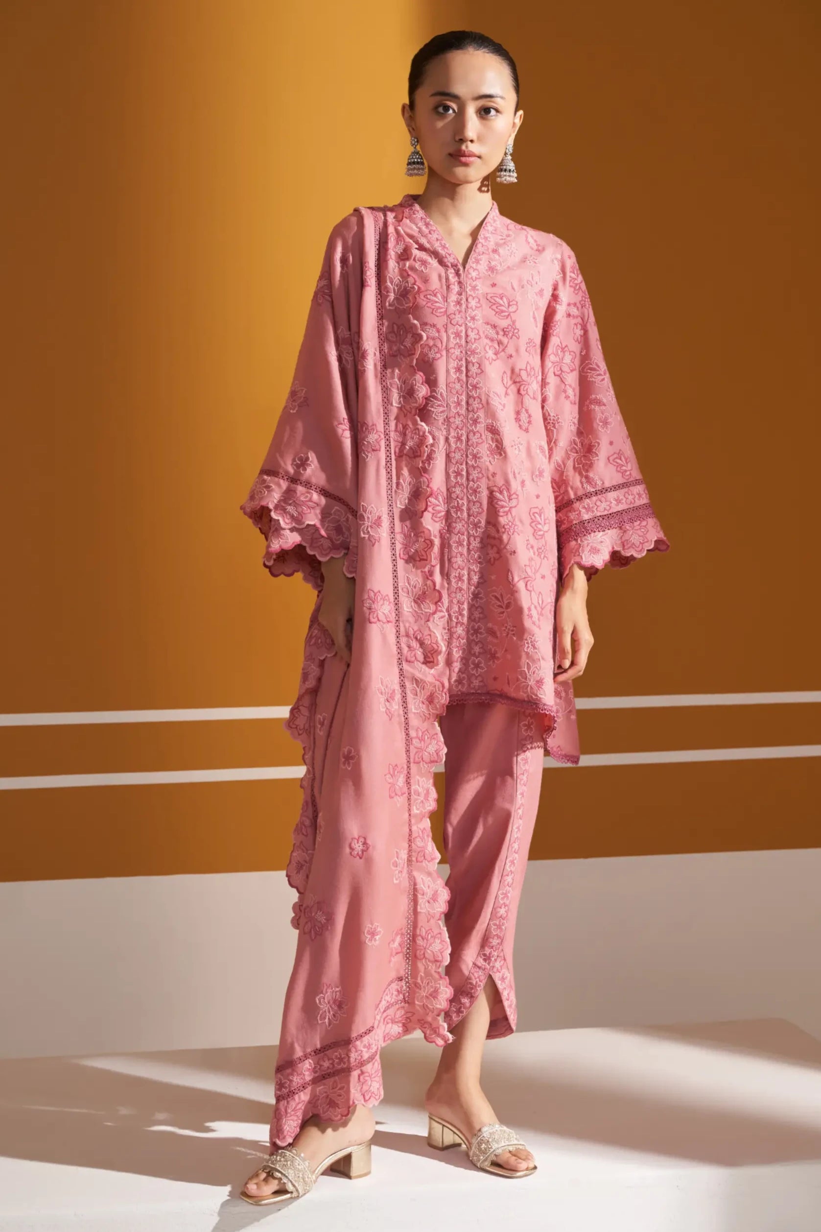 Exude feminine charm with this blush pink woolen kurta set, perfect for winter festivities and intimate gatherings. The kurta features tonal floral embroidery, a relaxed silhouette, and a scalloped hemline for added elegance. Intricate floral patterns adorn the neckline and sleeves, enhancing its sophistication. Paired with dhoti-style pants for effortless comfort and a matching embroidered shawl, this ensemble blends modernity with timeless grace, making it ideal for any special occasion.
