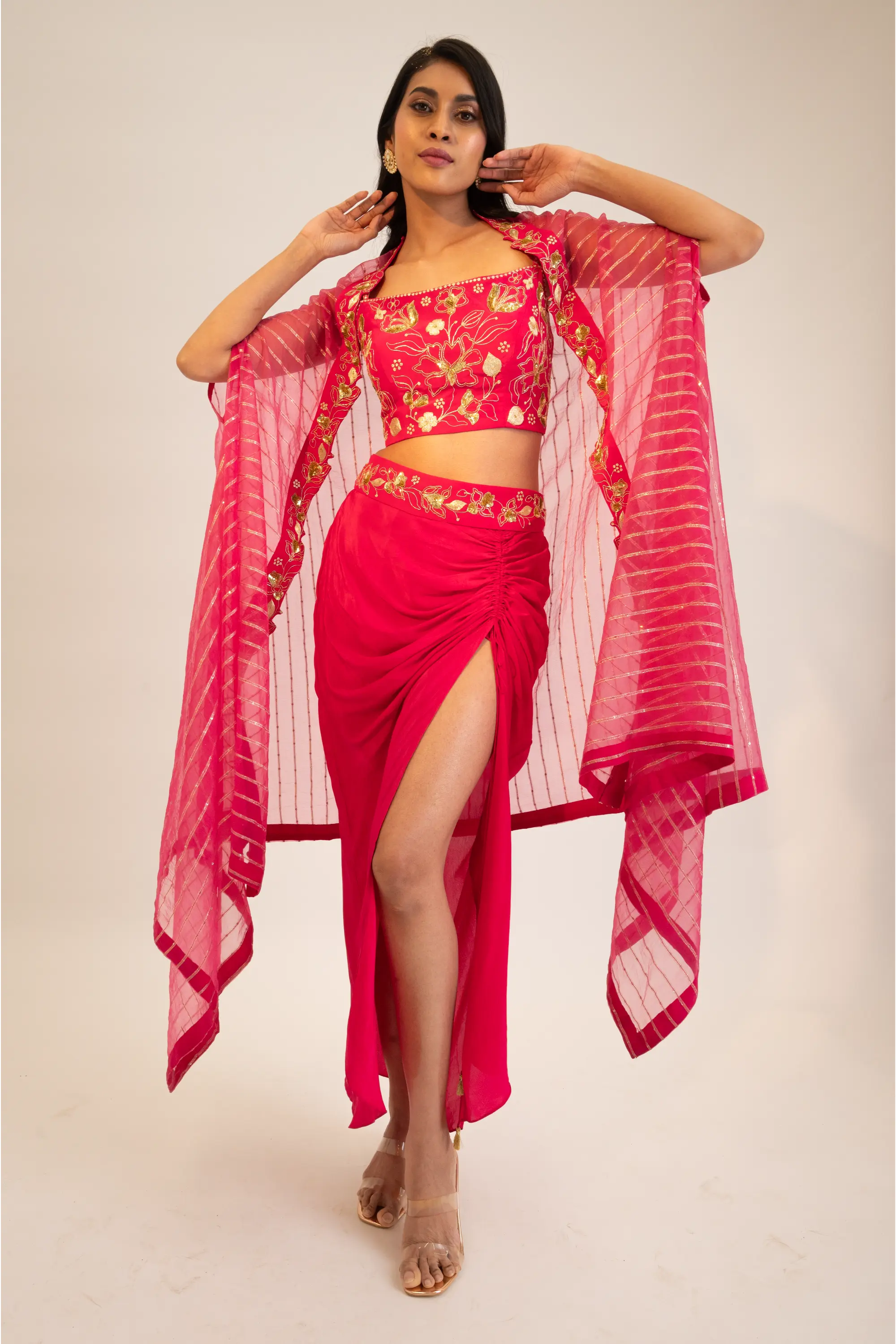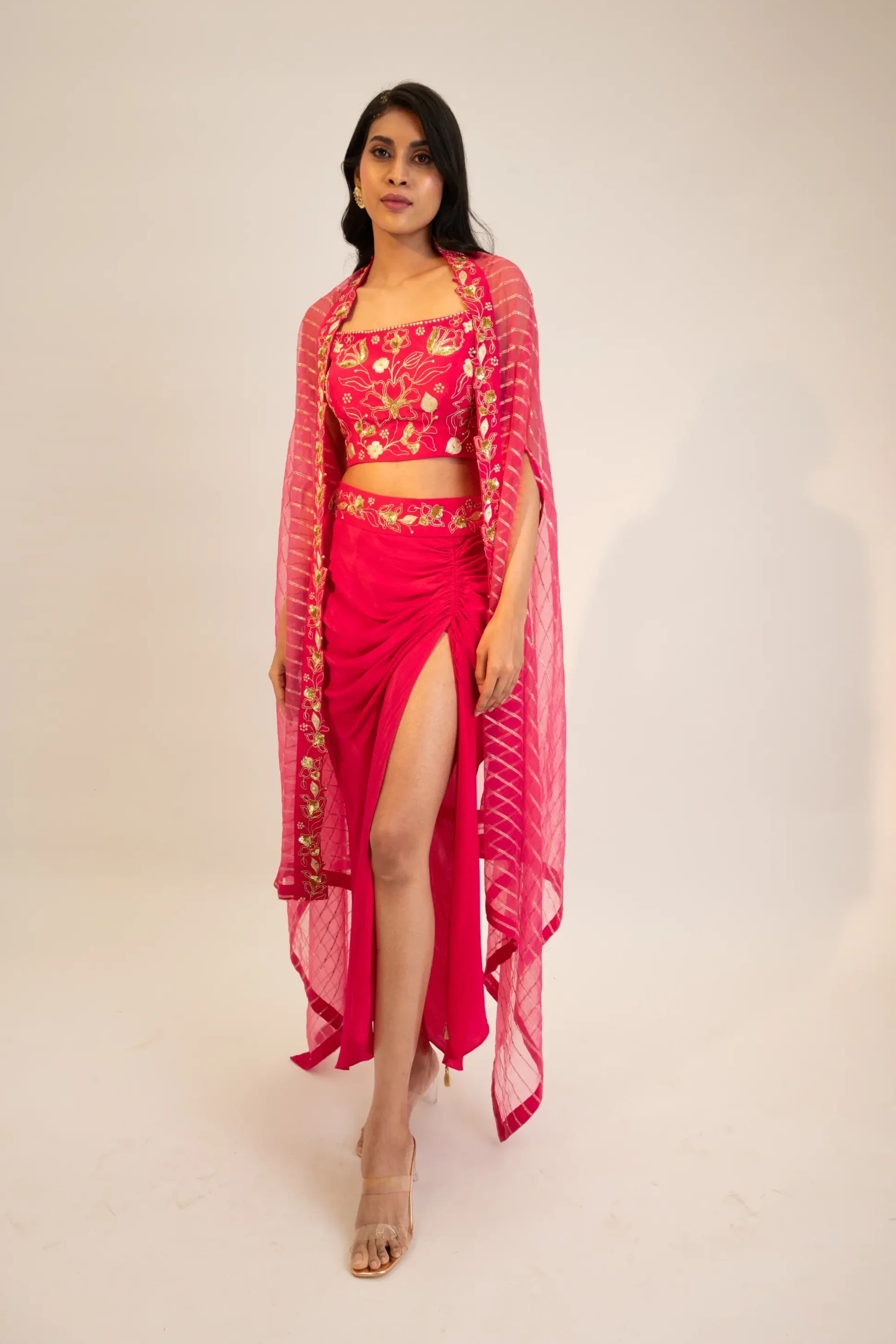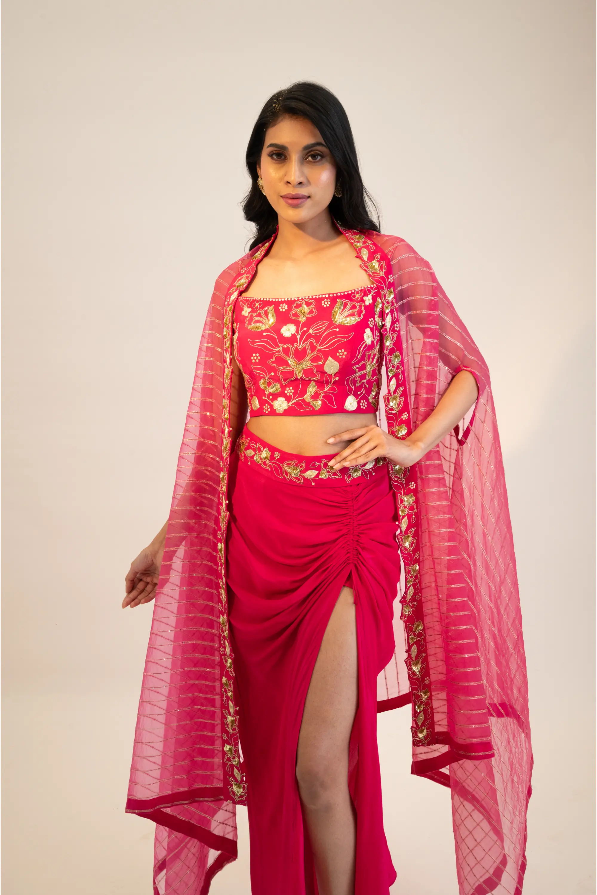 Elevate your style with our chic pink embroidered blouse, perfectly paired with a stunning slit skirt, stylish belt, and flowing cape. This exquisite ensemble combines intricate embroidery on the blouse with a contemporary silhouette, creating a look that is both sophisticated and daring. The slit skirt adds a touch of drama, while the belt cinches the waist for a flattering shape. The flowing cape enhances the overall elegance, making this outfit ideal for upscale events, parties, or special occasions. Embrace the allure of pink and the art of layering with this versatile ensemble that celebrates modern fashion and individuality.