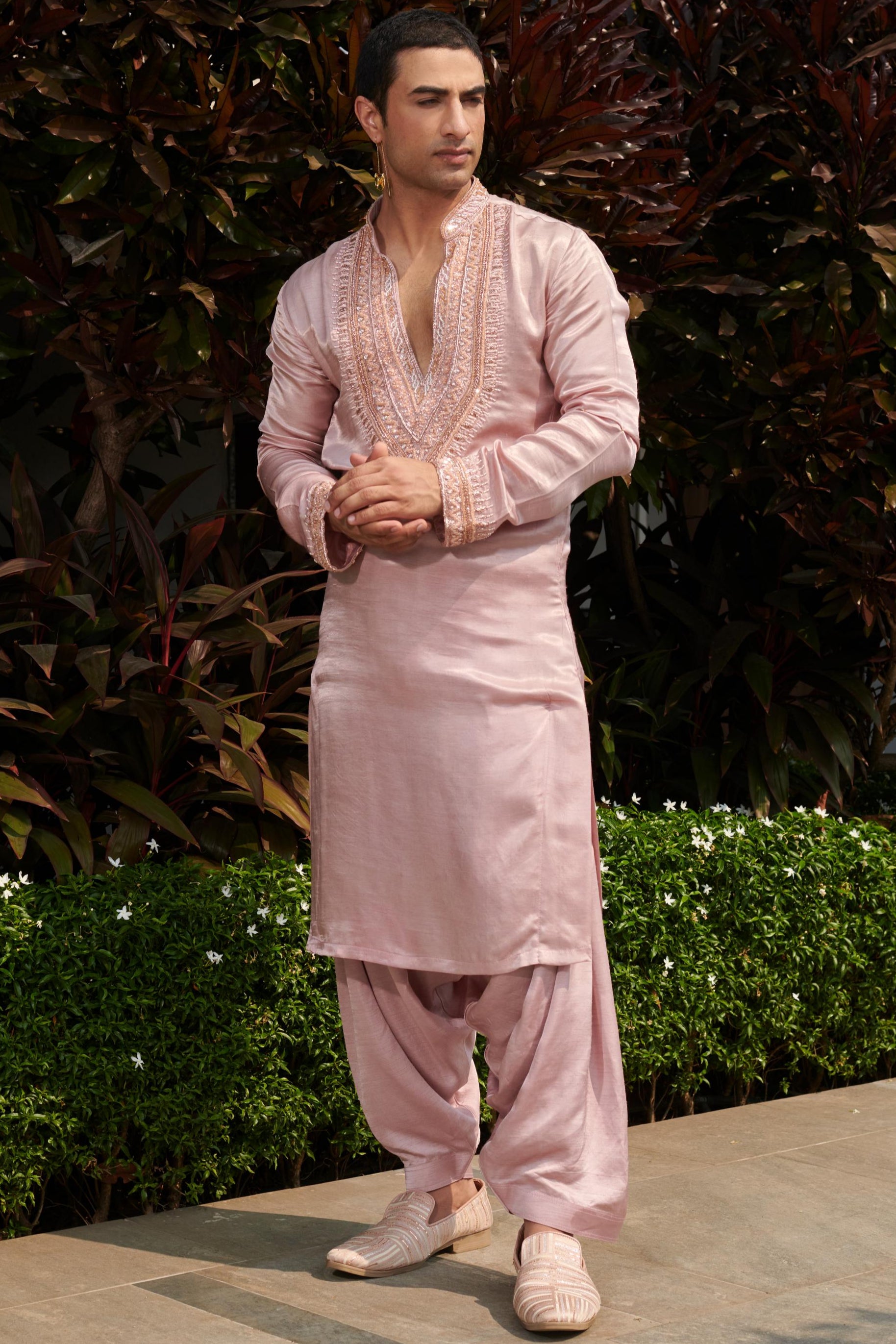 A statement of refined elegance this purple silk kurta features a sleek straight-cut silhouette silver embroidery along the neckline and full-length sleeves. Paired with tailored slim-fit pants this ensemble is ideal for both festive and formal occasions.
