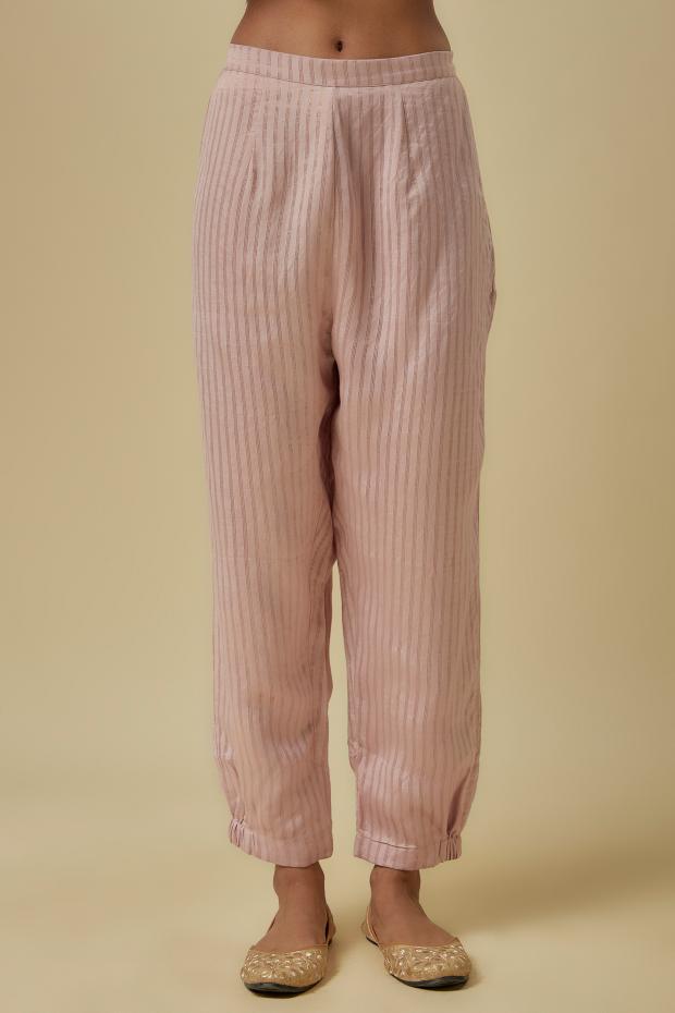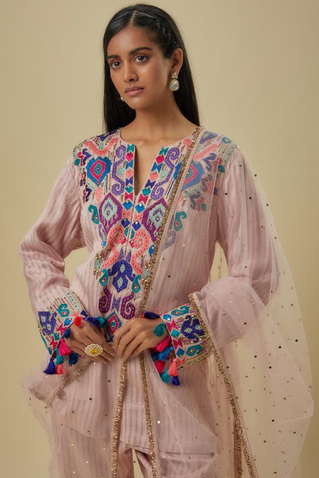 Chic and graceful, our Onion Pink Chanderi Short Kurta Set features a finely embroidered yoke that adds elegance to the subtle sheen of chanderi. Paired with contemporary jogger pants for a modern silhouette and finished with a shimmering mukaish net dupatta, this ensemble strikes the perfect balance between comfort and festive charm. Ideal for intimate gatherings, pujas, or daytime celebrations, it's a refined choice for the modern Indian wardrobe.