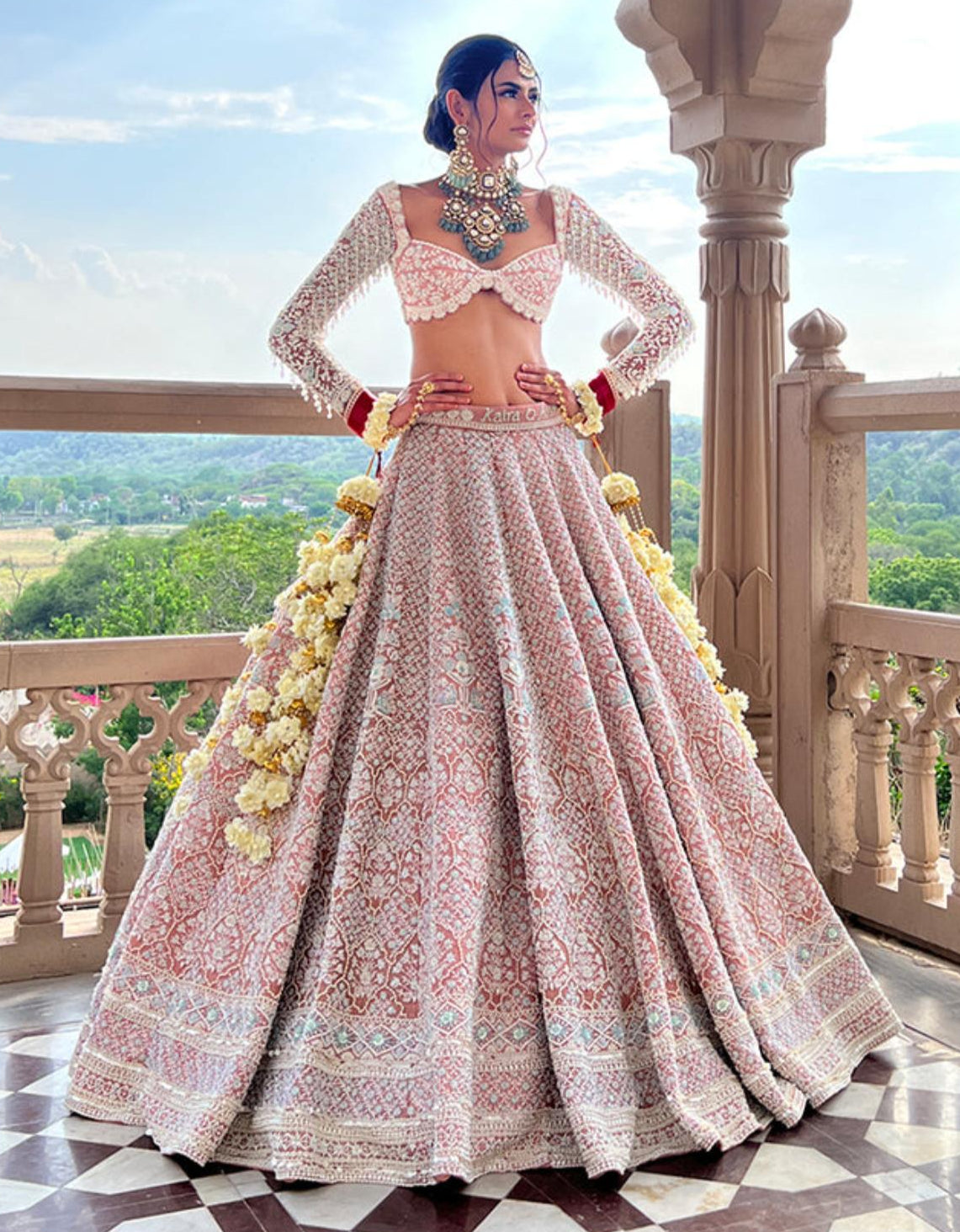 The Emery Bridal Lehenga is a stunning 20-kali rose-colored lehenga crafted in pure raw silk, featuring intricate hand embroidery with our signature pearls, crystals, and glass beads. With its magnificent flare, it embodies grandeur and elegance. This set includes double dupattas—a soft net dupatta with heavily embroidered borders, and a breathtaking veil dupatta with an expansive floral embroidered trail, making it perfect for a regal bridal statement.