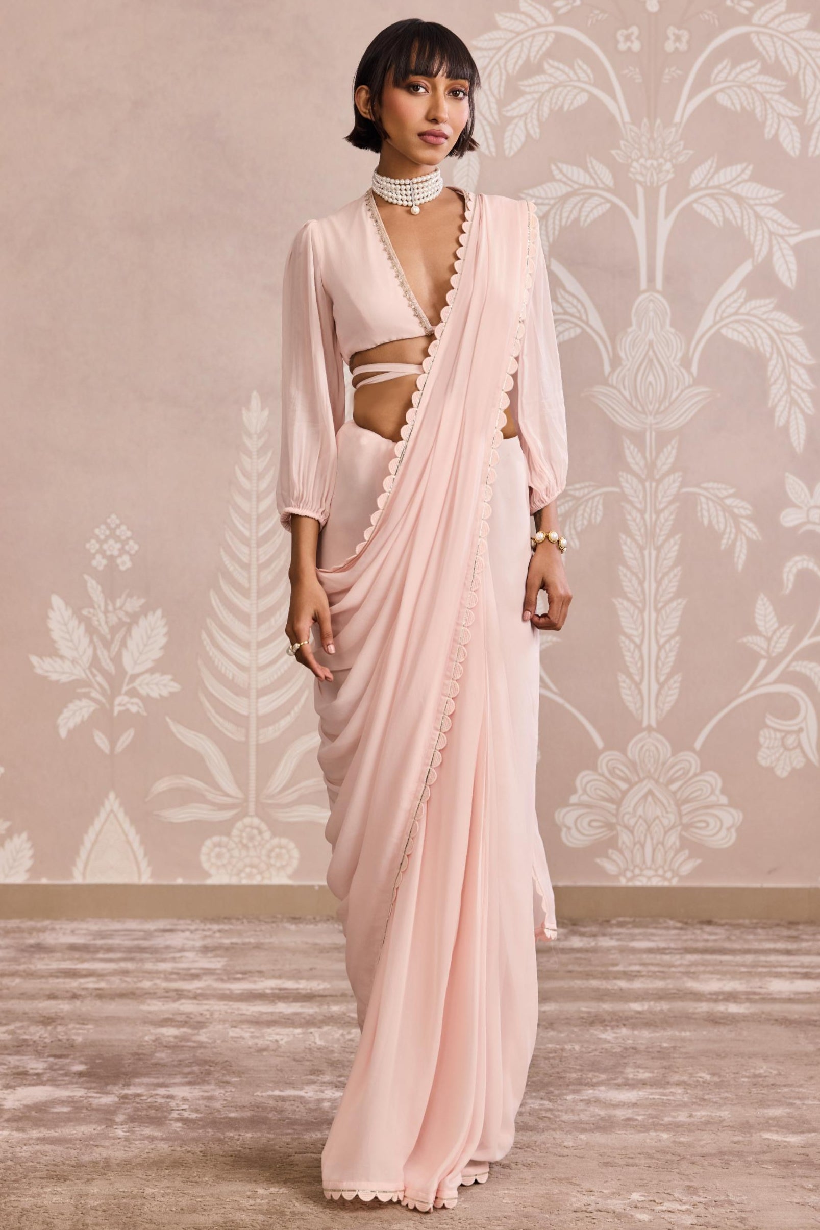 Turn heads in our Pink Ever After Saree Set, featuring a placement-embroidered georgette V-neck blouse with exaggerated sleeves. Paired with a flat saree and crepe petticoat, this ensemble blends elegance with edge. The look is cinched together with an allover embroidered net bag belt, adding definition and flair. Perfect for festive soirees or weddings, this set redefines modern Indian wear with soft drama and timeless charm.
