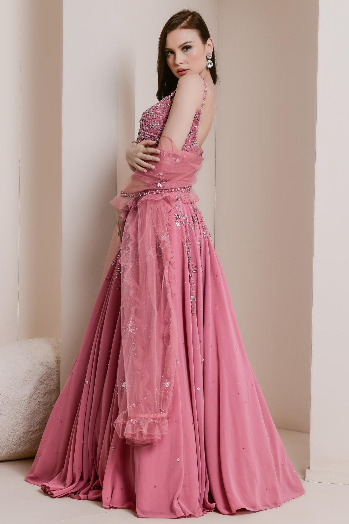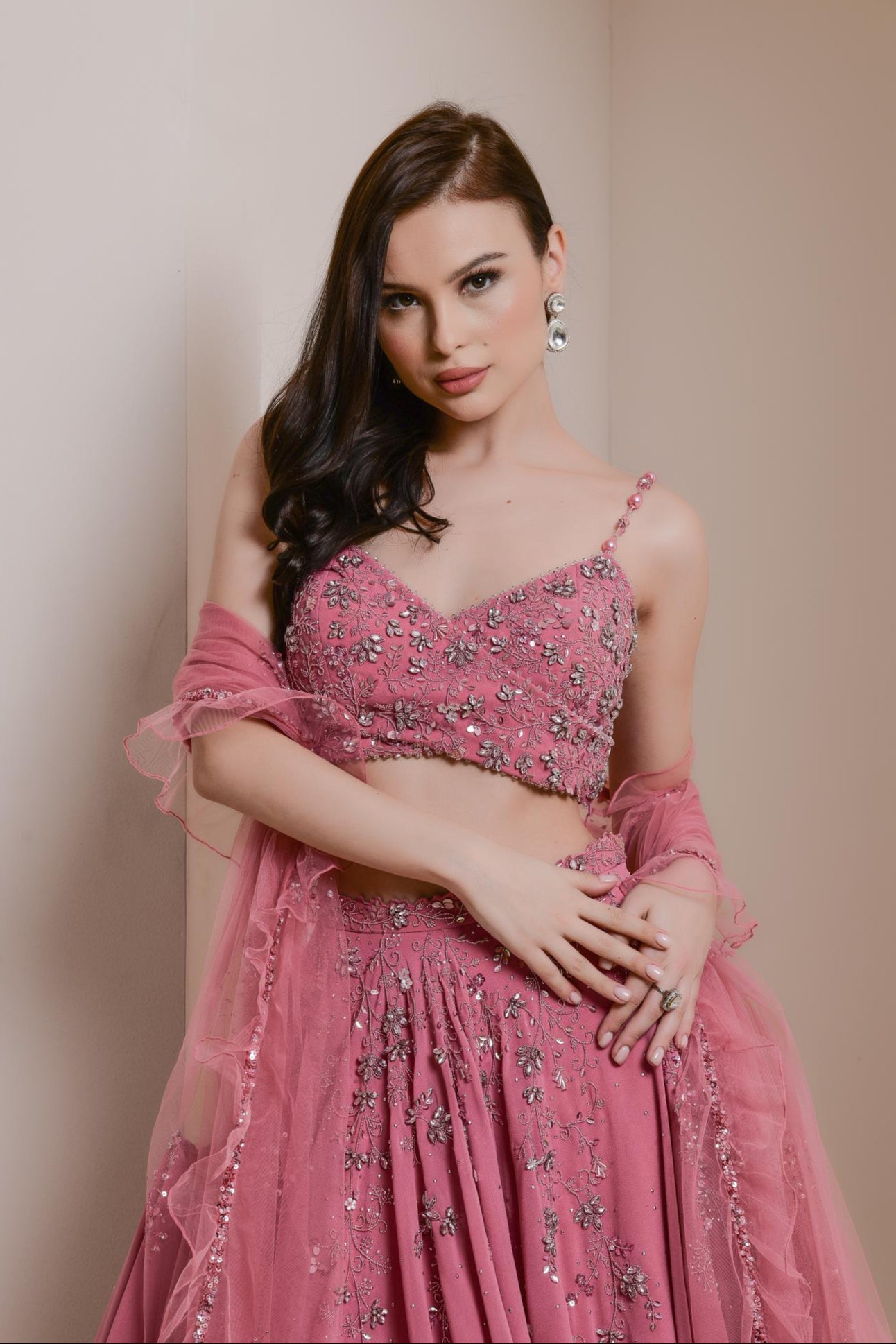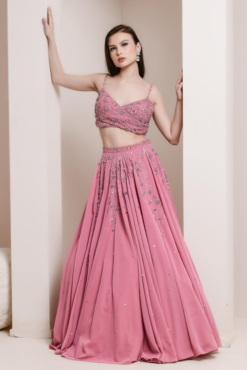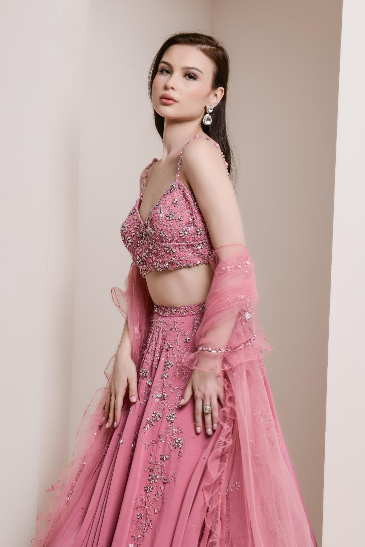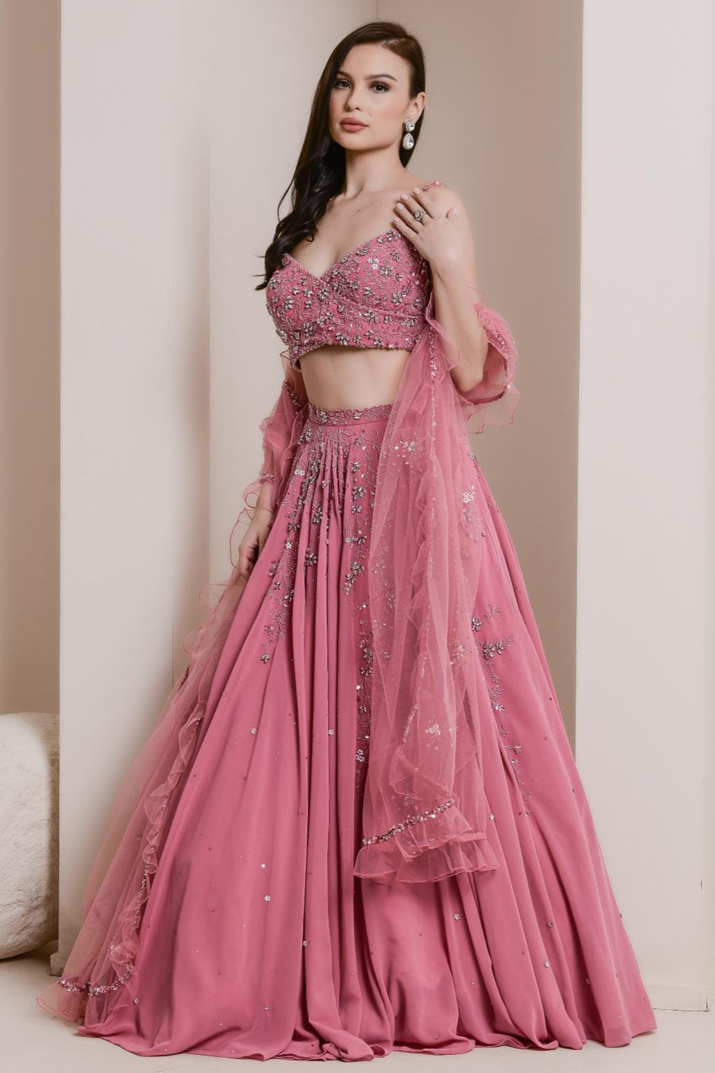 This beautiful, flowing georgette lehenga set features a graceful surplice blouse paired with a wide-flared, flowing skirt. The ensemble is embroidered with a delicate crystal and bead floral vine design, adding a touch of sparkle and elegance. Completed with a tulle dupatta, edged with soft ruffles, this lehenga set combines fluidity and sophistication, making it perfect for a variety of special occasions.