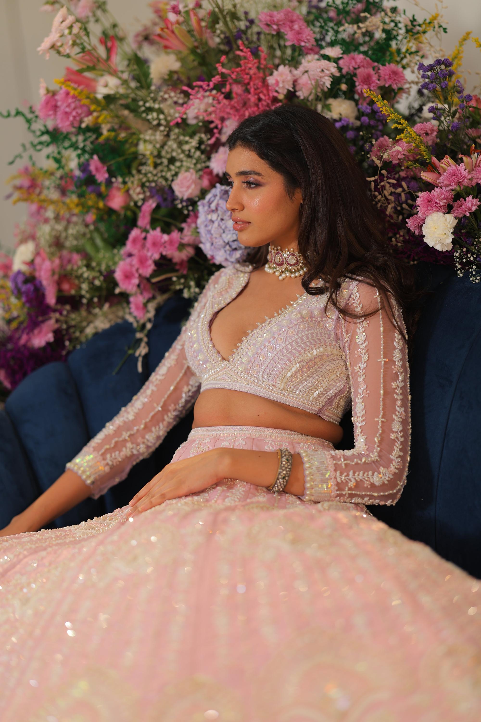 Presenting our pastel stunner, the Florine Lehenga Set—an unforgettable addition to your wedding wardrobe. Crafted in metallic organza in a dreamy pastel pink, the lehenga is intricately hand-embroidered with pearls, crystals, sequins, beads, and cutdana. It’s paired with a soft lilac blouse, lavishly encrusted with pearls, and completed with a stunning dupatta washed in pastel hues and embellished with pearls for an ethereal, romantic finish.