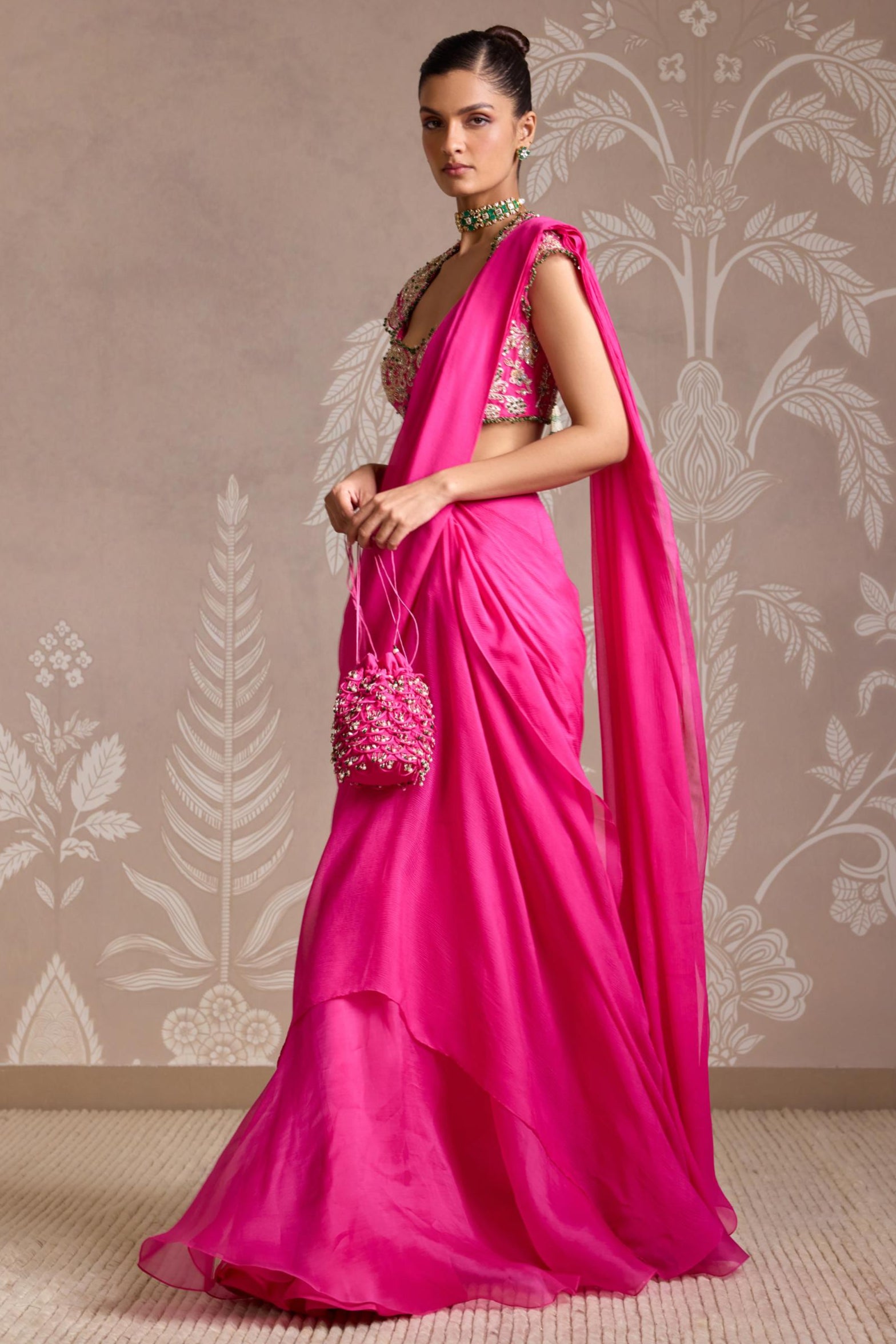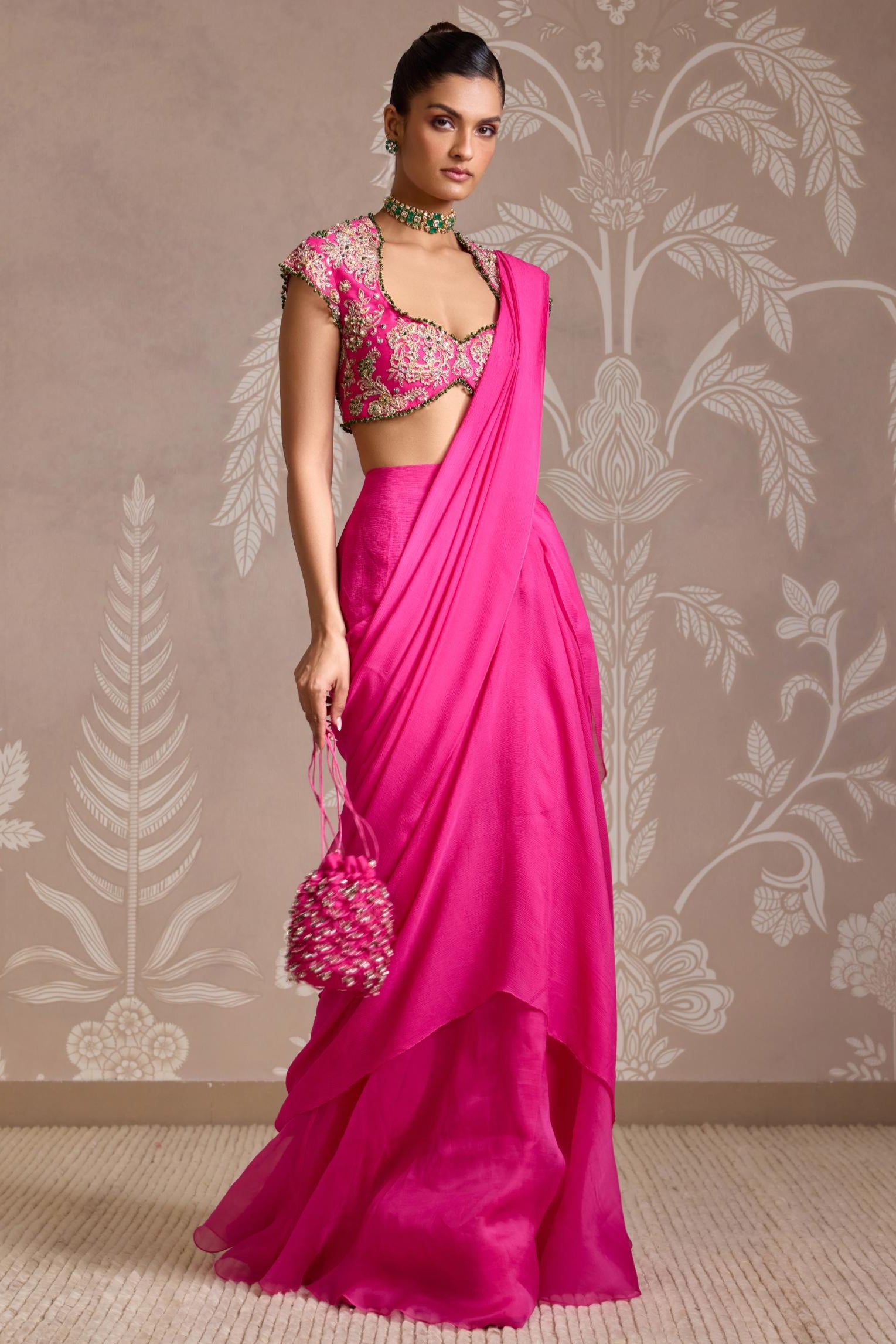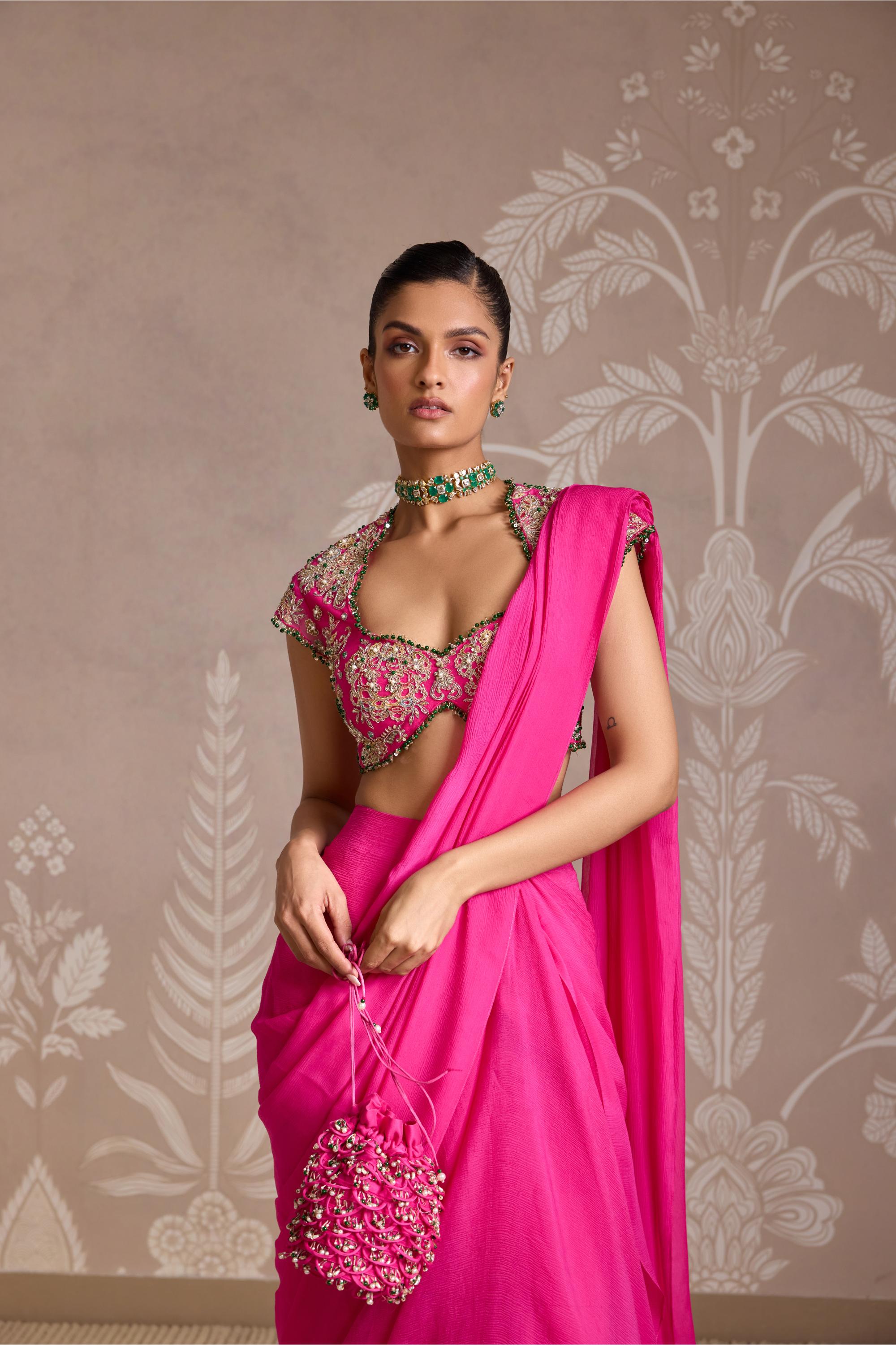 The Pink Folds Draped Saree Set is a modern classic that blends effortless draping with refined elegance. Designed in a soft pink hue, this pre-draped saree features sculpted pleats and a contemporary silhouette for a flattering fit. Perfect for weddings, festive events, or cocktail evenings, it combines ease of wear with graceful style. A go-to choice for those who love timeless fashion with a chic, modern edge.