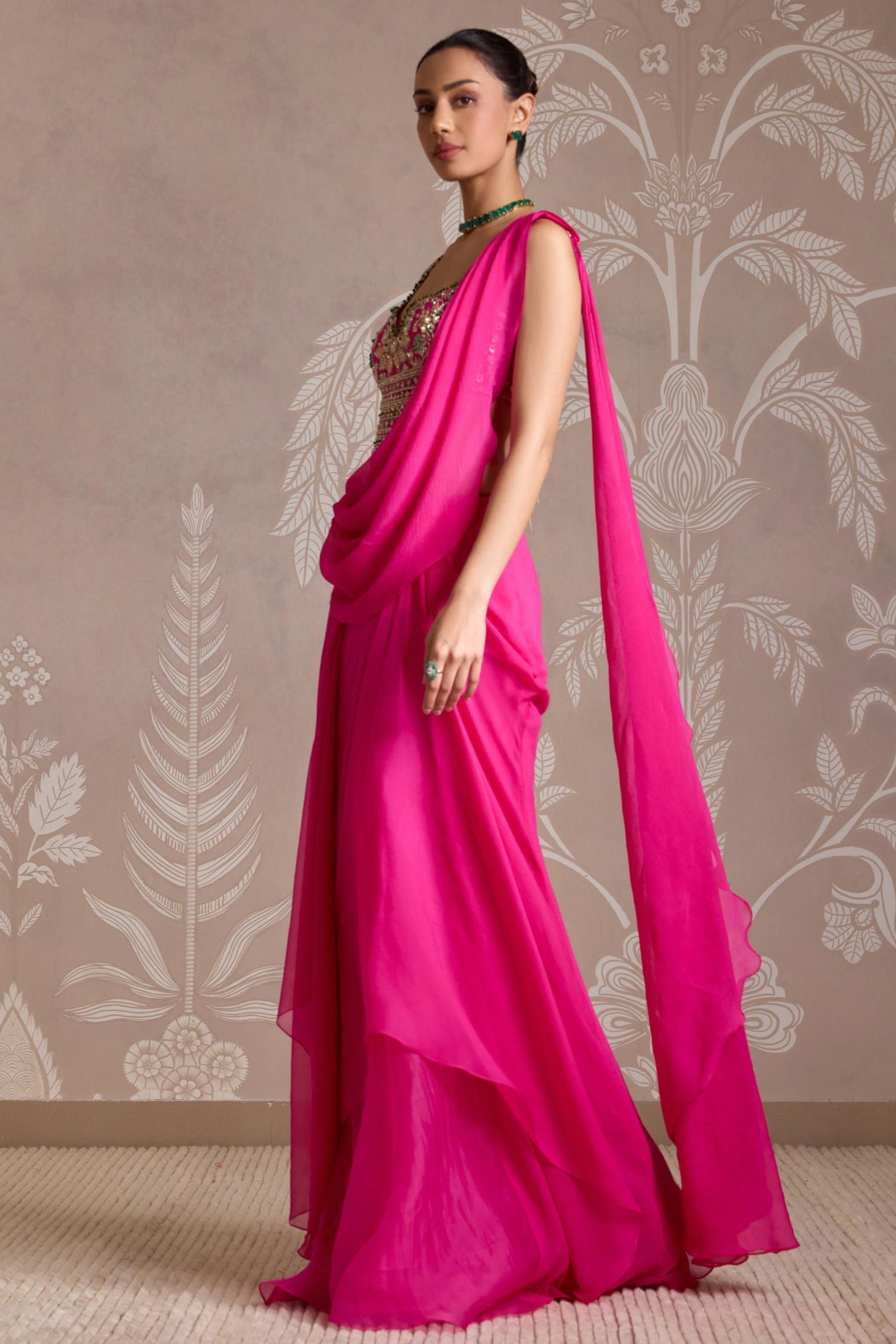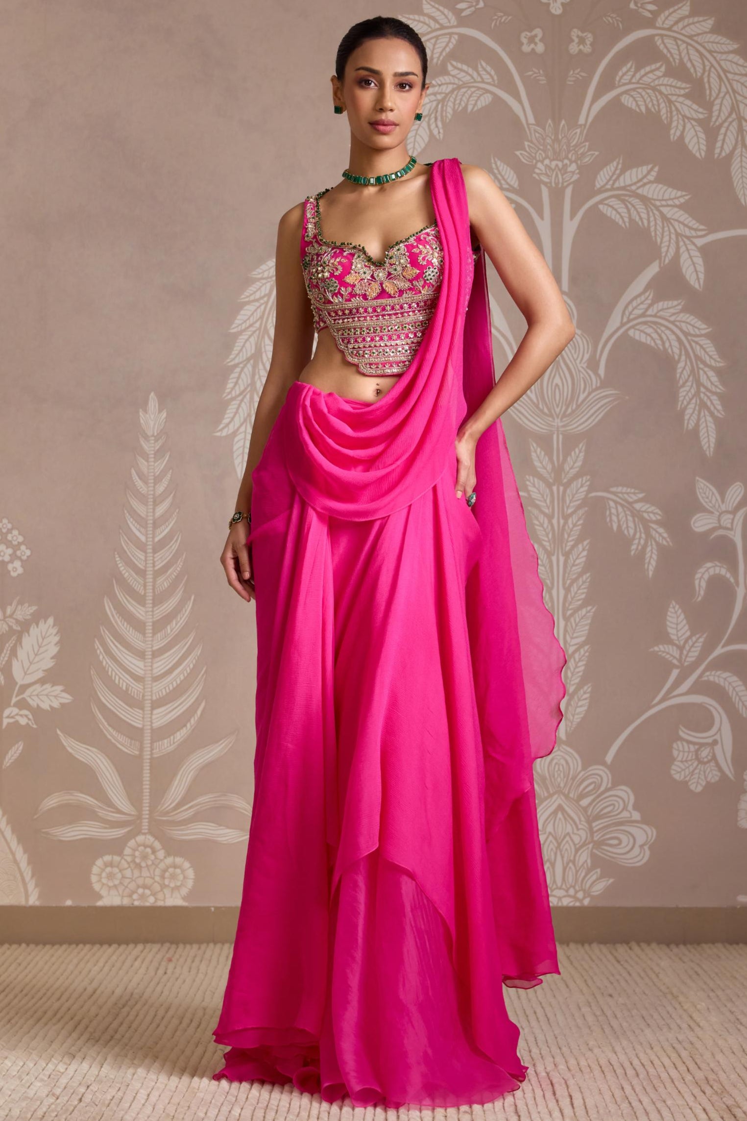 The Pink Folds Saree Set is a beautiful blend of soft femininity and modern elegance. Crafted in a delicate pink hue with structured pleats, this saree offers a flattering silhouette and graceful draping. Perfect for weddings, festive occasions, or special events, it combines timeless charm with contemporary style. An ideal choice for those who love subtle sophistication with a fresh, stylish appeal.