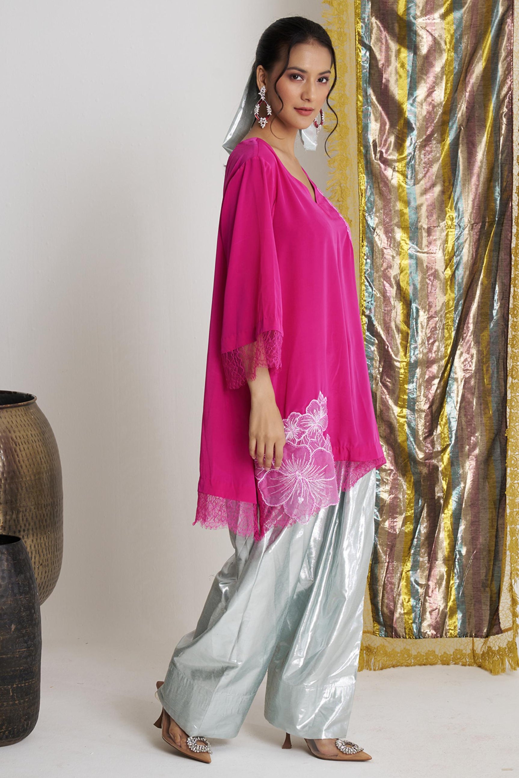 Vibrant, expressive, and full of movement—the Pink Gulabo Groove Farshi Salwar Suit Set is made for the woman who loves to celebrate tradition with a twist. Set in a bold gulabo pink, this ensemble features fluid fabrics and playful yet refined detailing that evoke rhythm and joy. The farshi-style salwar adds graceful flair, while the structured kurta and soft dupatta complete the silhouette with a modern edge. Perfect for sangeet nights, festive occasions, or daytime celebrations, the Pink Gulabo Groove Set is a statement in spirited elegance.