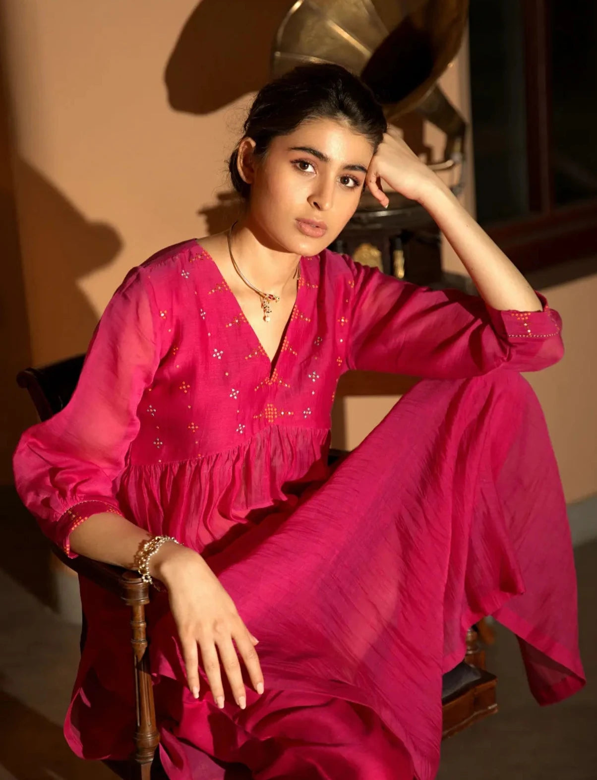 This charming pink gather kurta features intricate hand embroidery of multi-color dotted lines in aari and resham along the yoke, showcasing exquisite craftsmanship and vibrant design. The soft gathers create a flattering silhouette, adding elegance and ease to the overall look. Paired with straight pants that boast dot booti embroidery along the hem, this ensemble strikes a perfect balance between traditional and contemporary styles. Ideal for festive occasions or casual gatherings, it radiates charm and sophistication in every detail.