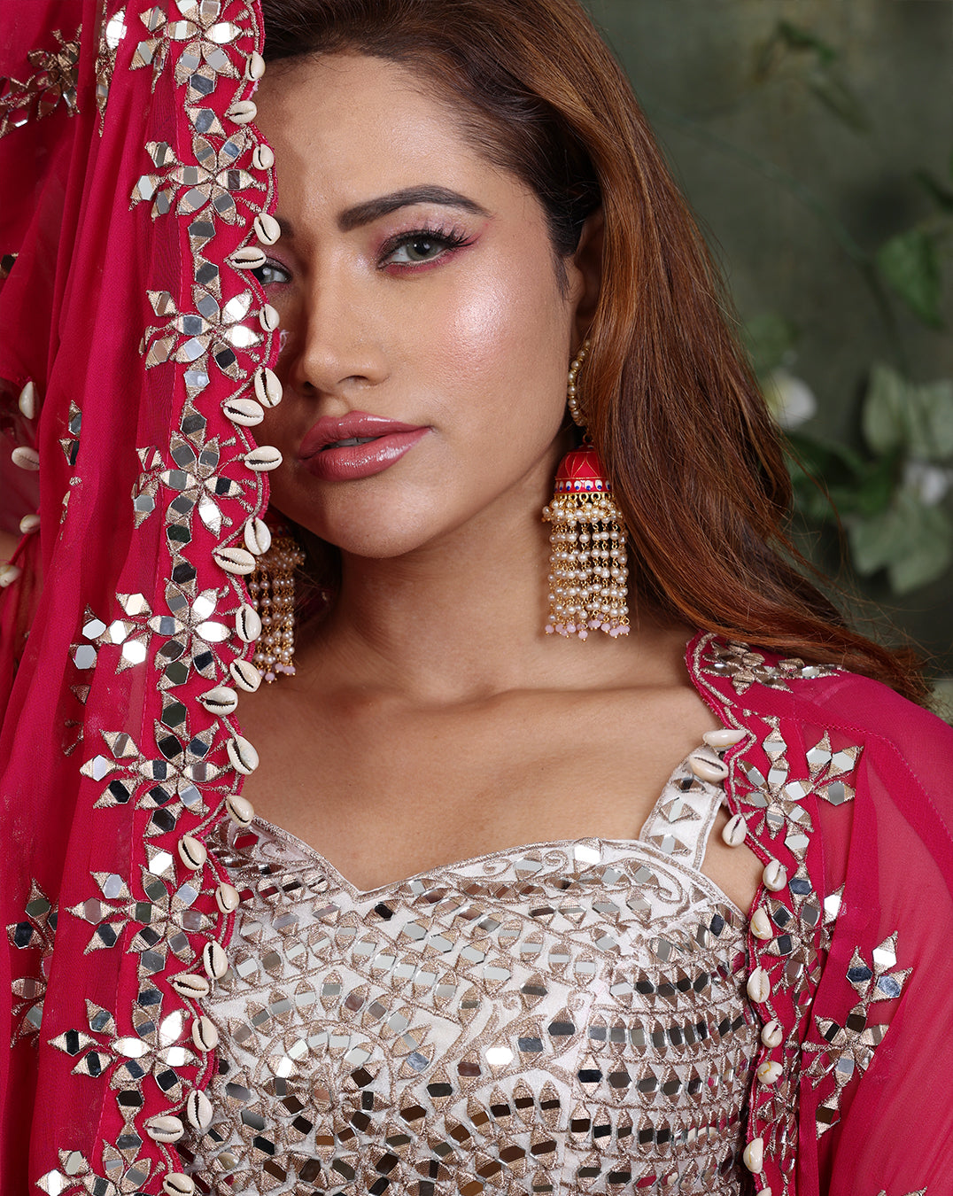 Enveloped in delicate pink hues and shimmering mirror embroidery, this outfit radiates sophistication. The crushed georgette lehenga features a beautifully embroidered mirror belt, adding a touch of sparkle. The blouse, fully adorned with mirror work, is accentuated with playful tassels around the waist. Completing the ensemble is a pink jacket, richly embroidered with mirror work, designed to color block and elevate the entire look.