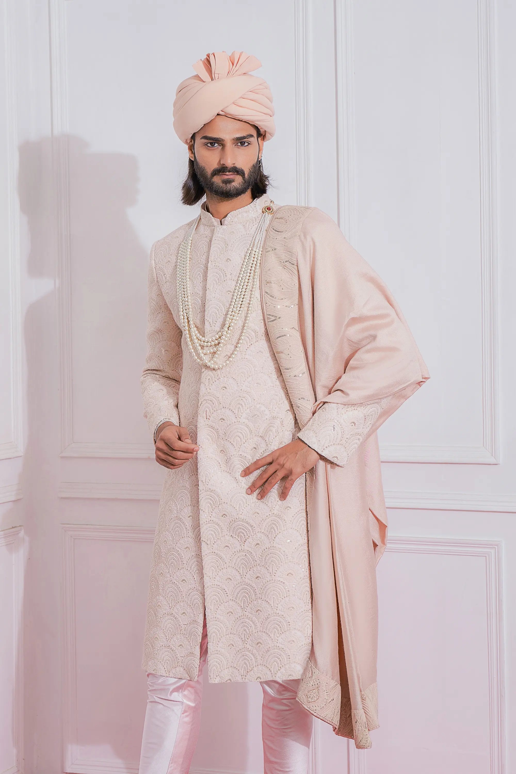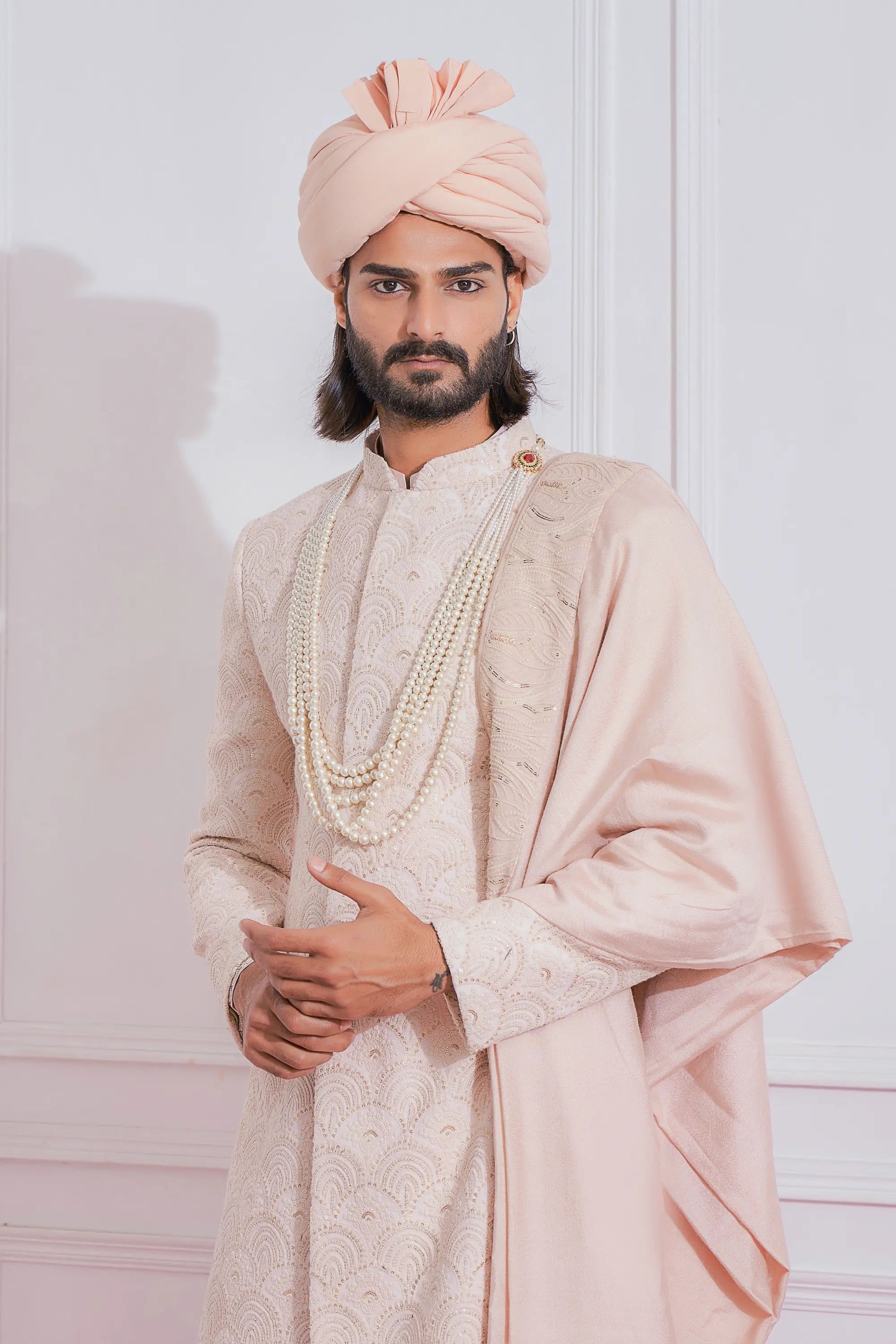 Components: 5 pieces (Sherwani, Kurta, Churidar, Embroidered stole, and Safaa fabric)