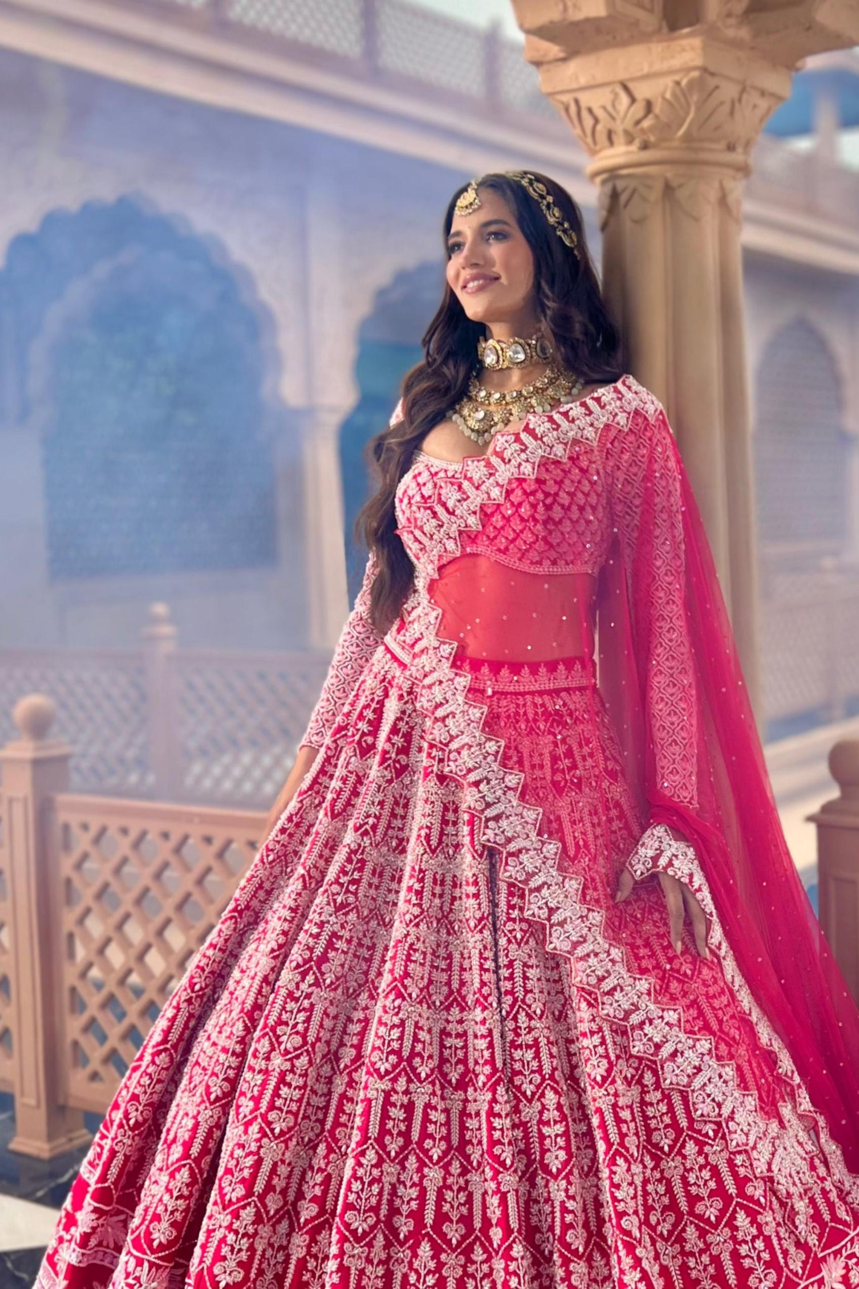 The Keisha Lehenga is an intricately hand-embroidered hot pink lehenga crafted from pure raw silk. Embellished with shimmering glass beads, pearls, crystals, cutdana, and sequins, it radiates richness and elegance. Paired with a modern yet traditional blouse, this ensemble strikes the perfect balance of contemporary and classic. A soft net dupatta with heavily embroidered borders completes the look, making it ideal for brides seeking bold color and timeless detail.