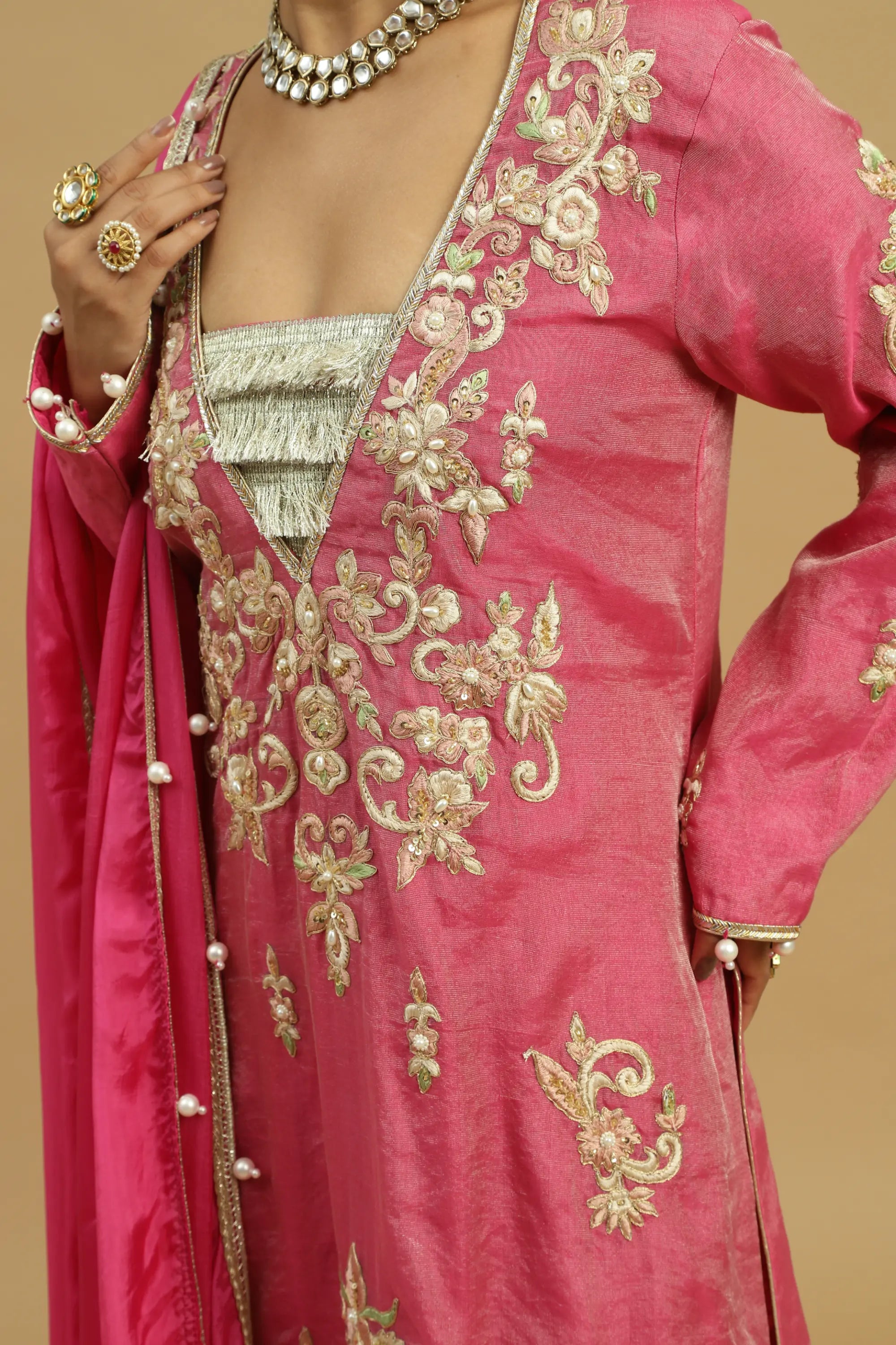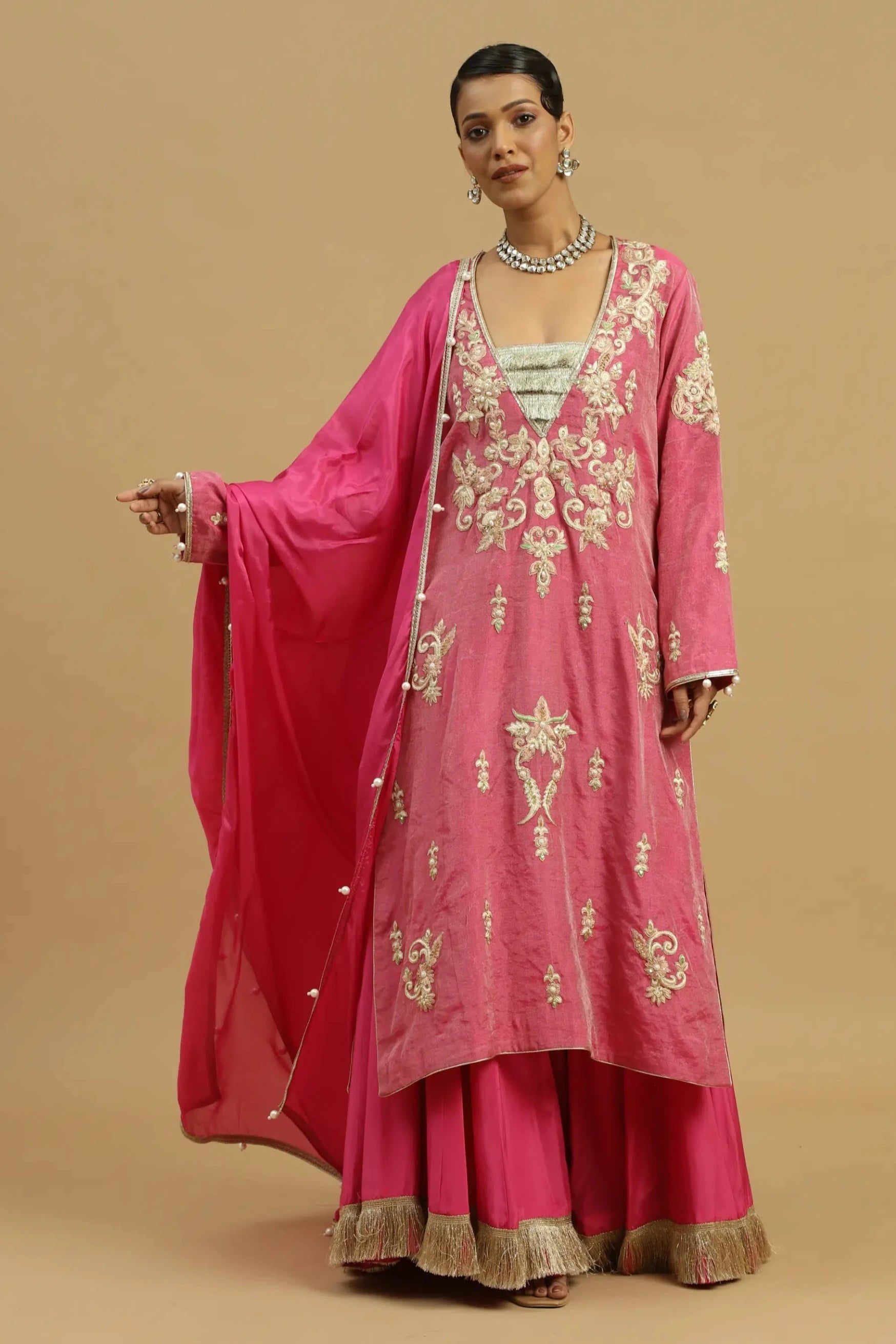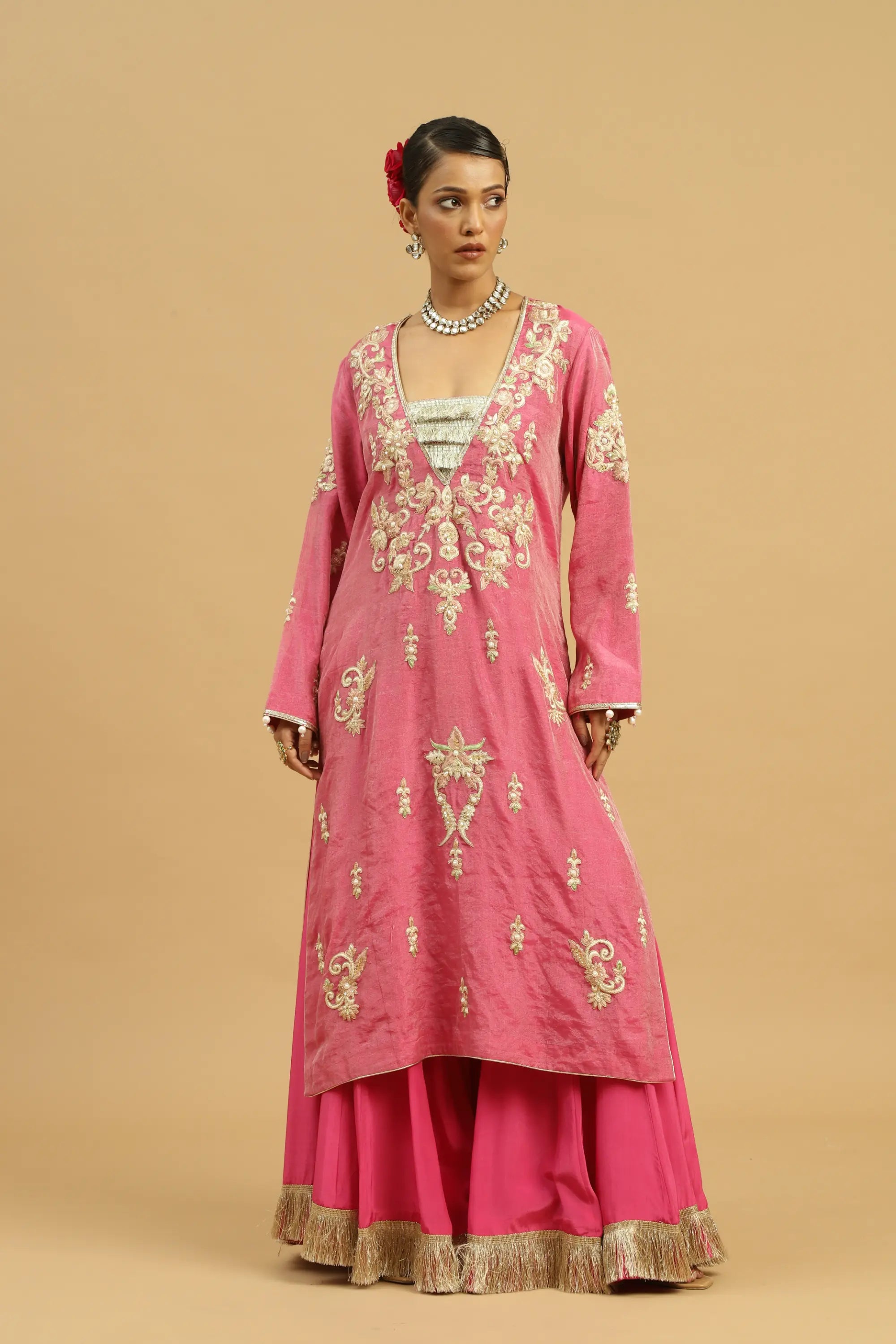 This exquisite pink kurta is a stunning blend of timeless tradition and contemporary style. The soft pink hue, paired with the flowy sharara, creates a flattering silhouette that adds grace and movement to the ensemble. The matching dupatta completes the look, draping beautifully for a refined and sophisticated finish. Ideal for weddings, festive gatherings, or special celebrations, this outfit is perfect for anyone looking to make a statement. Whether you're attending a ceremony or a cocktail event, this pink kurta with sharara is a versatile and elegant choice that radiates charm and luxury.