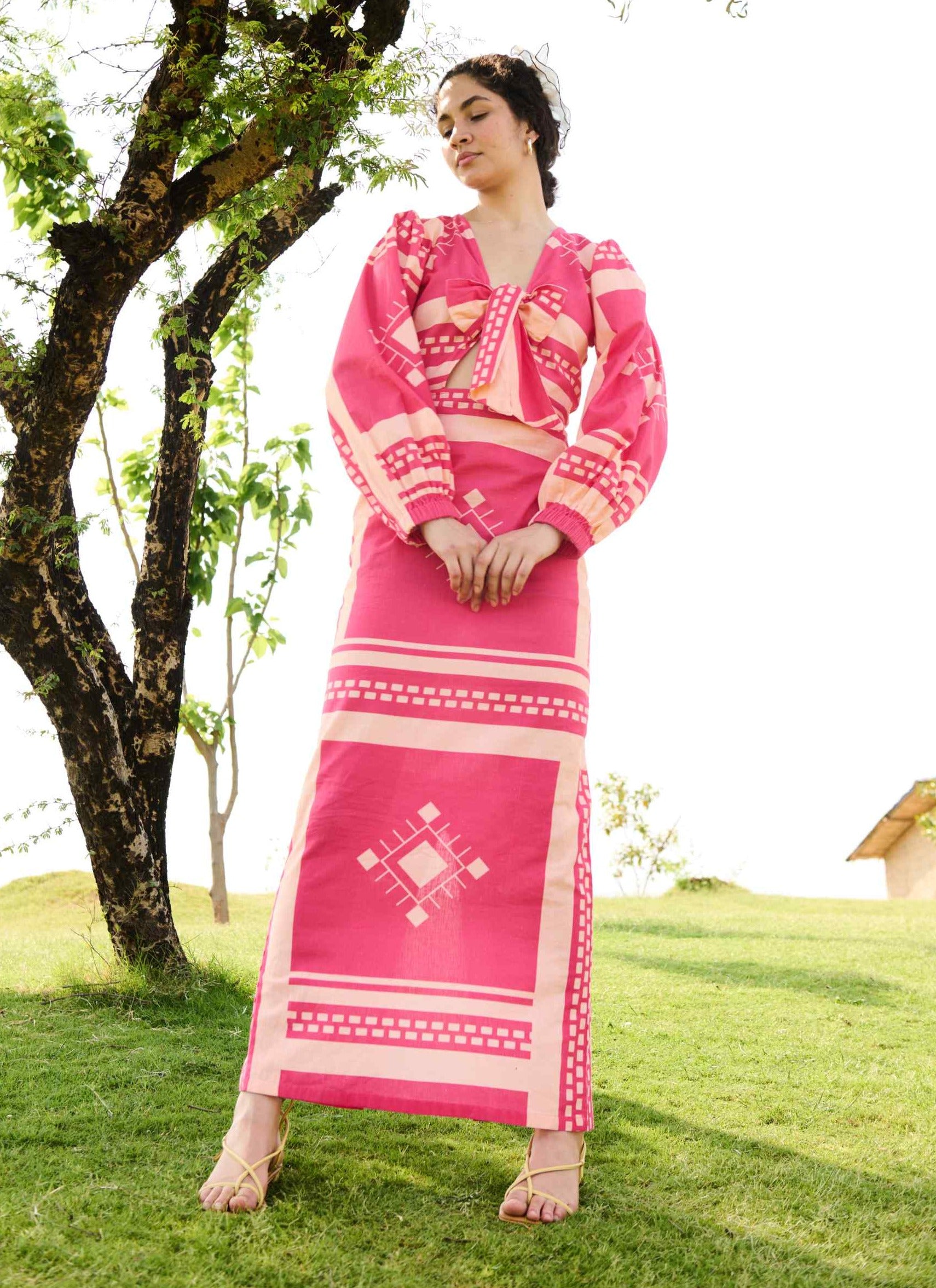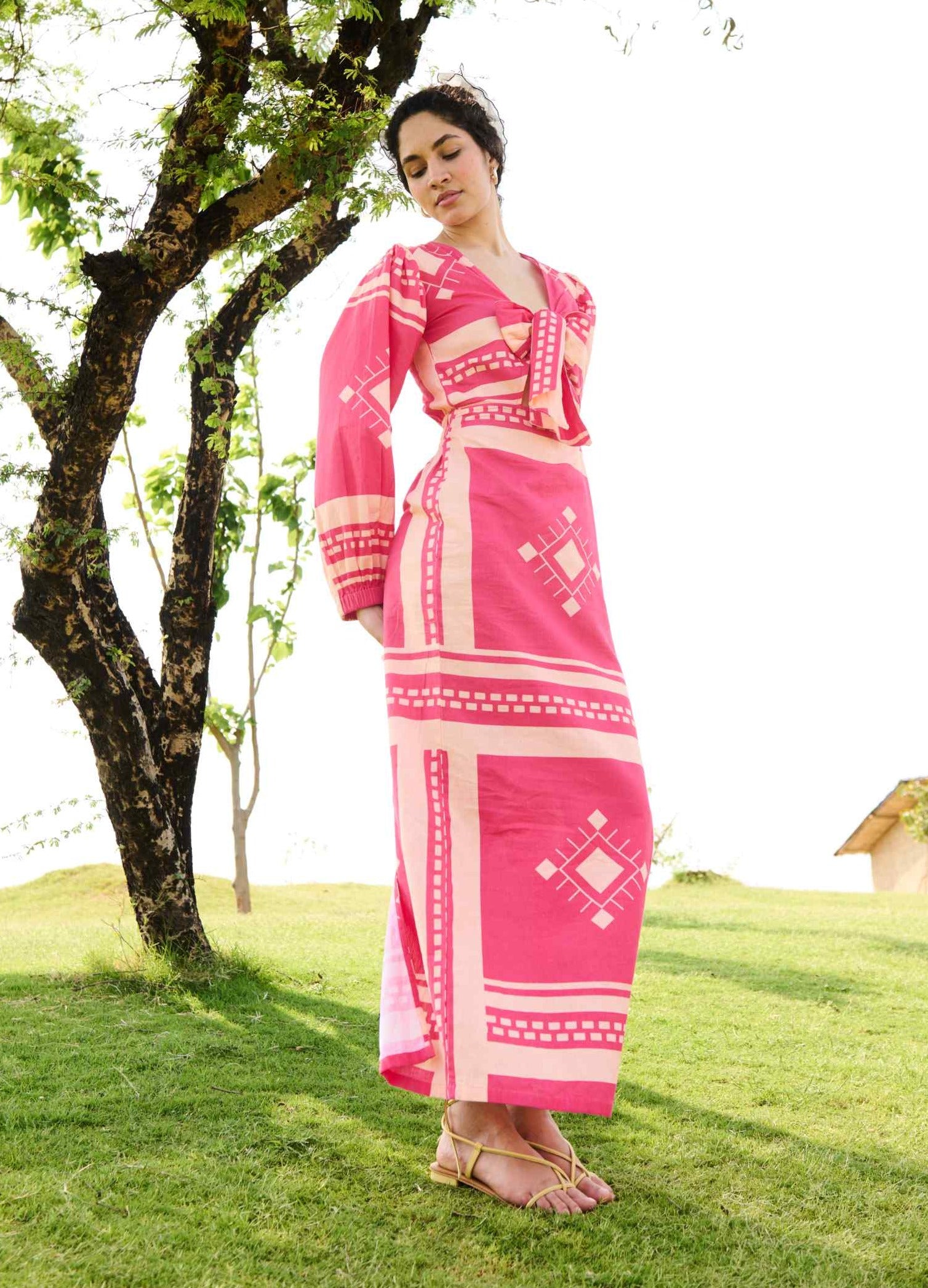 Step into refined style with the Dahlia Dress, crafted from our luxurious linen-cotton blend. This bodycon dress features a flattering knot detail at the high waist and a stylish back slit, all in our exclusive pink matches print. Perfect for both sophisticated events and fashionable outings, the Dahlia Dress combines contemporary design with the breathable comfort of linen-cotton, offering a chic and elegant look.