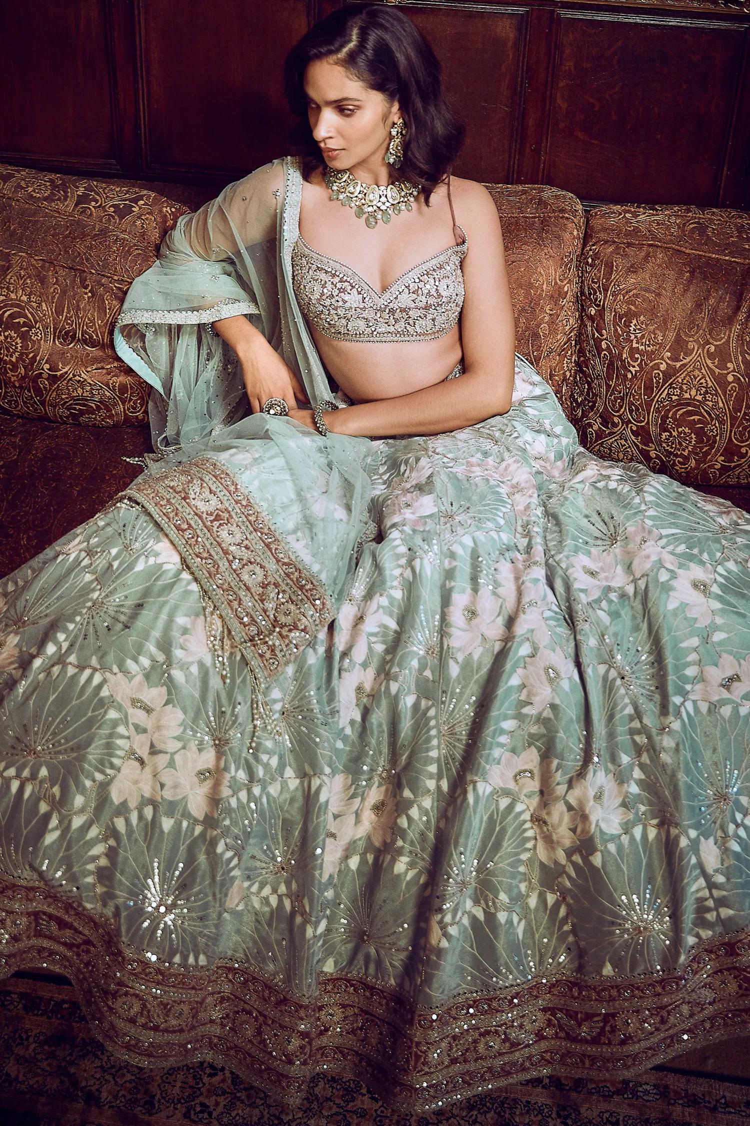 A poetic tribute to grace and fluidity, the Pink MatsyaÕs Water Lilies Lost in Time Lehenga is inspired by the serene beauty of floating blooms and the rhythm of nature. Delicate handcrafted embroidery mirrors the gentle sway of water lilies, while soft pink hues evoke a sense of timeless romance. The intricate detailing and flowing silhouette create an ethereal charm, making it a perfect choice for weddings, regal celebrations, and grand soirŽes. Designed for the modern muse who finds beauty in nature and heritage, this lehenga is a tale of elegance, tranquility, and artistry suspended in time.