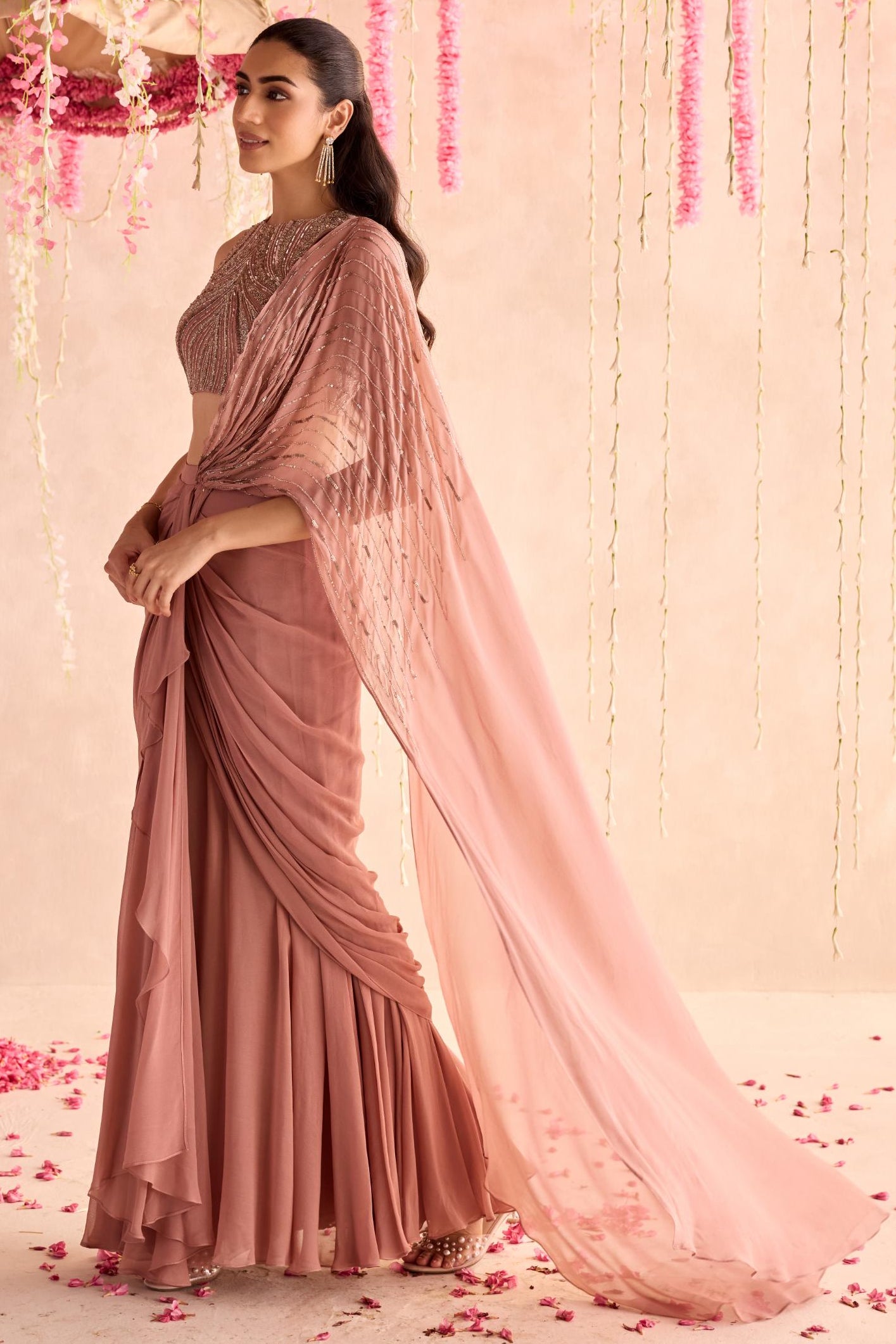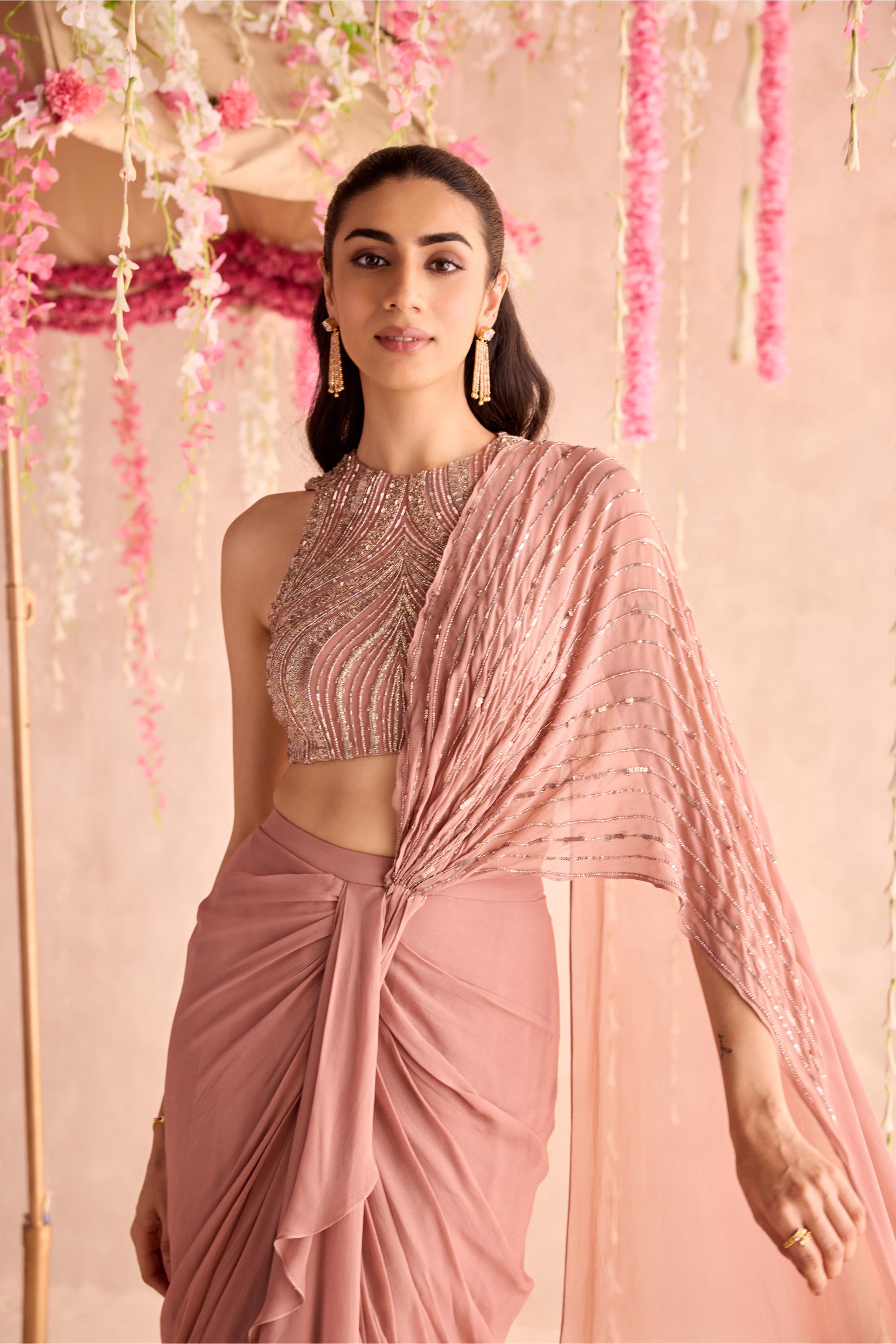The Pink Nargis Under Bloom Concept Saree is a poetic fusion of tradition and modern elegance, inspired by the delicate beauty of the nargis flower. Rendered in a soft pink hue, this concept saree features fluid draping with a pre-stitched silhouette that ensures effortless wear. Subtle floral accents and a thoughtfully designed pallu add a romantic touch, making it perfect for contemporary celebrations or intimate gatherings. Lightweight and graceful, it captures the essence of blooming femininity with every fold. An ideal choice for those who seek timeless charm with a modern twist.